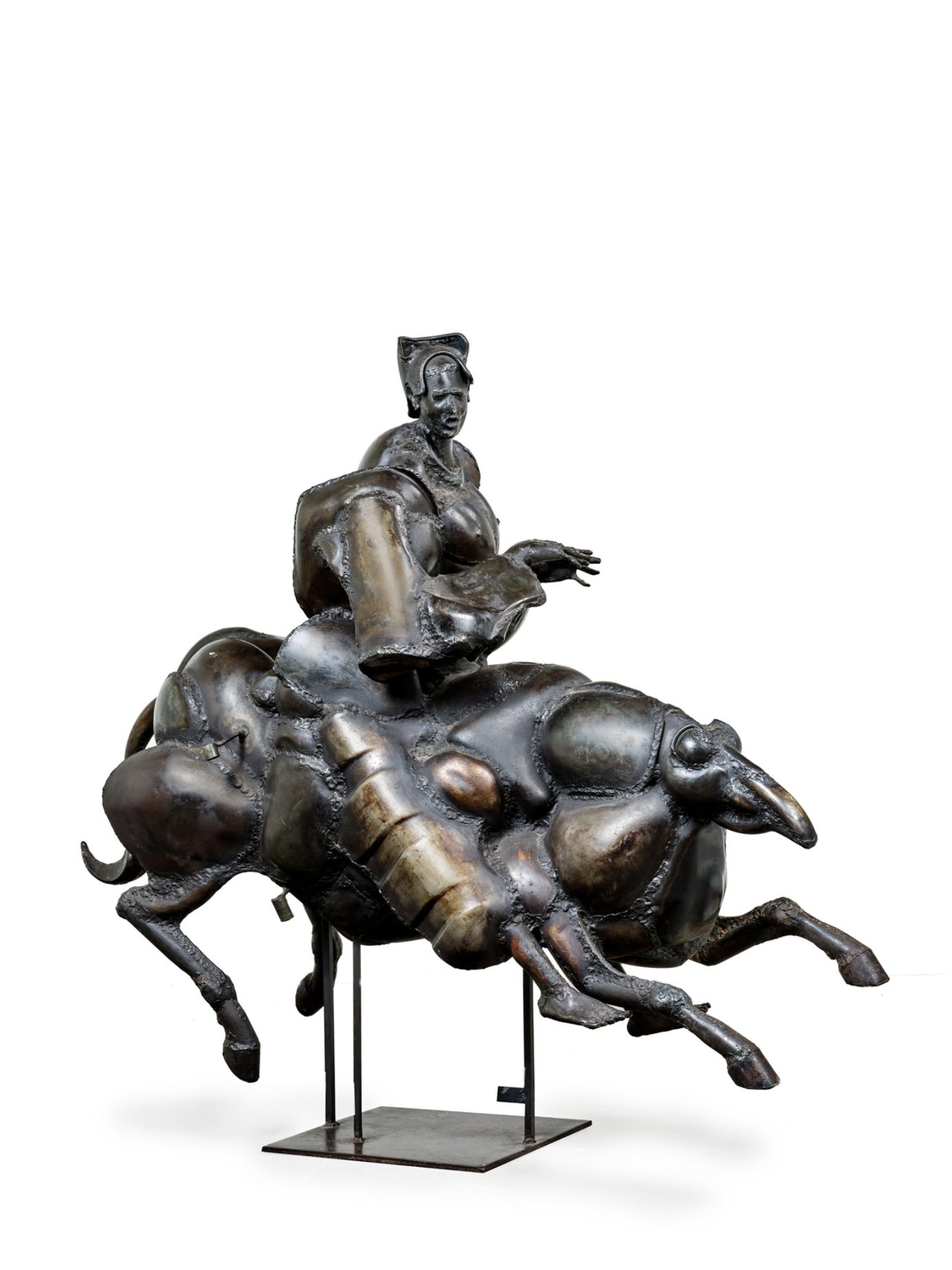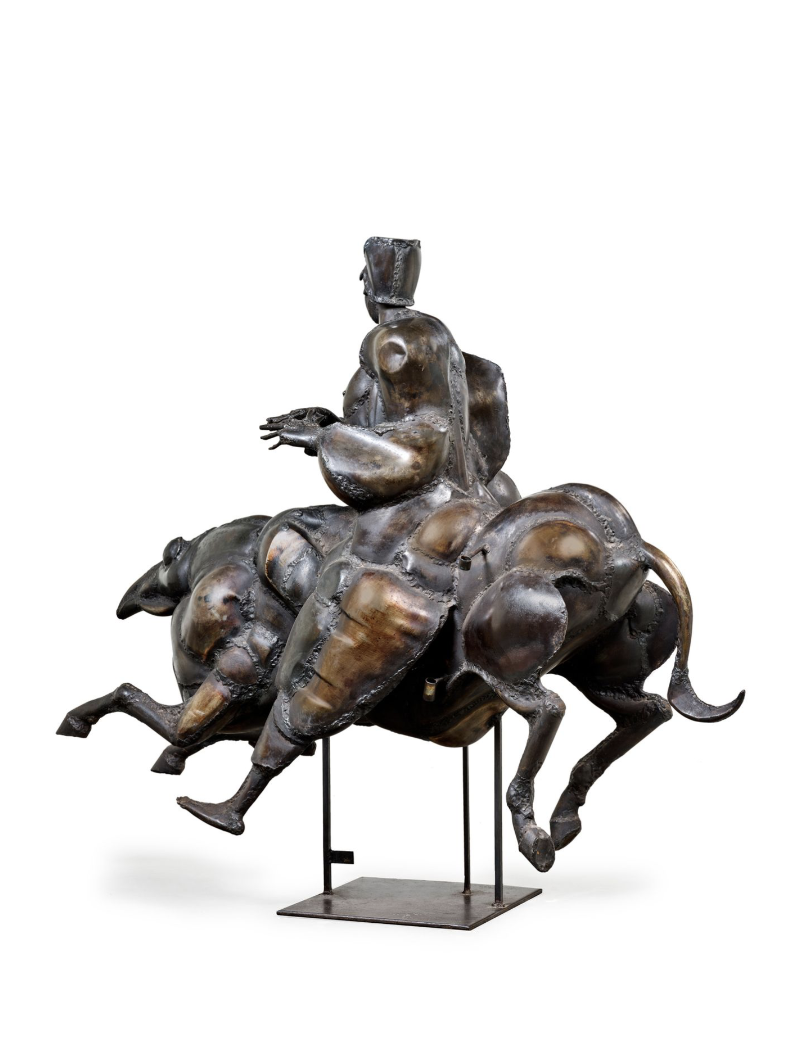 Imposing welded copper sculpture, likely created by an artistic ironworker, depicting a warrior perched on a fantastical mount. The figure, dressed in a costume reminiscent of traditional garb or armor, adopts a majestic and authoritative posture.