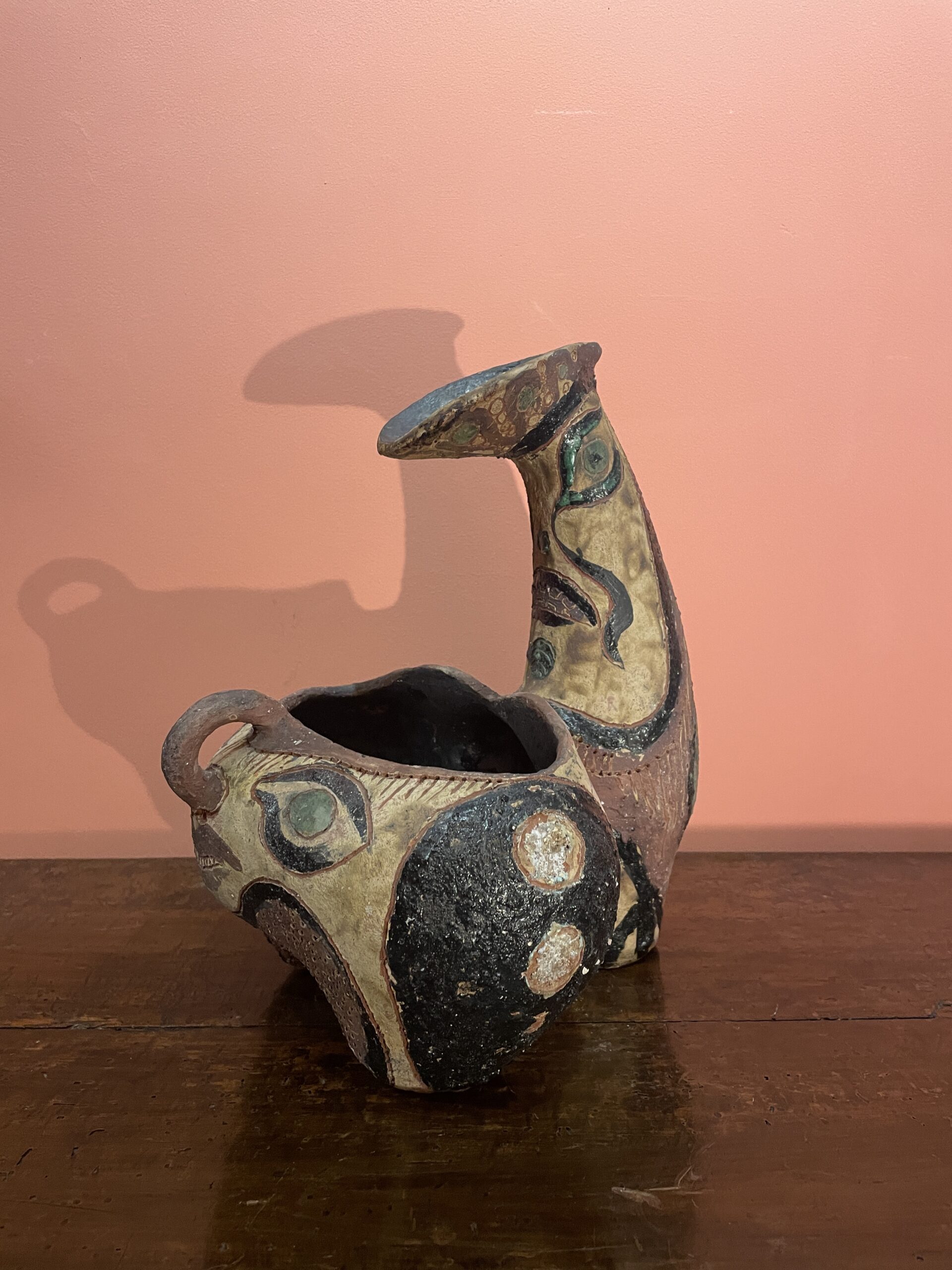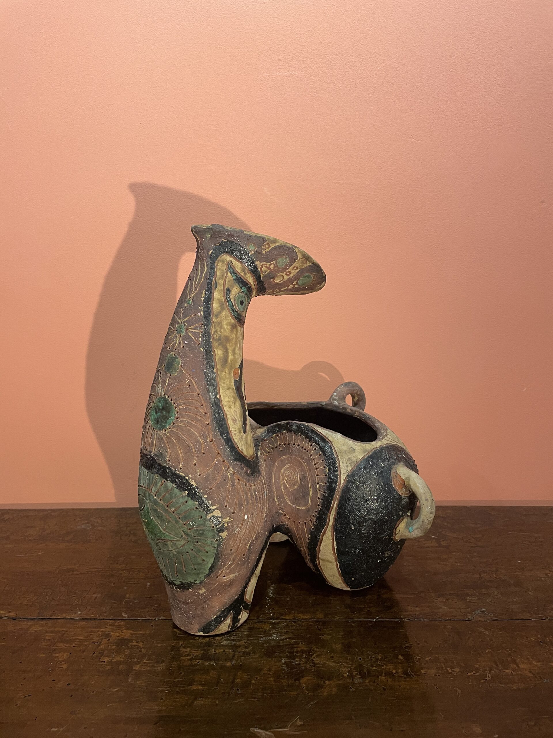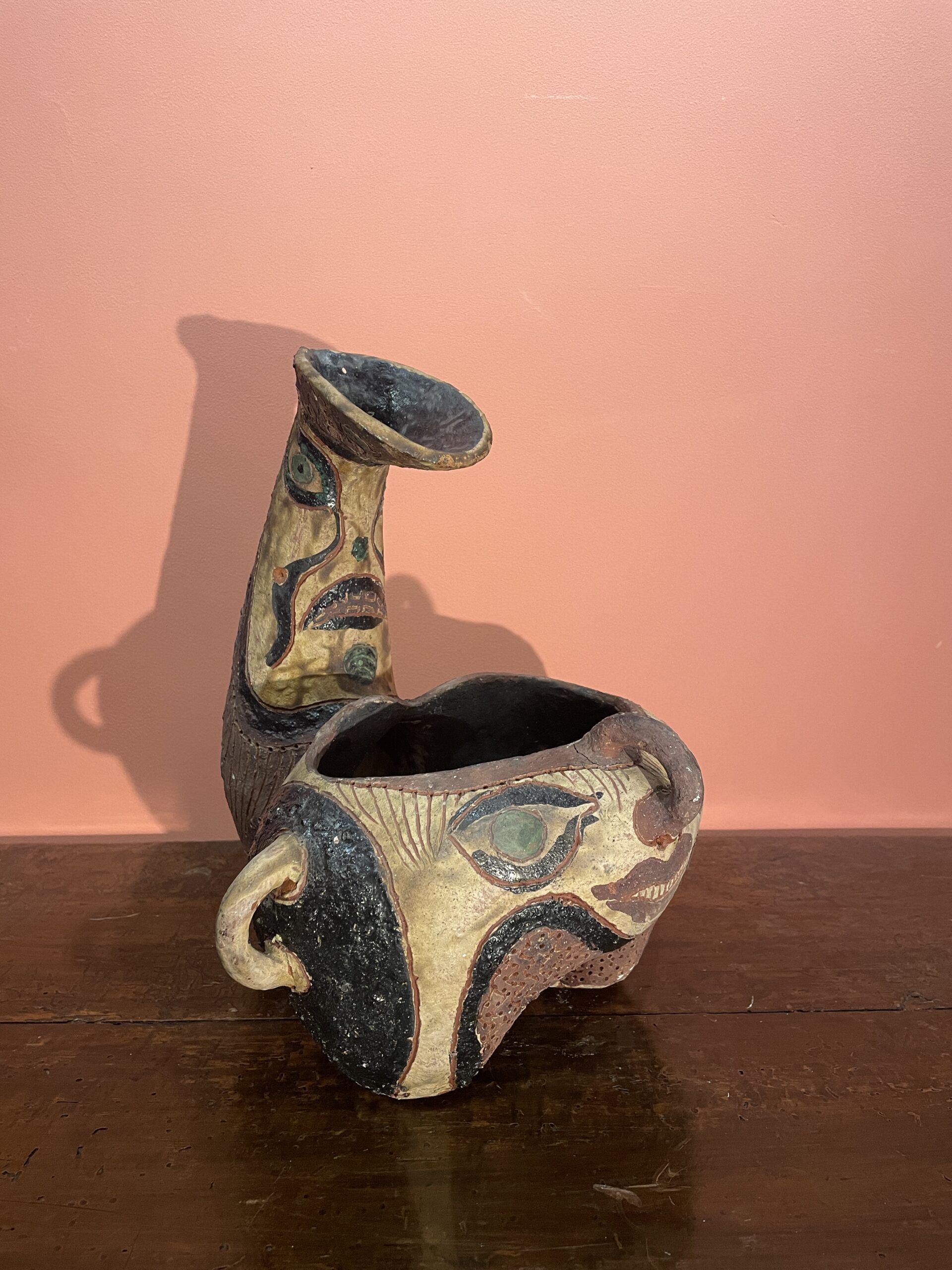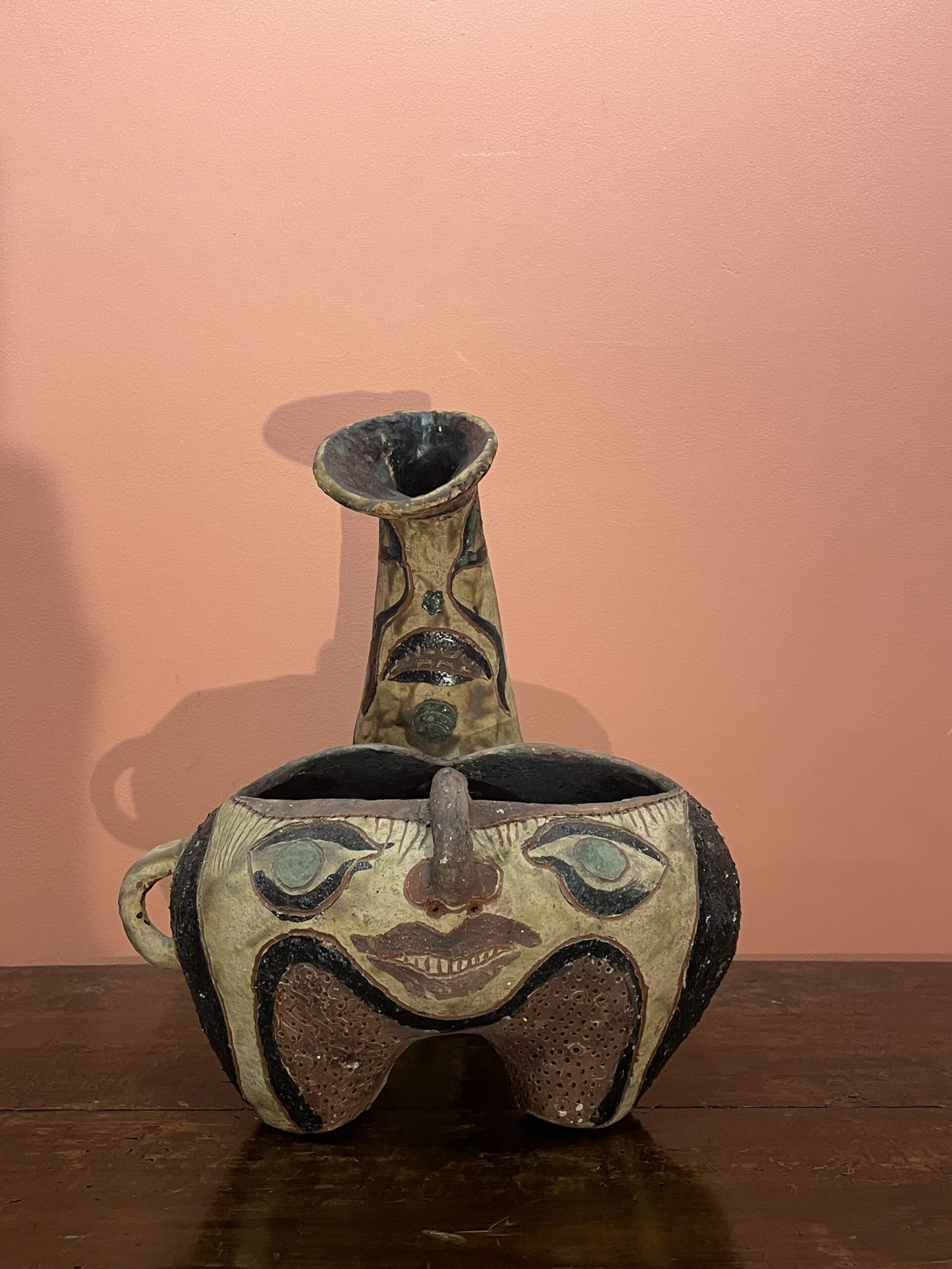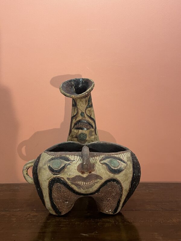 Zoomorphic tripod vase in incised ceramic, hallmarked and painted, decorated with masks