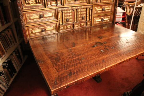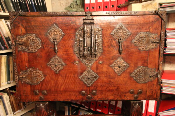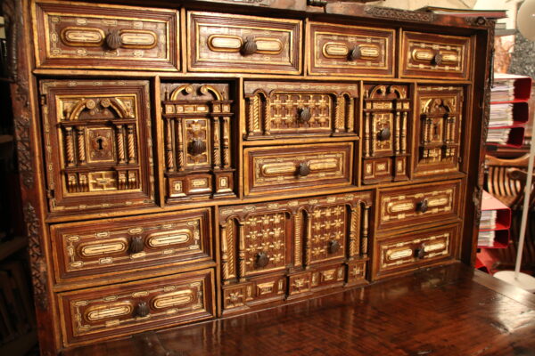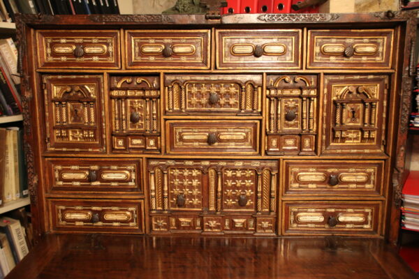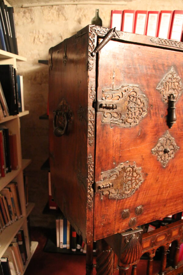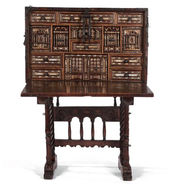 The bargueno is one of the major contribution from Spain to European furniture. Elegant cabinet adopting the structure of a chest mounted here on its original stand. Also called Vargueno from the city of Varga, near Toledo, which was the main production centre. The bargueno was the conquistadore and missionary’s favourite item of furniture to carry his administrative, diplomatic or personal belongings to the New World.