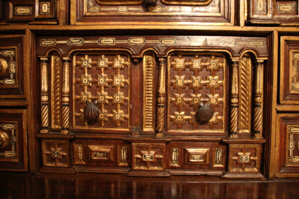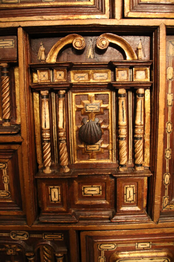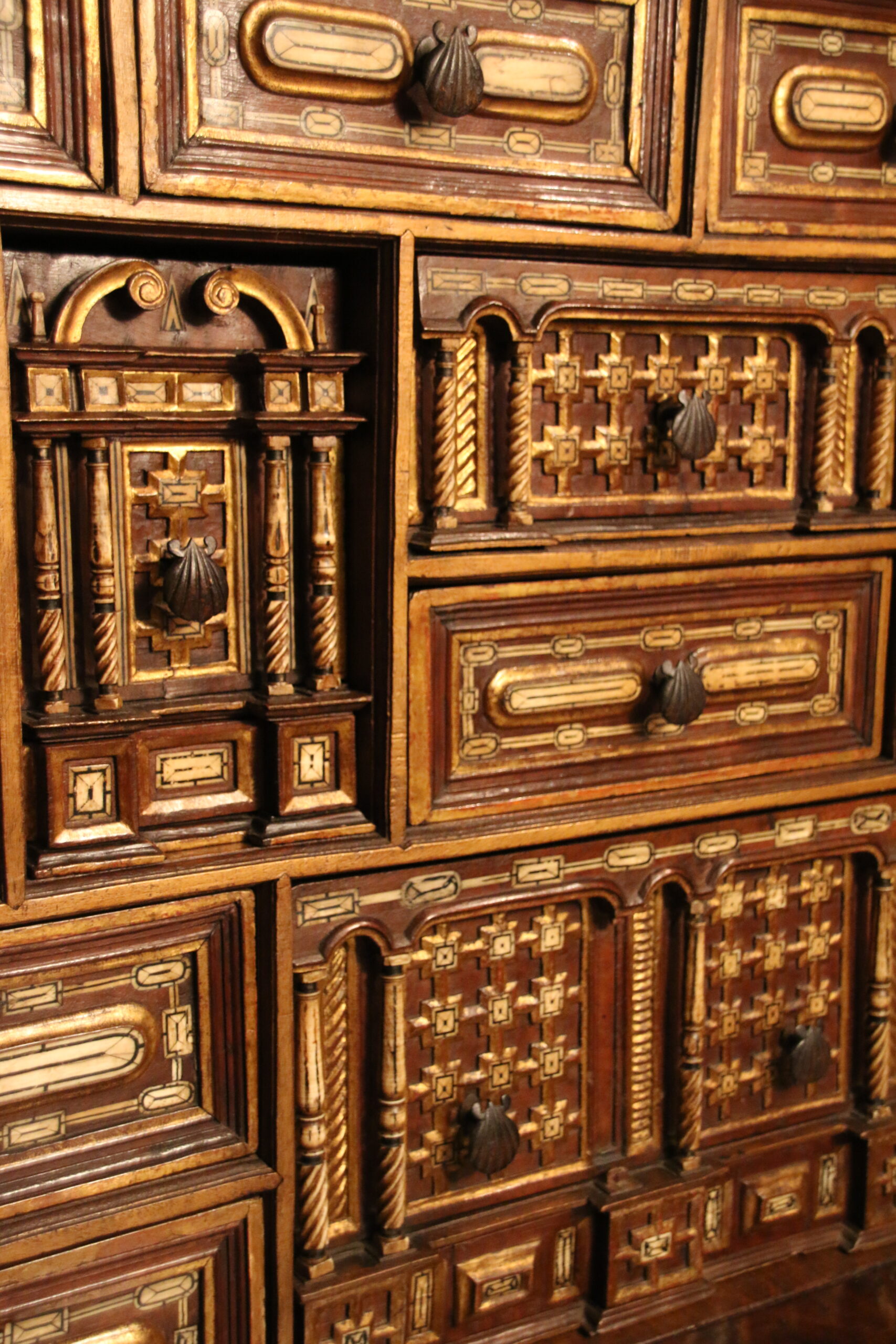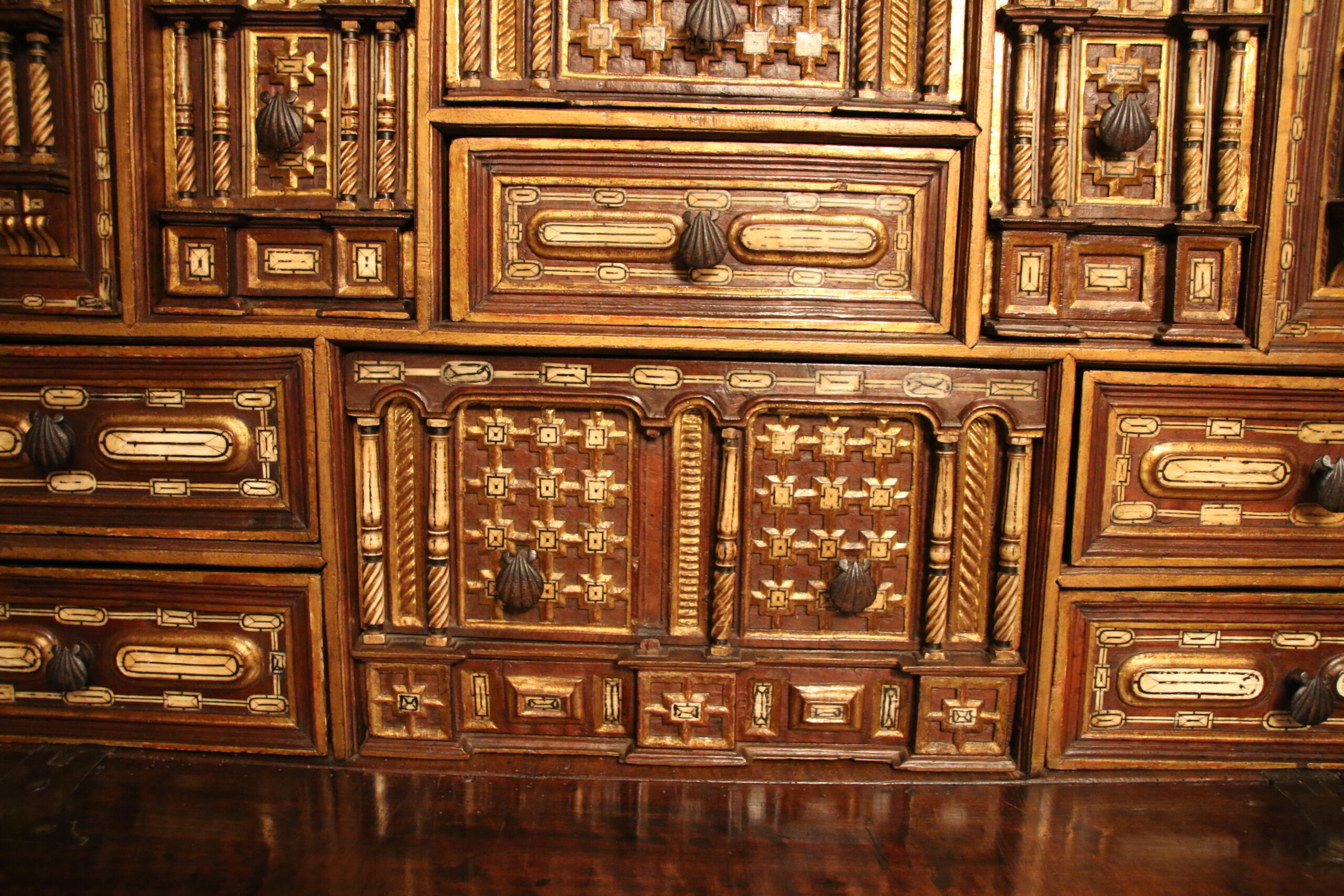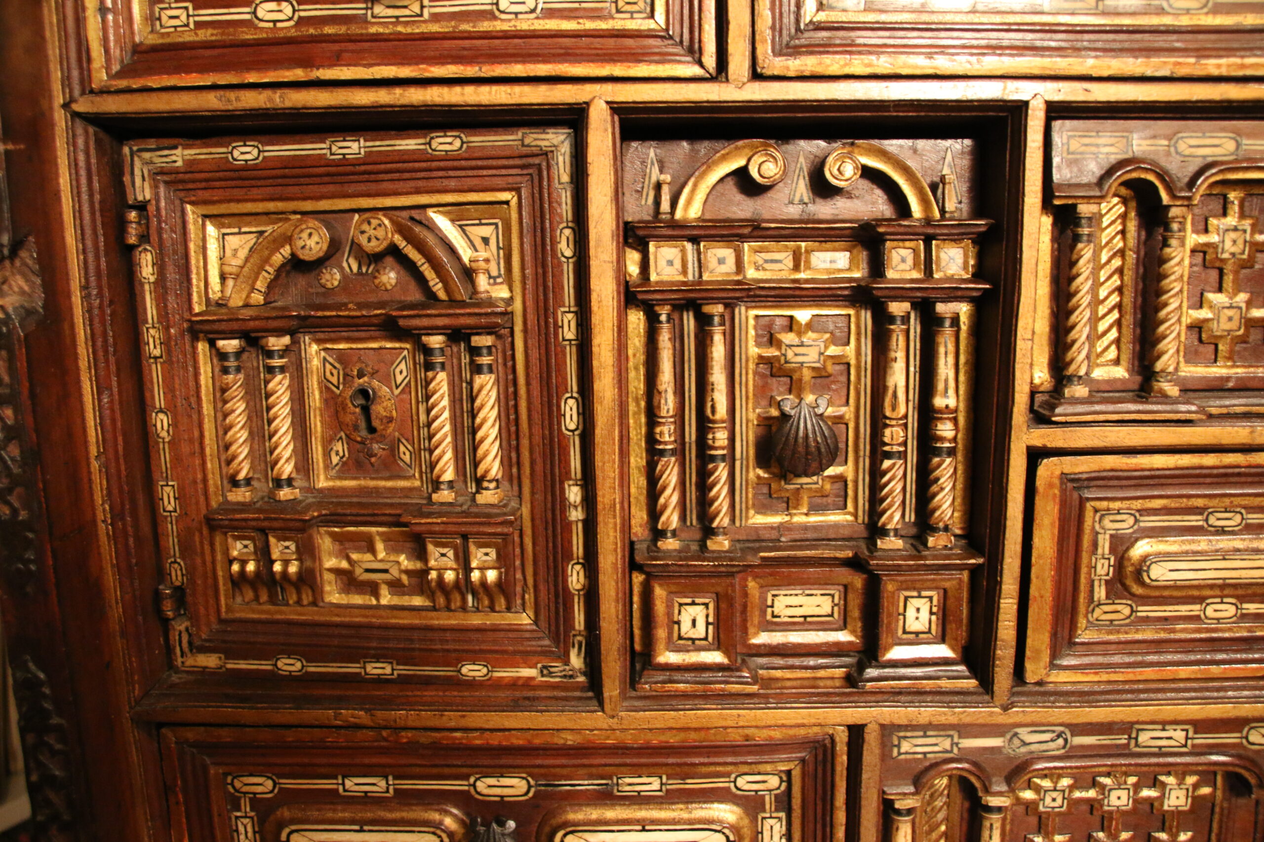 The drawers present a geometric bone inlaid decor while the door-leaves uses the architectural vocabulary with pointed arch scrolls and four bone twisted columns framing the padlock.