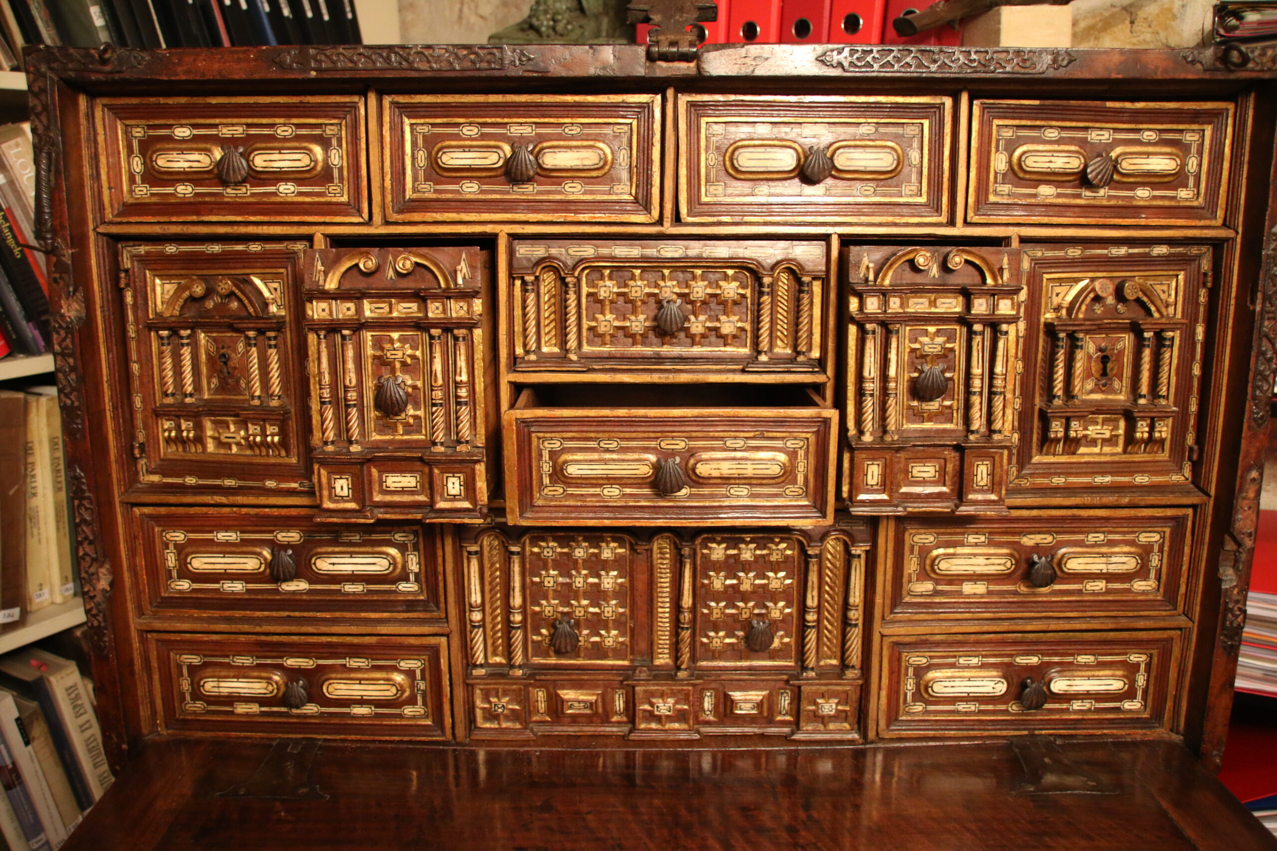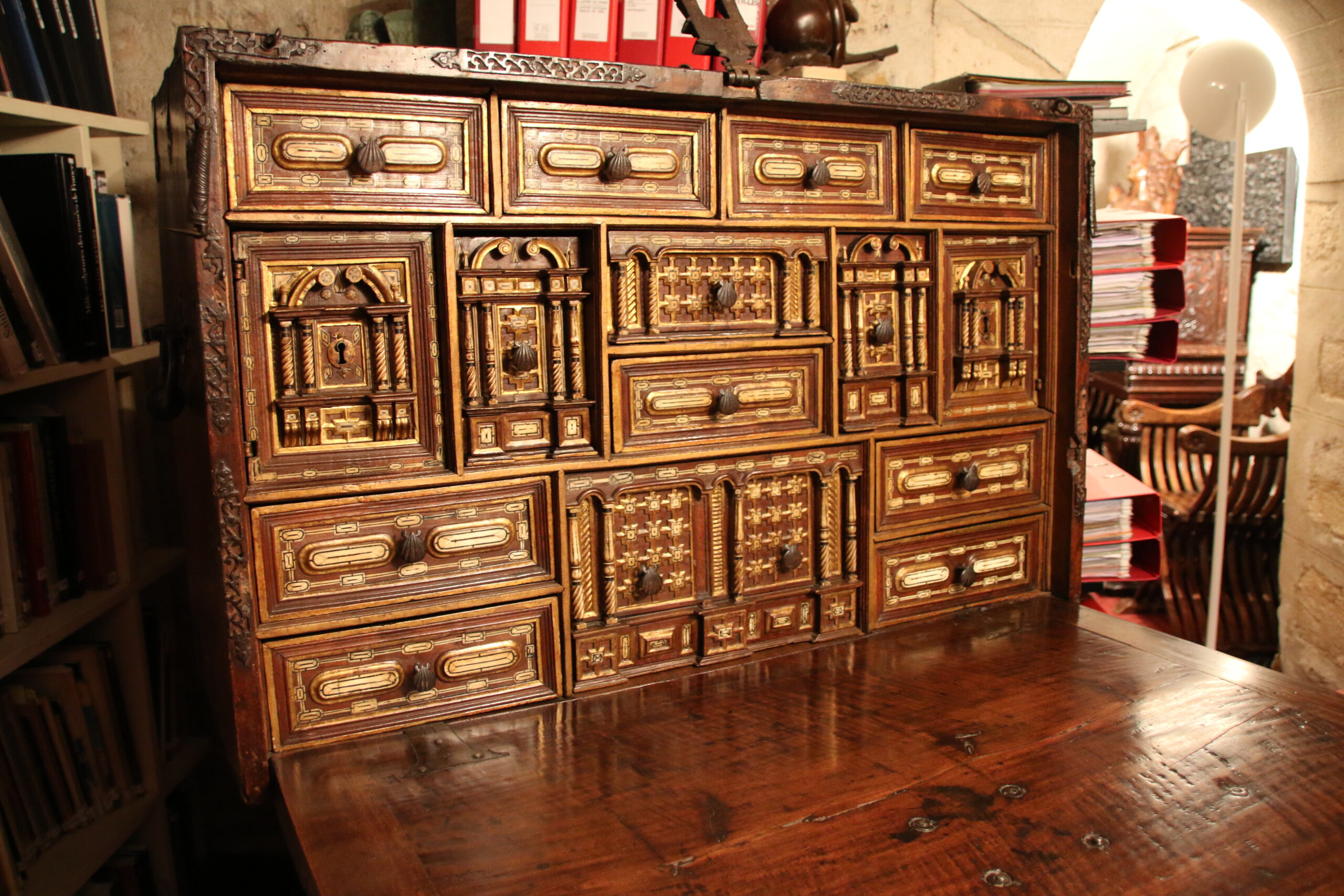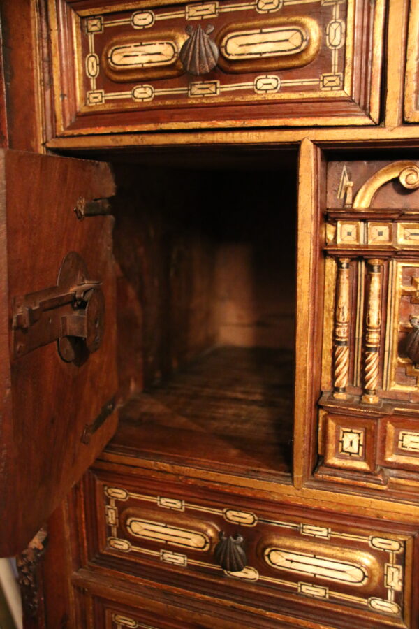 This cabinet, nowadays very rare, is a piece of furniture typically Spanish and has never been developped in any other country. Item of great value the bargueno was both a luxury piece exposed in state rooms and a functional travel chest as expressed by the handles and impressive lock.