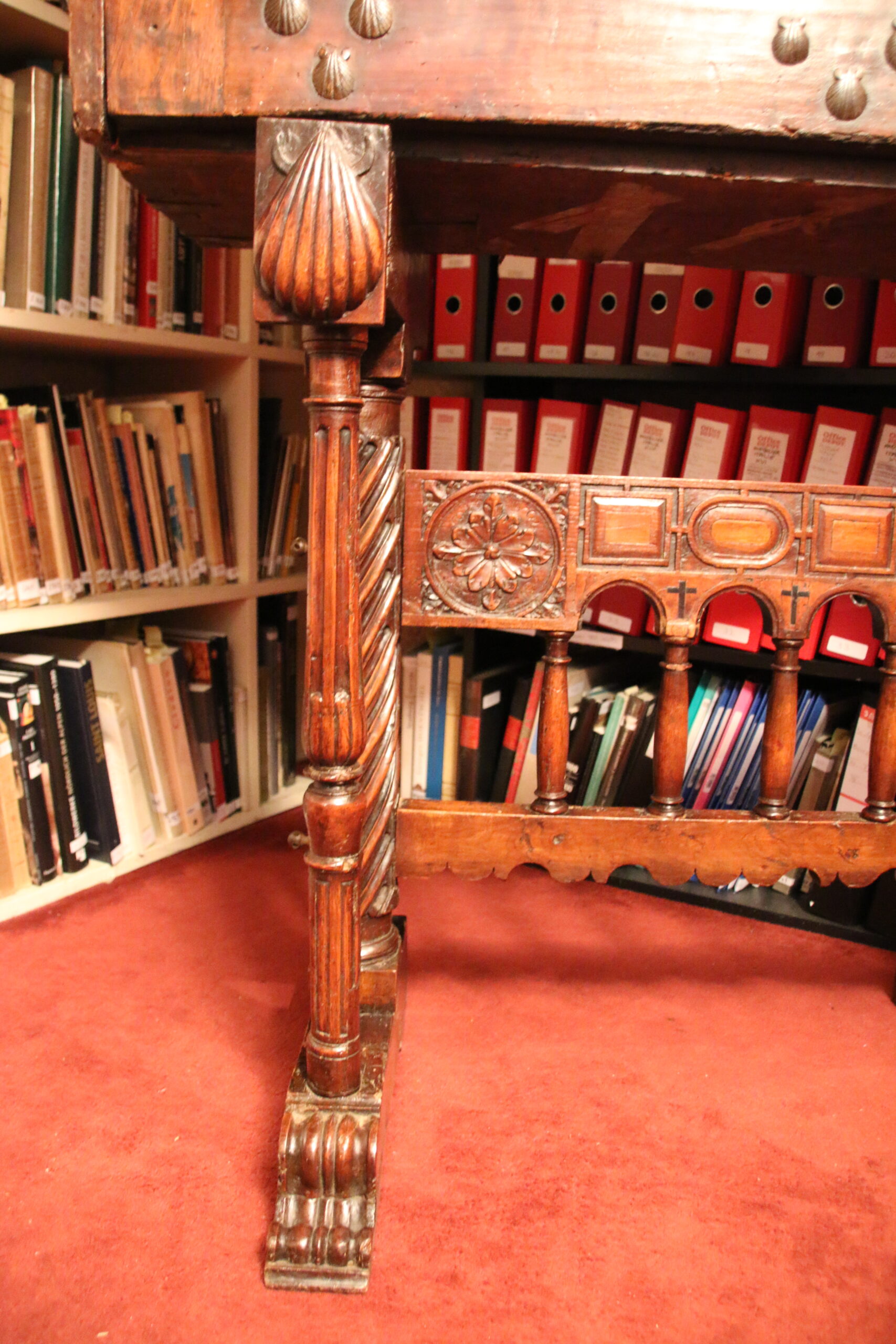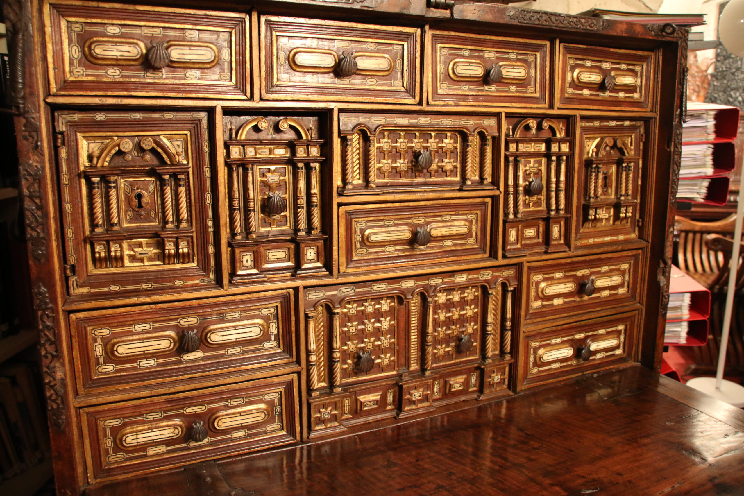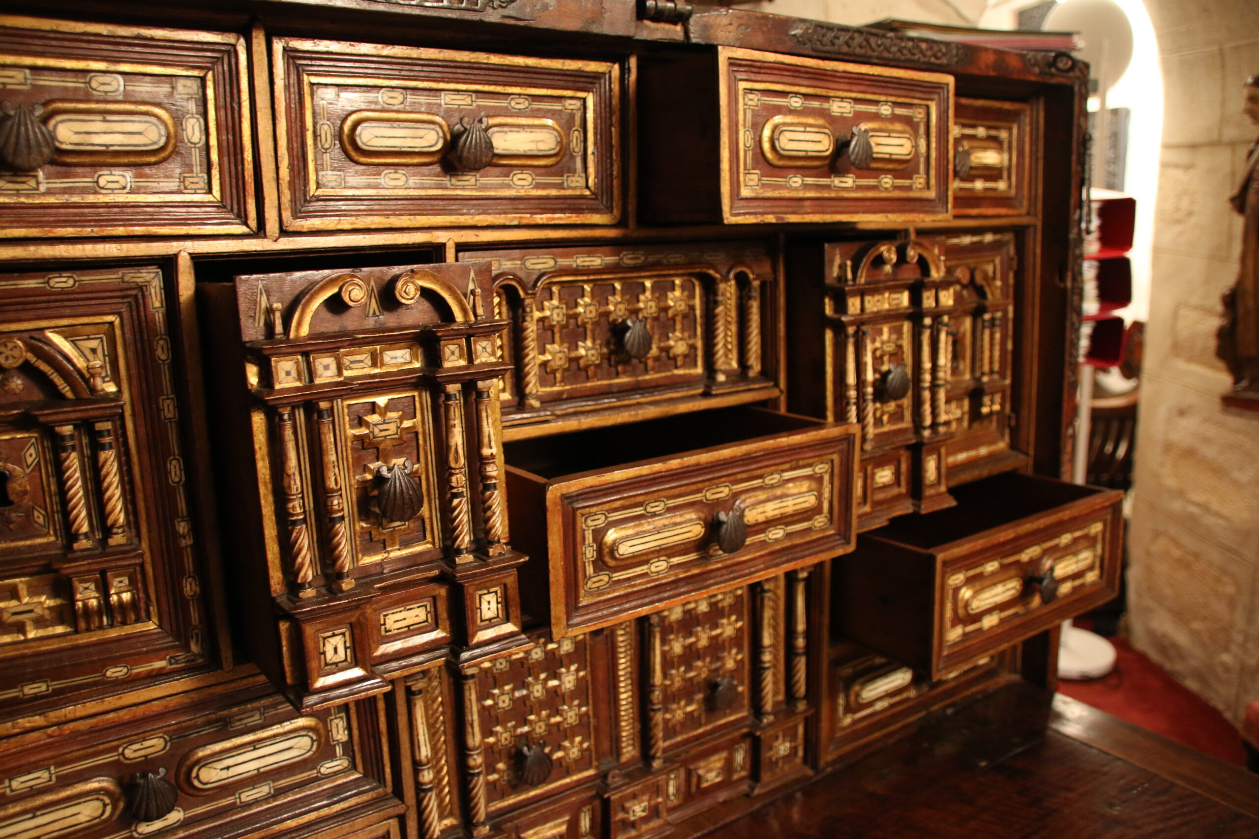 The upper register presents four drawers. The knobs are shaped as scallops evoking the movable chests used by pilgrims en route to Santiago de Compostella.
