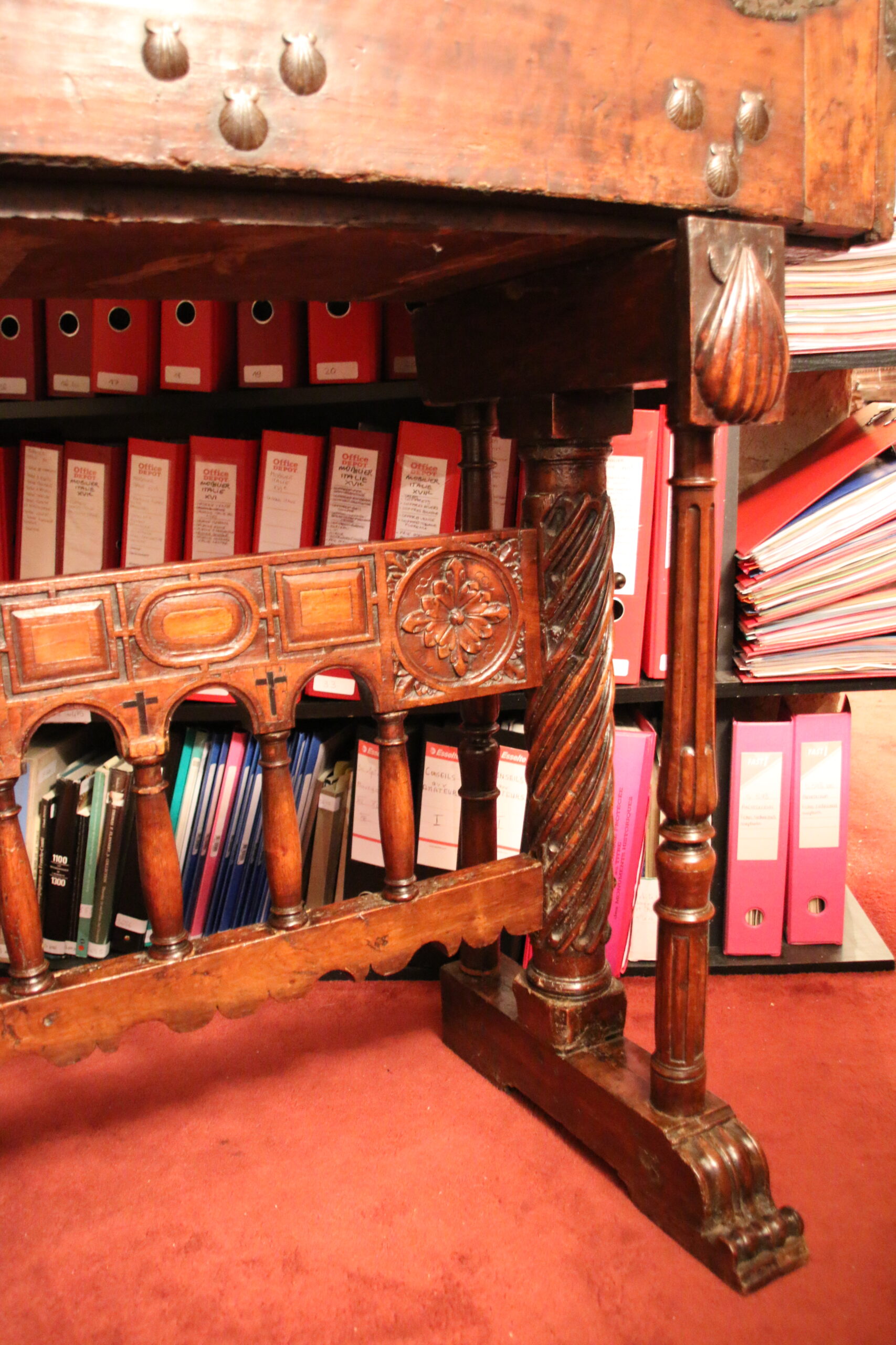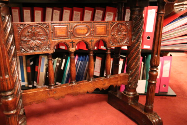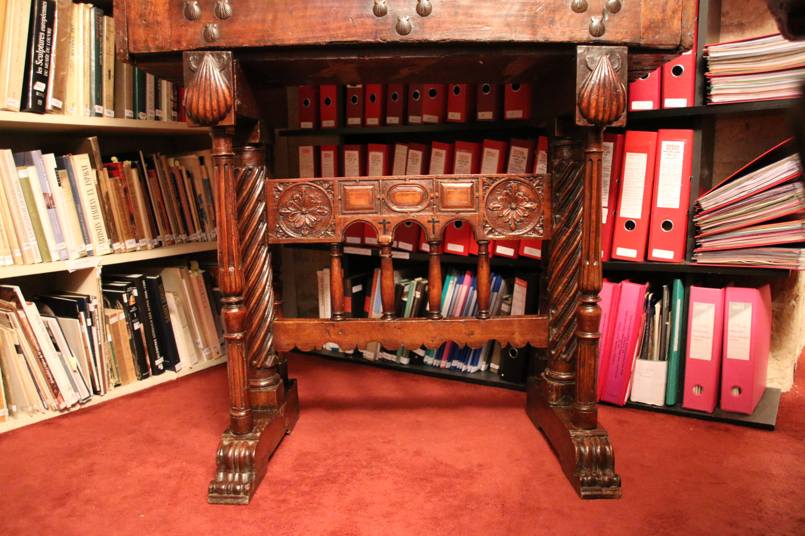 The walnut H-shaped base stands on scroll feet. Four fluted balustre columns frame a double twisted column. An arched spacer with a geometric and vegetal decor links both legs.