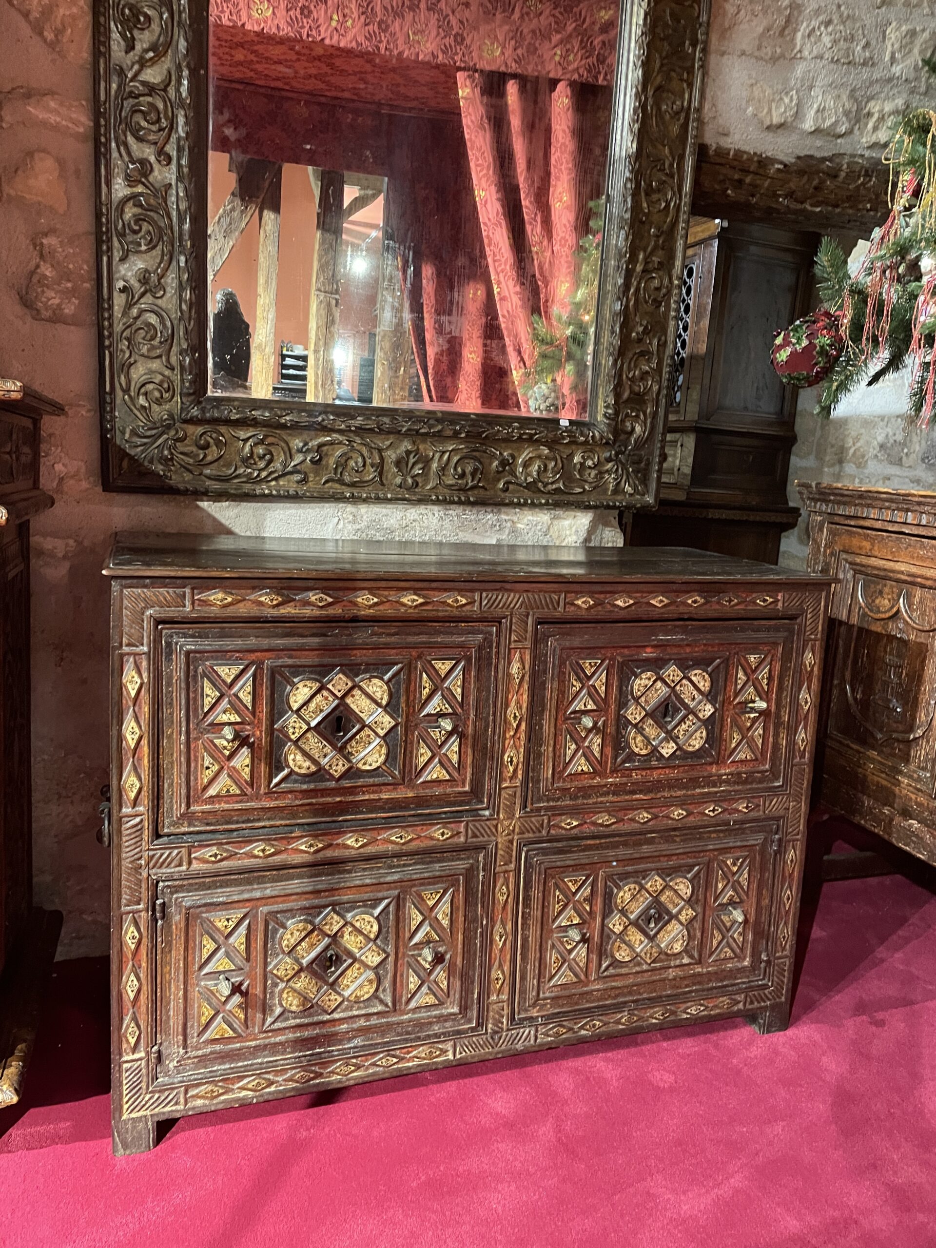 The uprights and side posts of the chest are highlighted by friezes with diamond patterns embellished with painted floral motifs. A guilloche design decorates the corners.