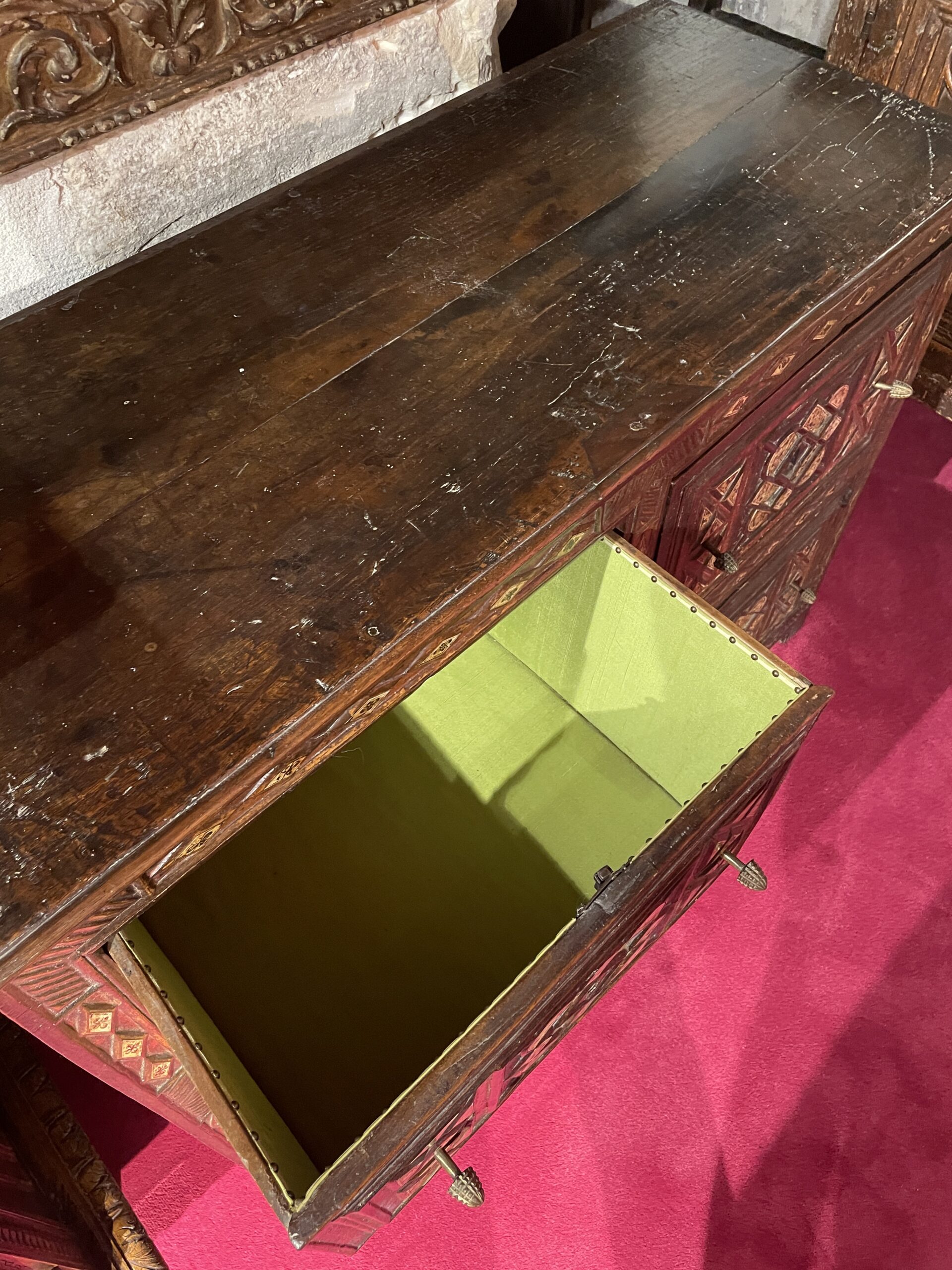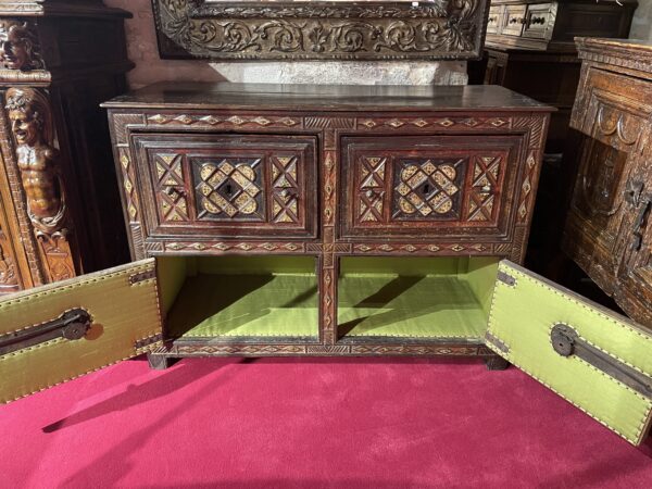 This beautiful, richly adorned Taquillón features two lower doors and two upper drawers. Its decorative elements play with the contrast of shadow and light, thanks to the sculpted and molded reliefs.