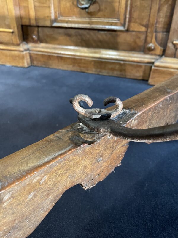 Two iron crosspieces, straight and ringed in their center, connect them to the back of the board.