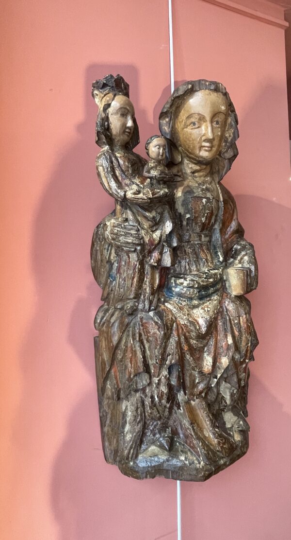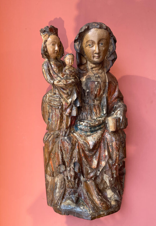 This very beautiful polychrome sculpture represents Saint Anna trinitarian. Depicted as a young woman, Saint Anne, adorned with a flowing veil, holds the crowned Virgin Mary, portrayed as a child, and the infant Jesus in her right arm. Thus, three generations are united. She holds the Holy Book in her left hand, while Jesus, with his eyes lowered, reads his small open book.