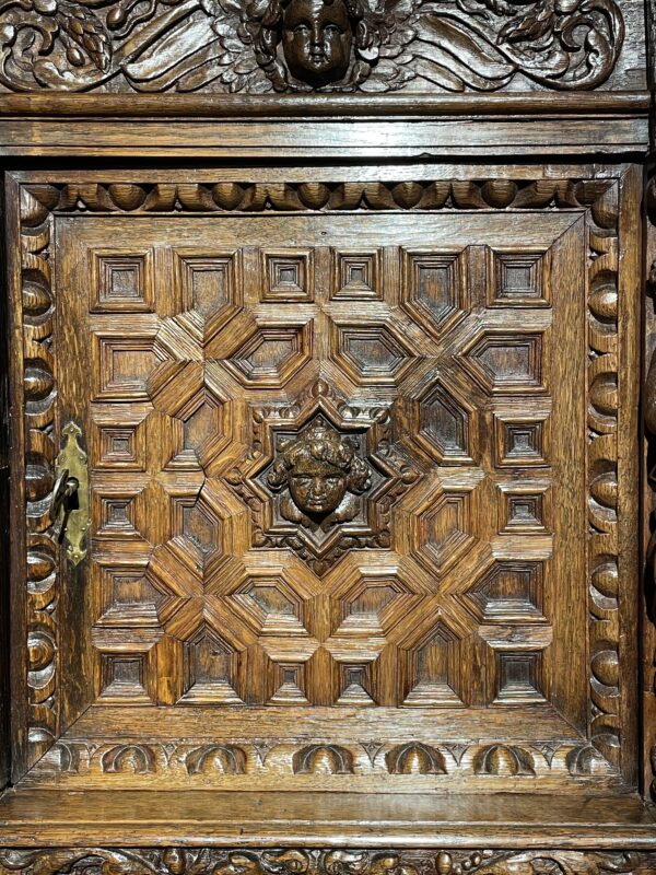 Carved with remarkable vigor, this Ribbank Cabinet showcases two recurring themes in Flemish furniture: Putti riding volutes and the intricate yet commanding geometric network of paneled sections.