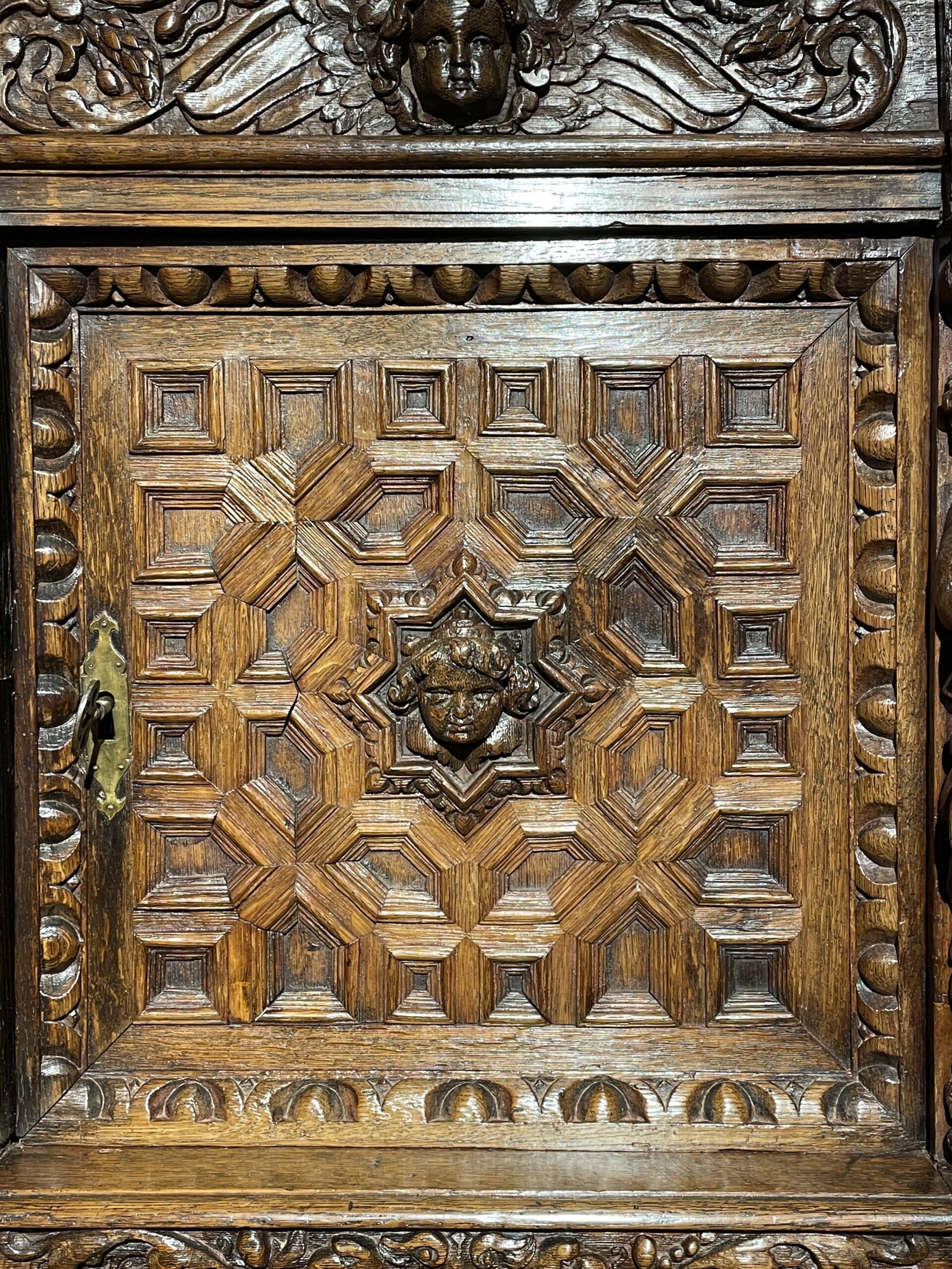 This distinct geometric design, present on both sections of the cabinet, evokes interior architectural motifs, drawing inspiration from the parquet flooring and ceilings of the affluent Flemish bourgeoisie’s apartments.