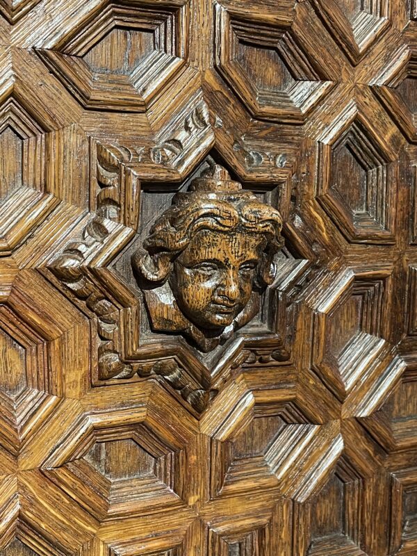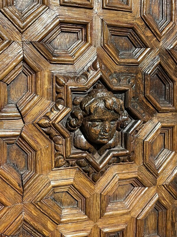 The three doors, framed by an ovolo molding, are each adorned with a high-relief cherub centered within a star motif, which expands into a geometric pattern rendered in relief with molded panels, simulating the effect of perspective marquetry.