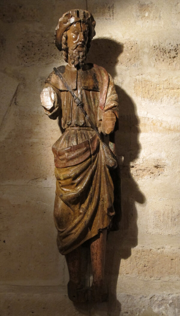 He wears a hat trimmed with two shells. He wears the usual baggage of the pilgrim, the pannetiere. His lively face, with a mustache and a beard with beautiful waves demonstrates the excellent mastery of the sculptor who made this work.