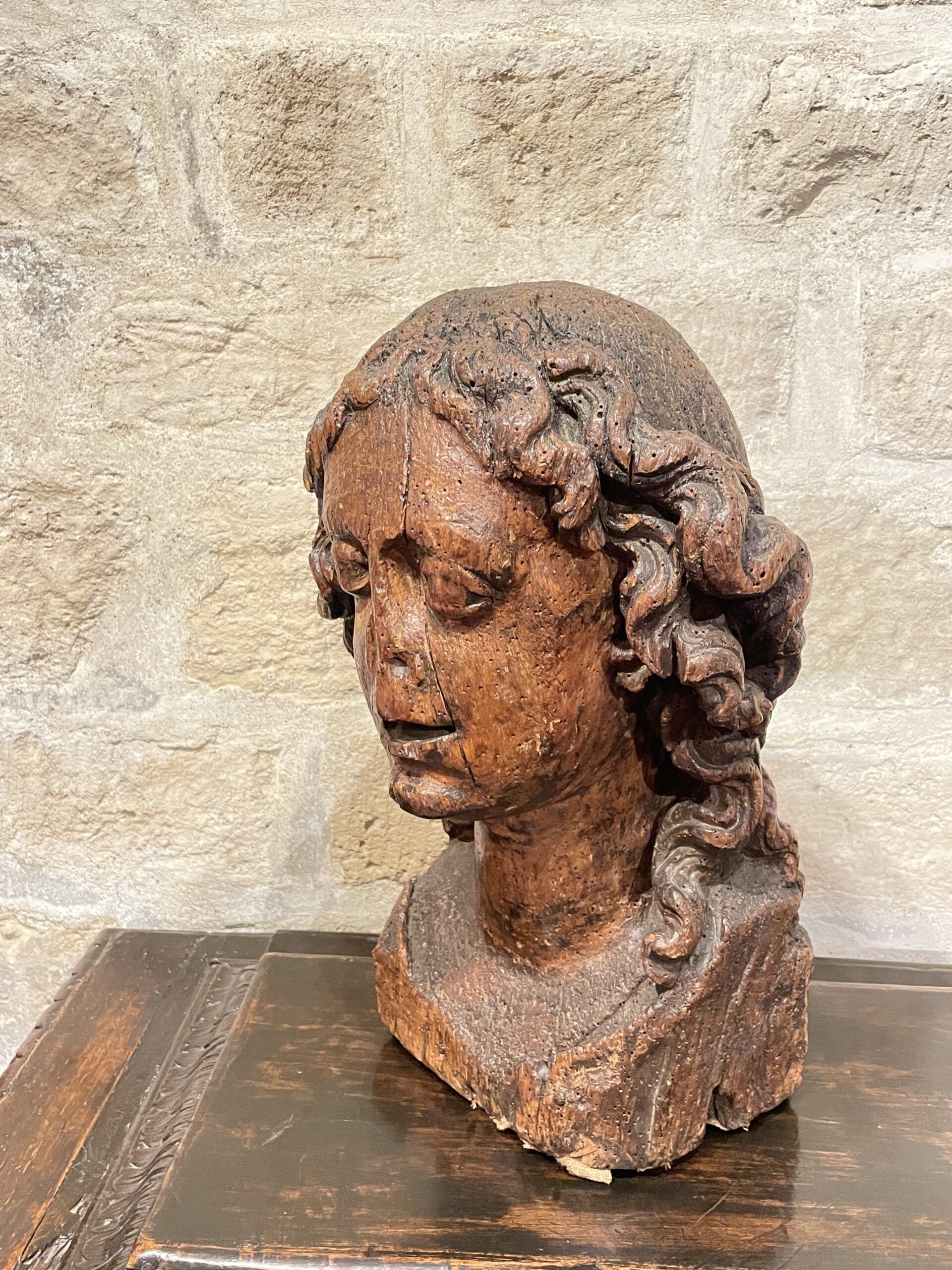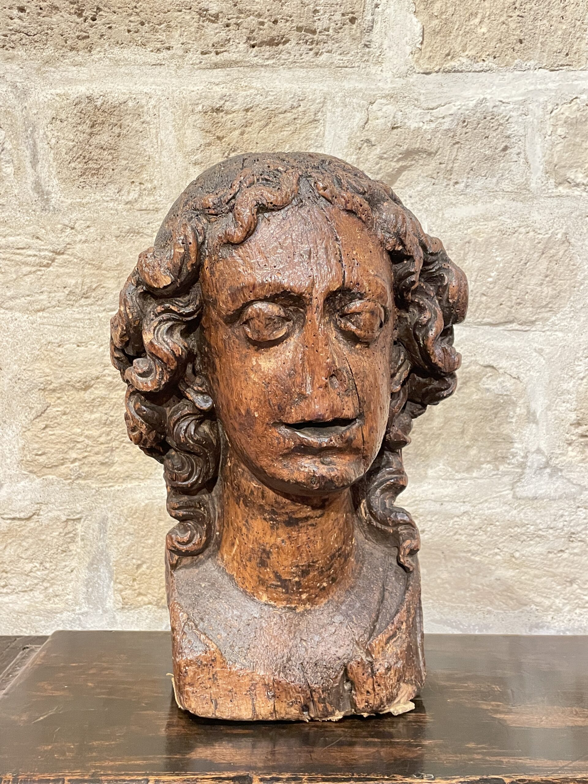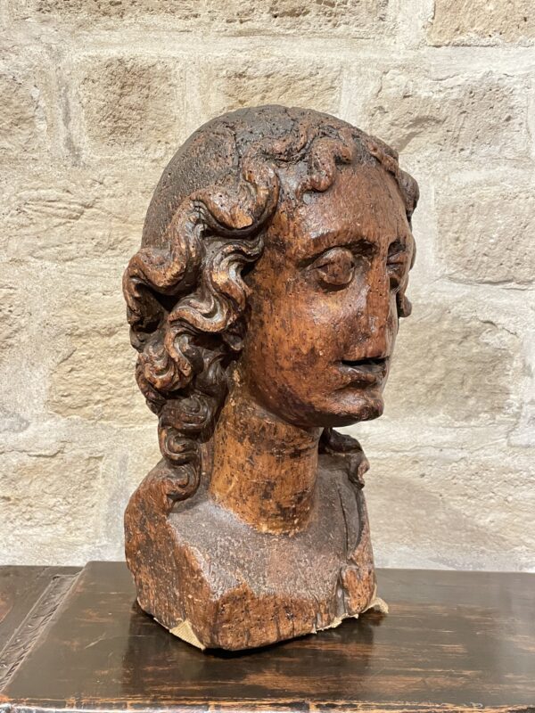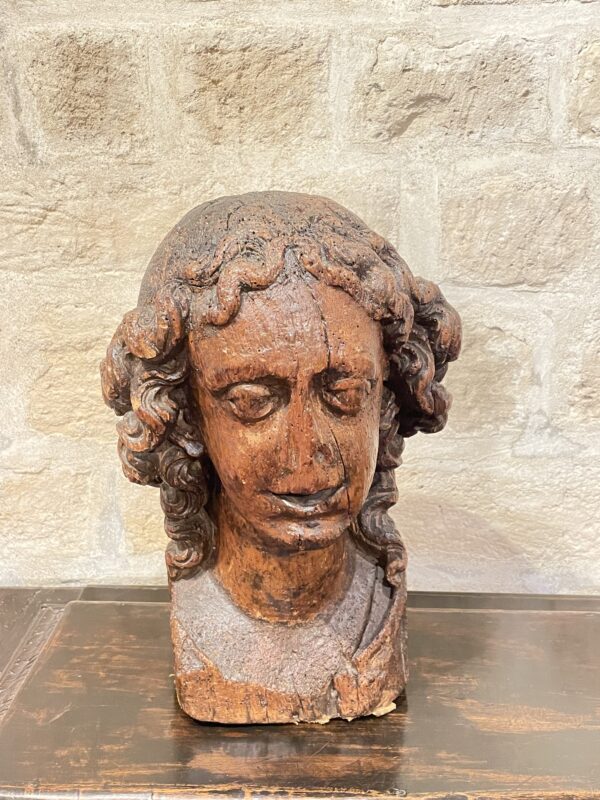 This face with prominent eyes, open mouth and beautiful hairs with symetrical undulations may be the face of the Archangel Gabriel.