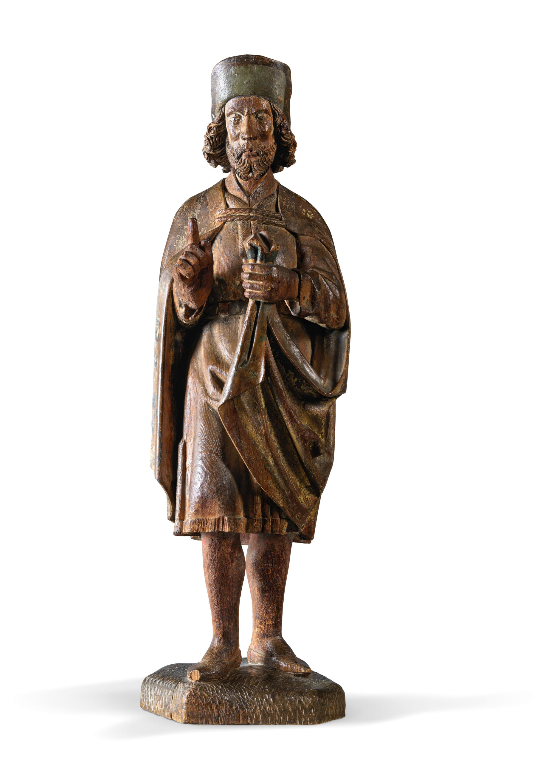 Our partially polychromed Saint is carved in the round. It is hollowed out in the back.