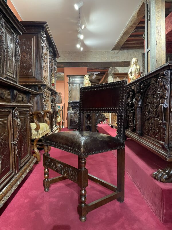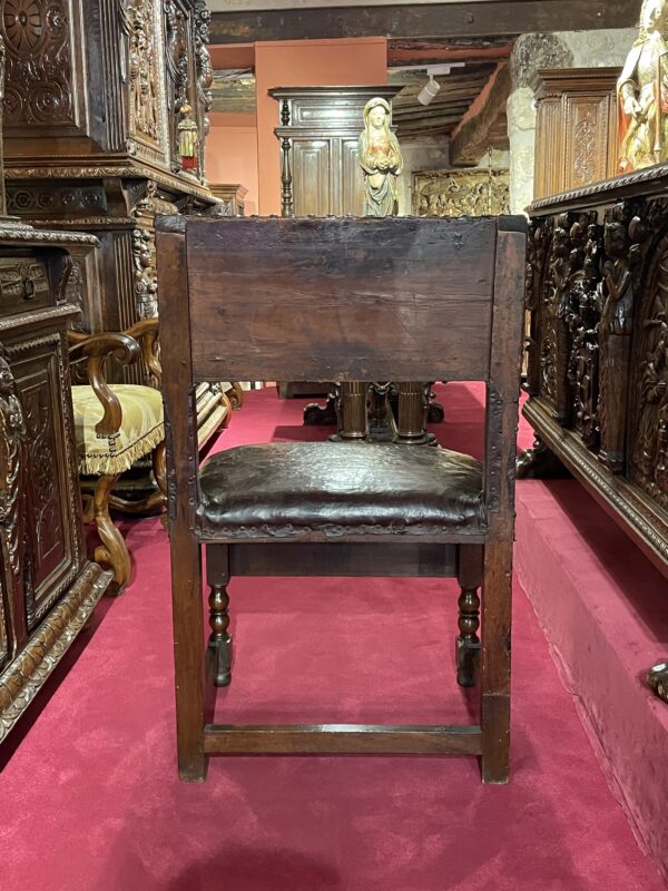 This elegant walnut chair features a traditional, still medieval structure, with its high seat and frame-like crossbar.