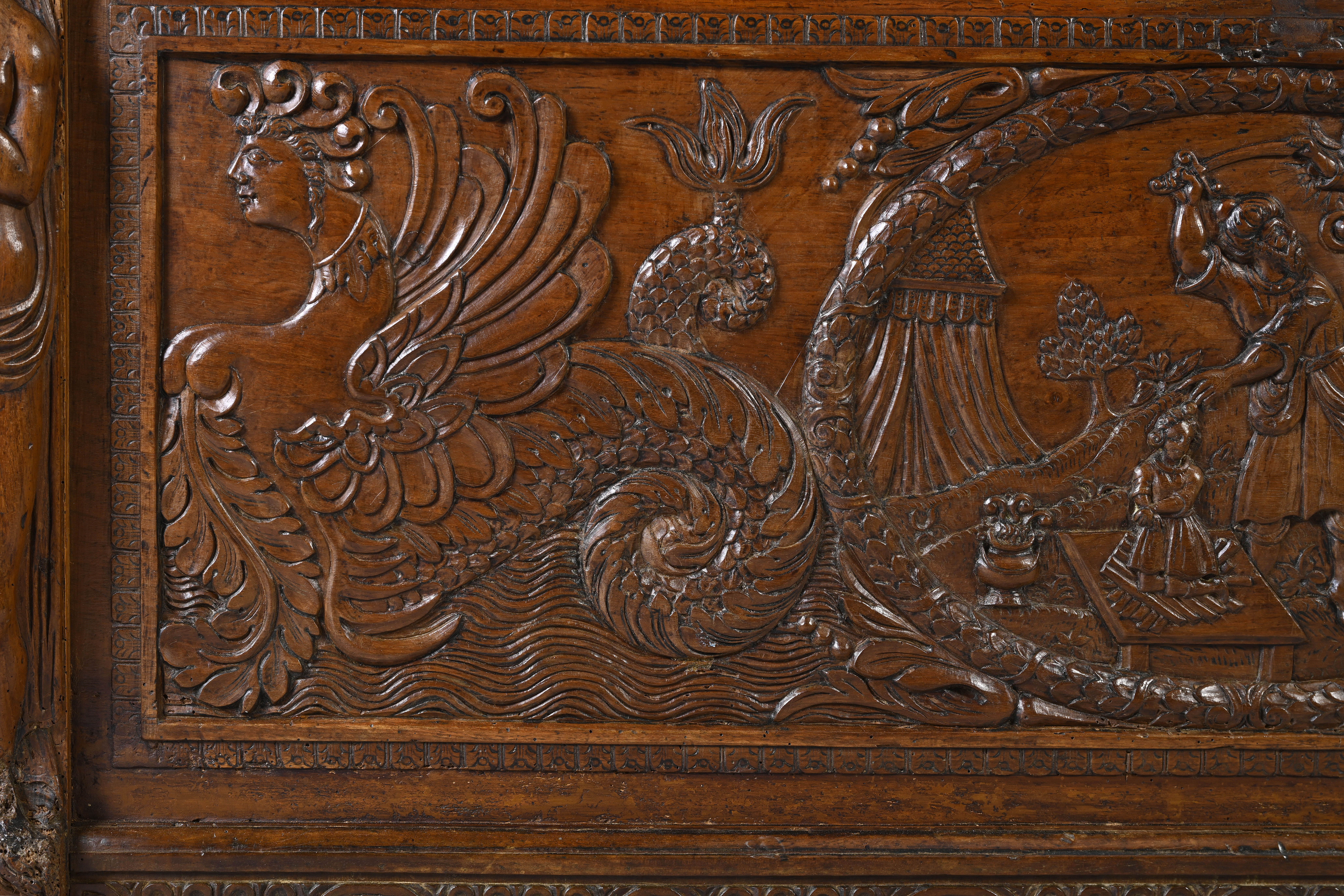 During the second half of the 16th century chests evolve. Their structure becomes more architectural while paintings and sculptures adorn the surfaces. The facade is no longer divided in panels or arcatures framed by pilasters, but from then on comprises one sculpted, panel framed with caryatids or terms. The sculptors work on mythological or biblical scenes from the Old Testament and the New Testament to ornate pieces of furniture destined to a secular or religious usage.