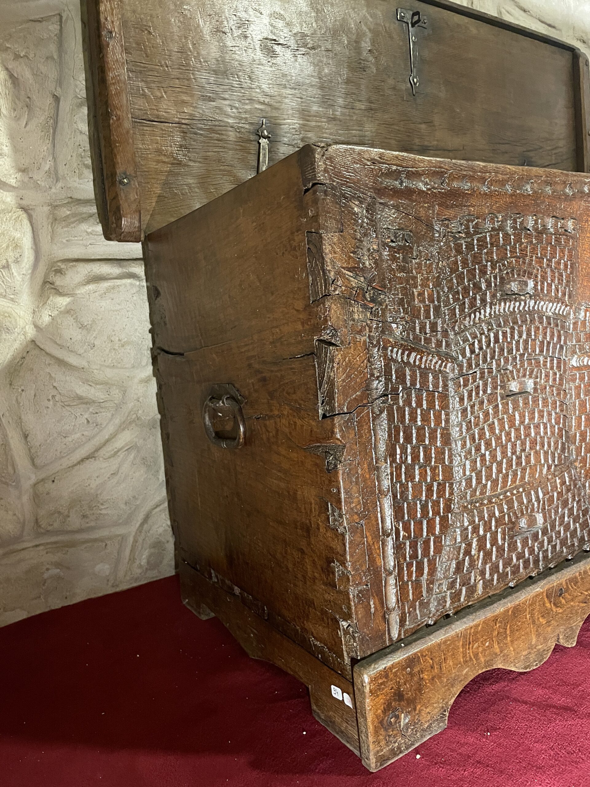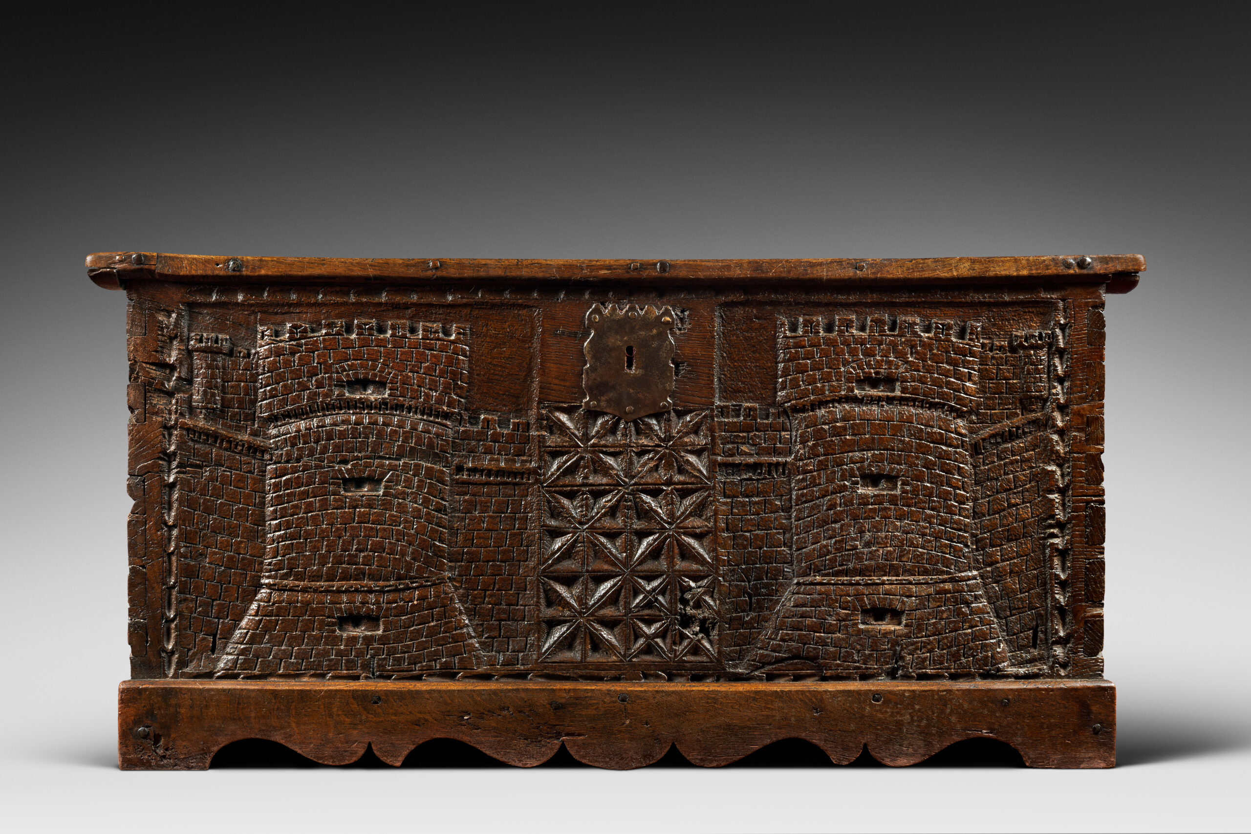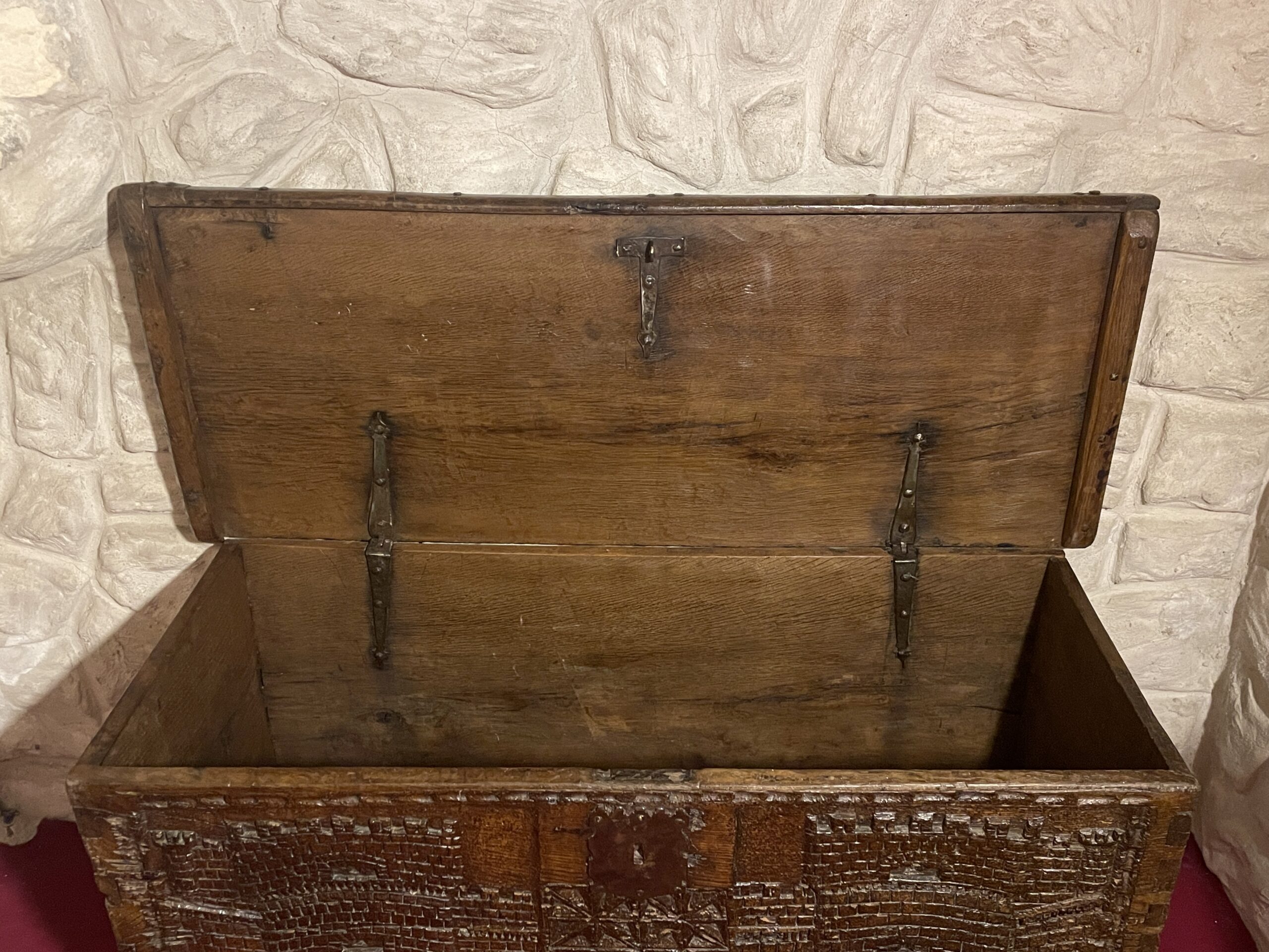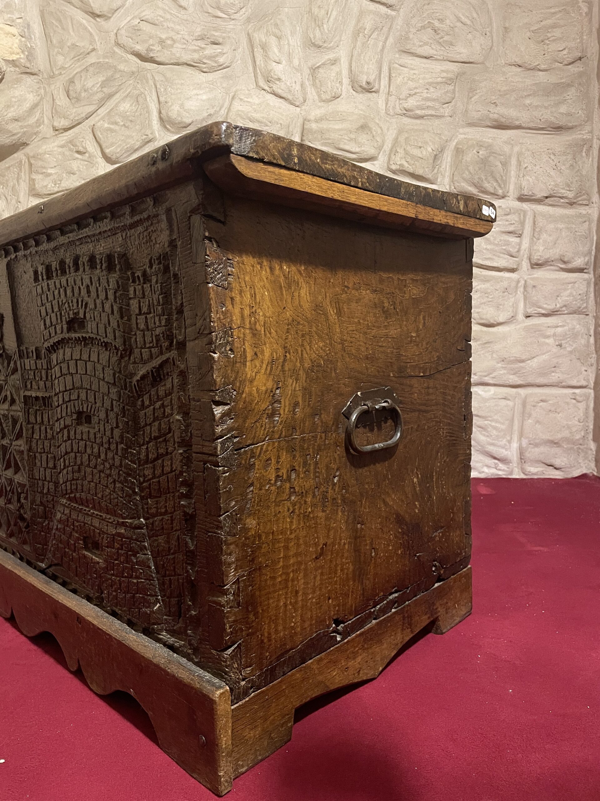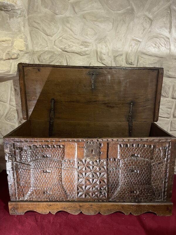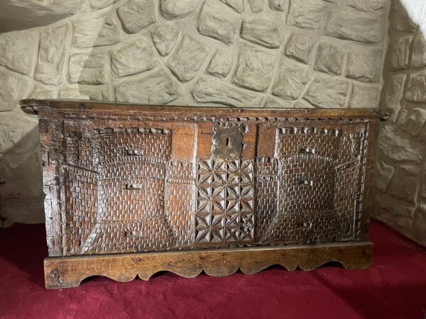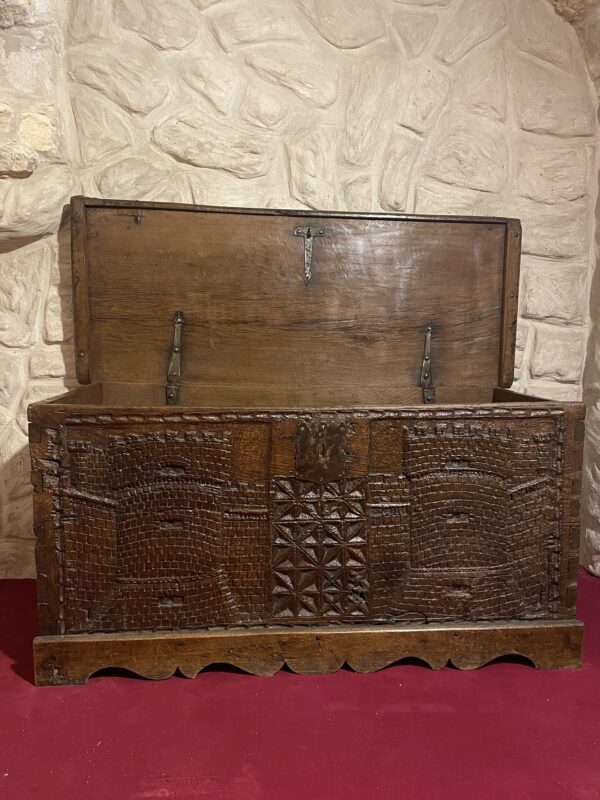 Ce rare coffre du XVIème siècle est constitué de bois de châtaignier. Il présente une façade sculptée dans la masse en léger relief. Le décor épouse toute la face avant du coffre. Nous y découvrons, entourée d’une frise en canaux, deux scènes architecturées tout à fait médiévales, à savoir, les murailles en pierres et tours crénelées d’un château fort ce cette époque. Au centre, sous une serrure à moraillons se trouve un pan sculpté de croisillons.