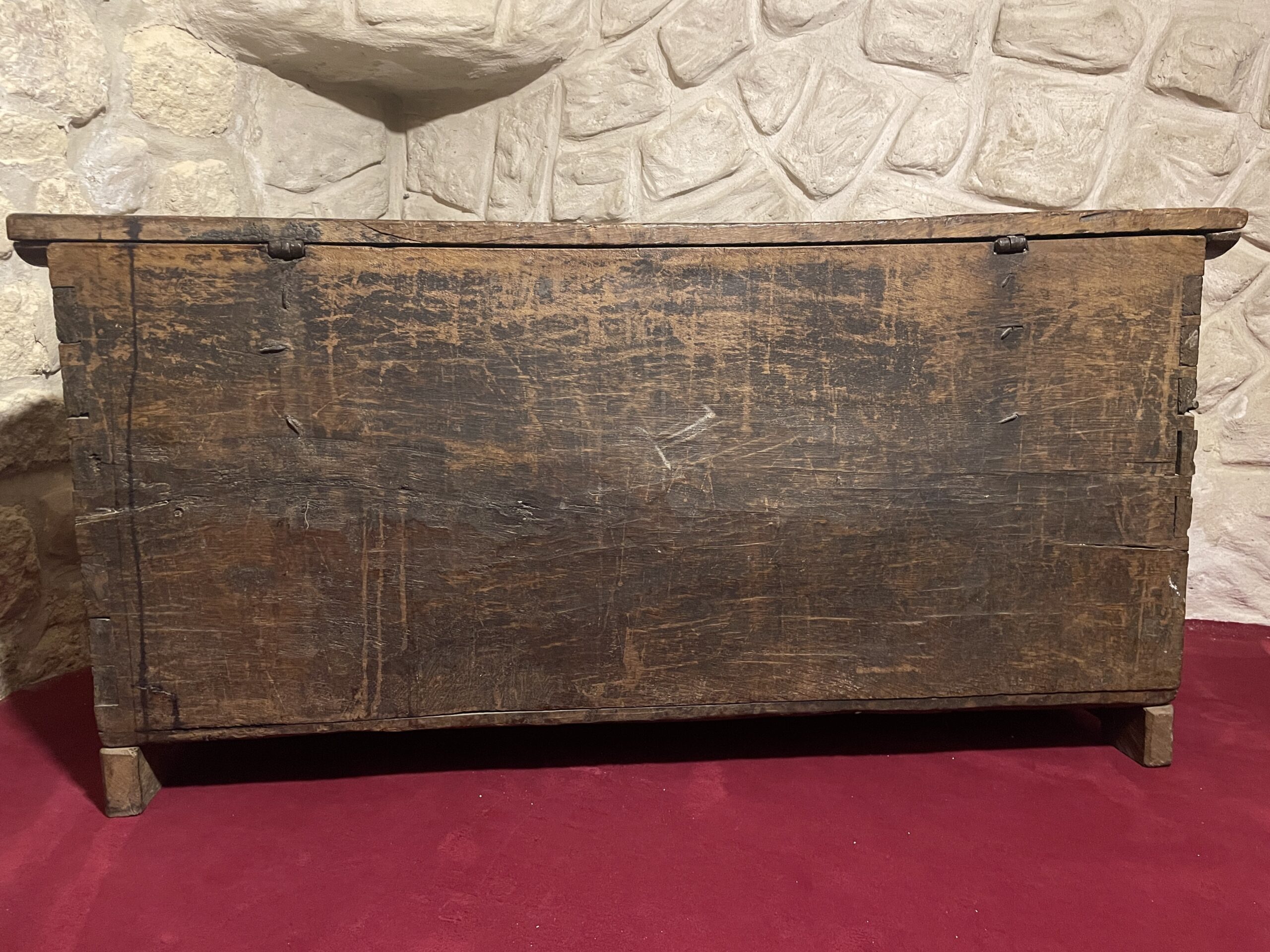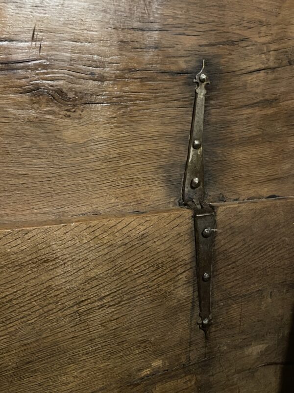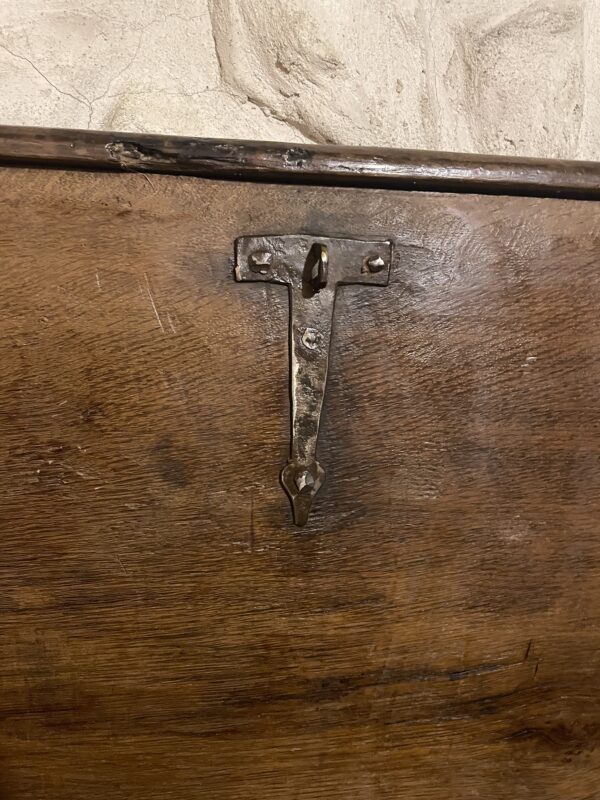 Les montants et traverses du coffre, aux belles proportions, sont assemblés par un montage en queue d’arronde. Les côtés lisses portent en leur centre des poignées en fer forgé. Il repose sur une plinthe moulurée en sa partie basse. Entièrement d’époque, il a encore son abattant et ses pentures d’origine.