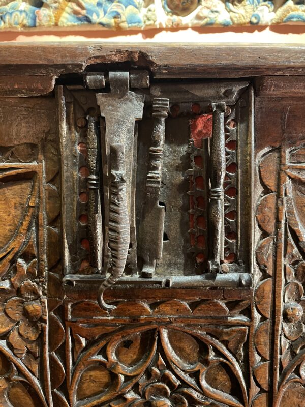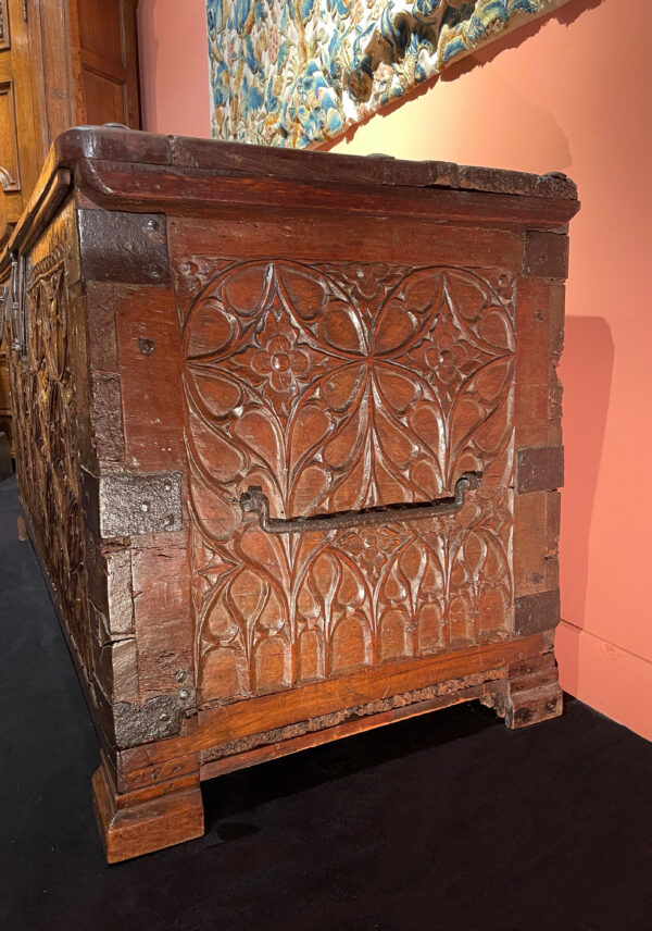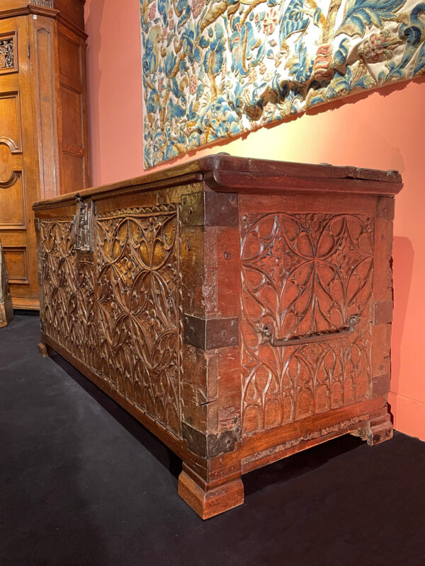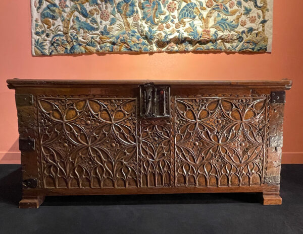 This ceremonial chest with a hasp lock has an elegant front and two sides richly carved with refined decoration. The central panel is split in a tripartite manner, articulated by denticulated friezes; entirely decorated with orbevoie-worked fenestrations. Pretty flowers flourish within finely carved rosettes with snuffers and lancets. The general ornamentation generously recalls that of cathedral-stained glass windows.