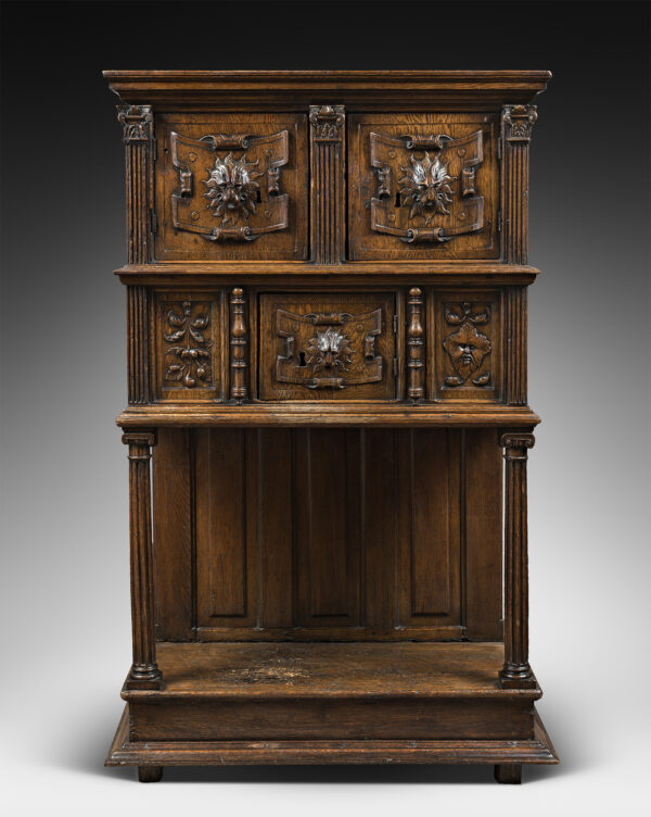 This cupboard really embodies its time. Its peculiarity resides in its two levels composition with three door-leaves adorned with finely carved lion heads on cut-out leathers. The cupboard presents a unic central door on the lower level and two doors on the upper one and is topped by a moulded cornice.