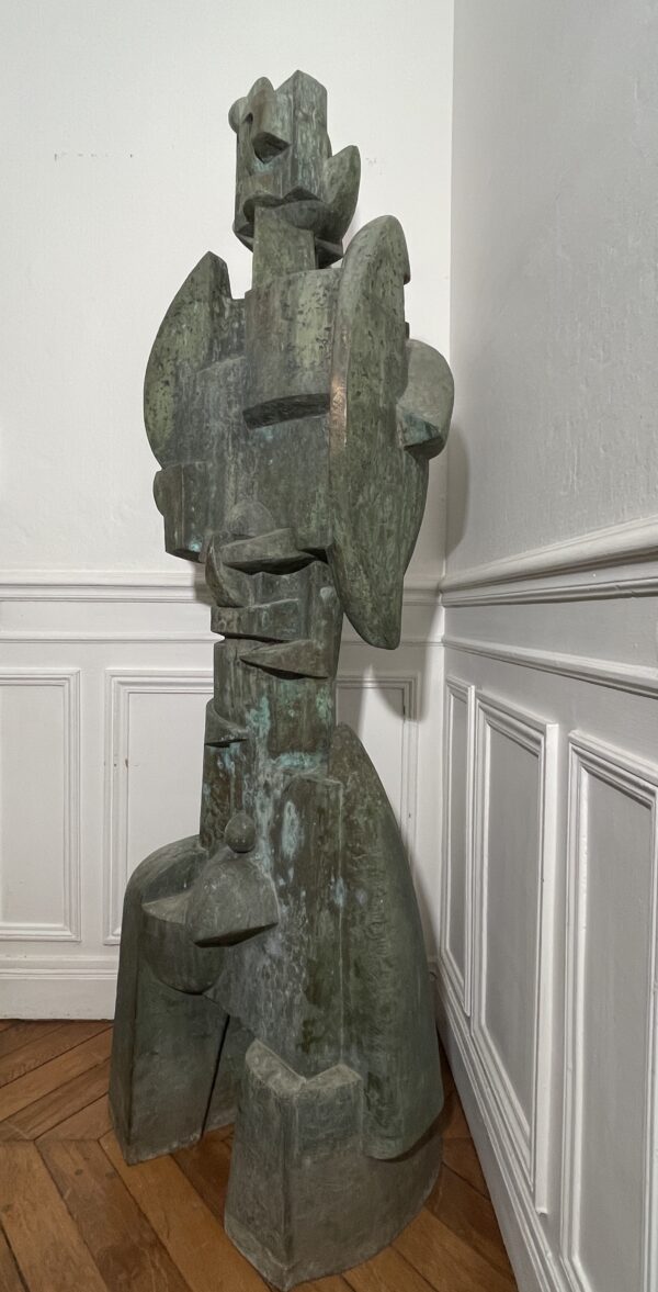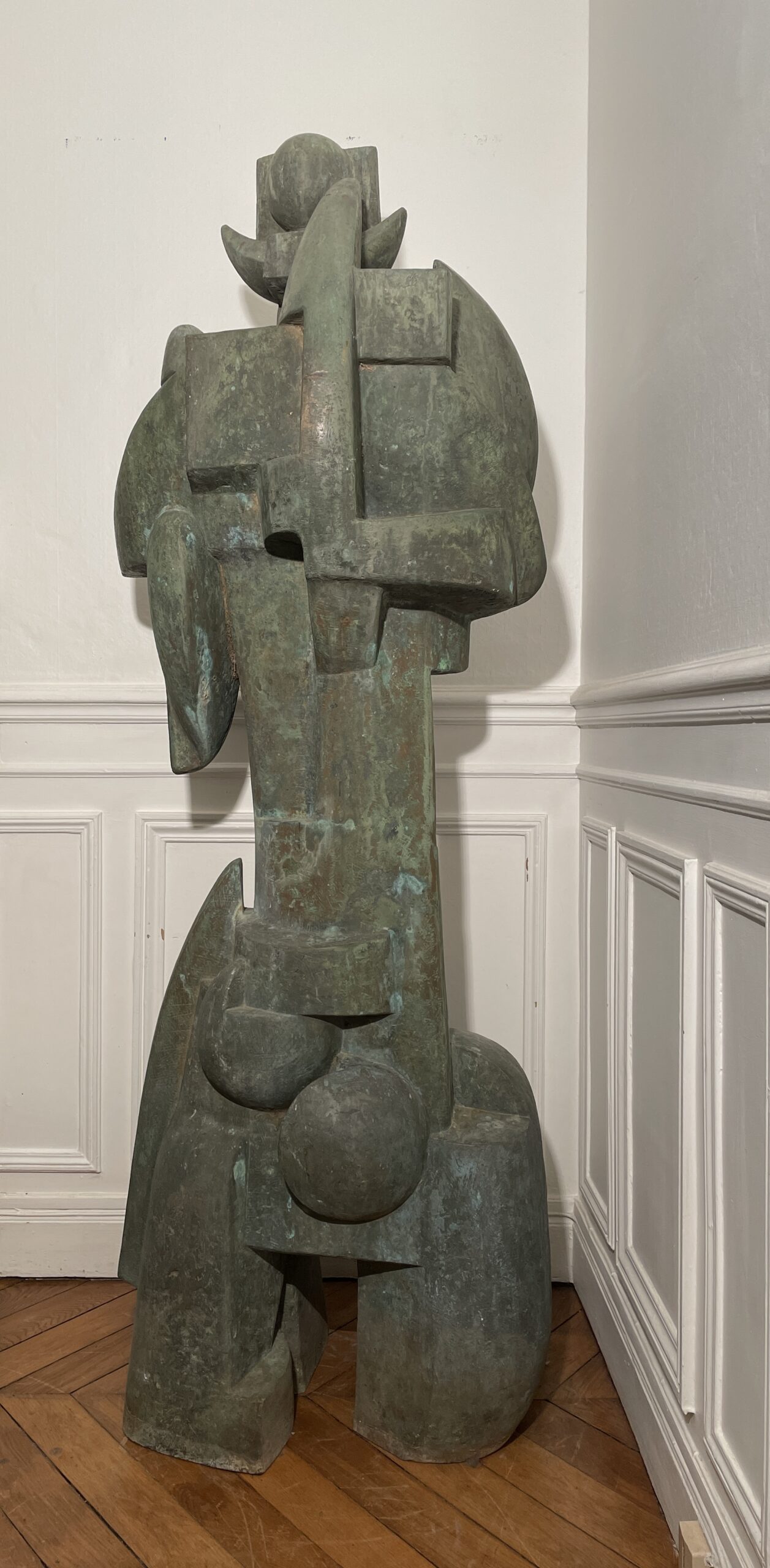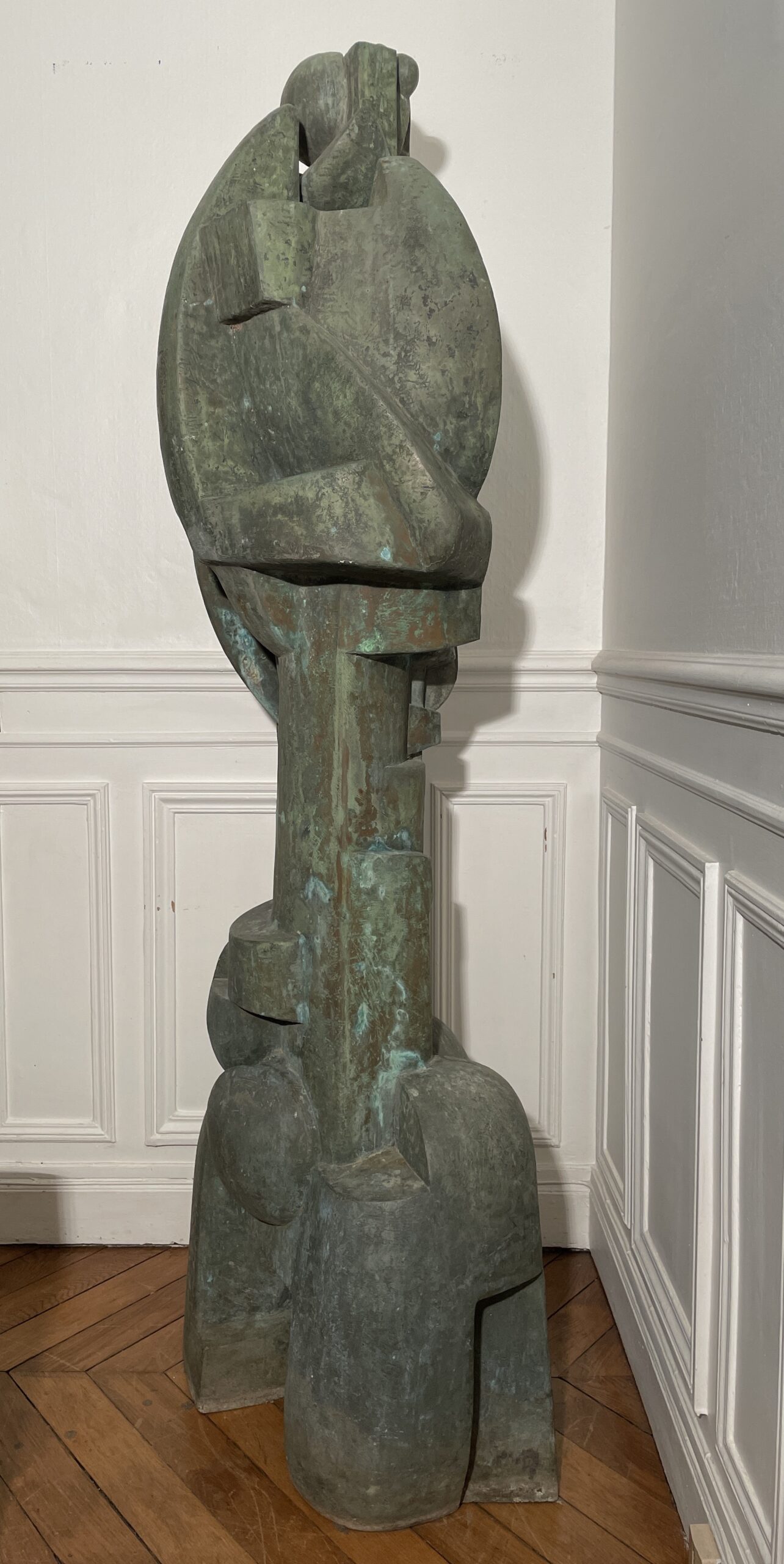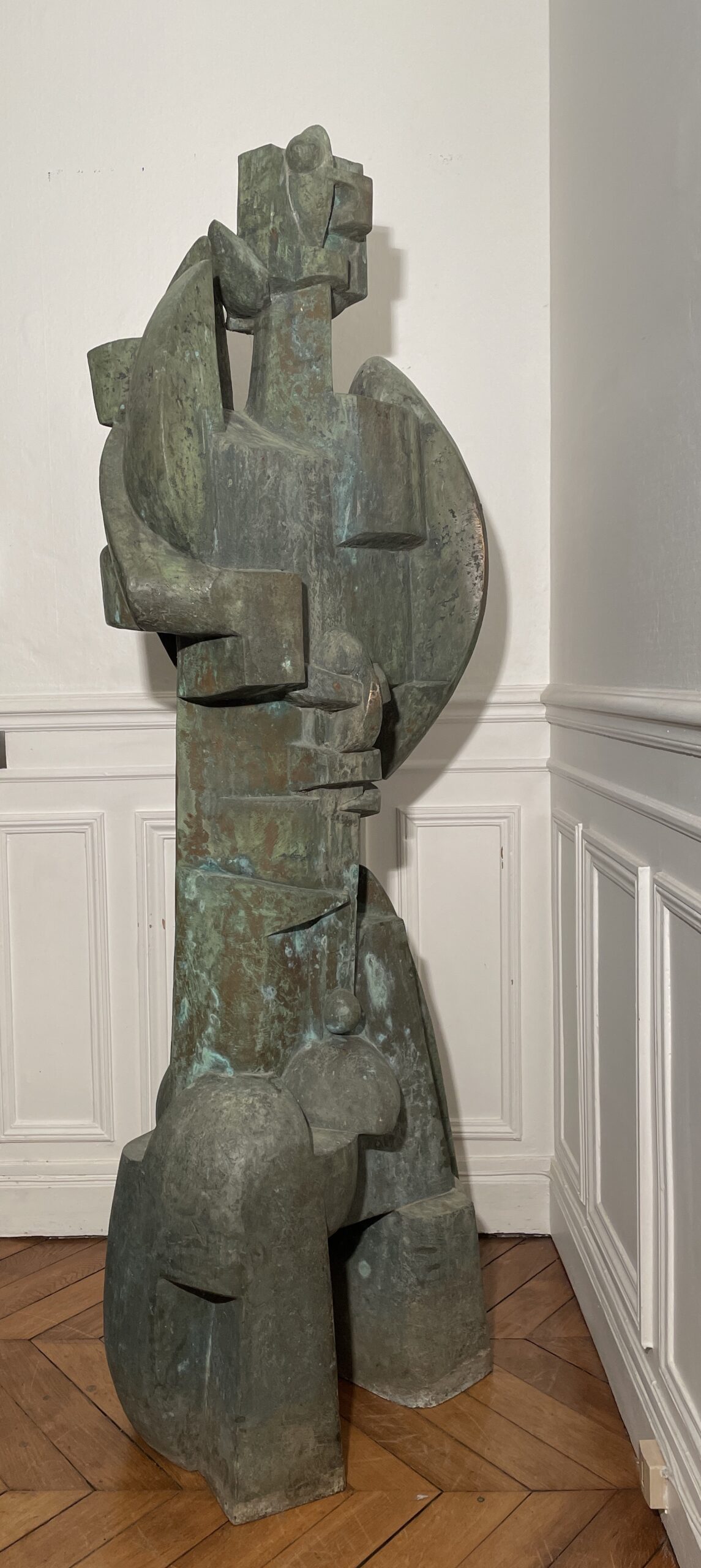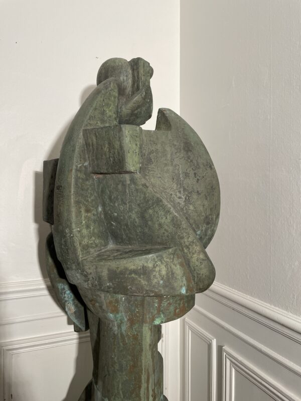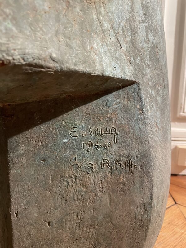 This imposing sculpture in patinated bronze by Edoardo Villa, evokes the cubist inspiration of the artist. In addition, we find an explicit influence of African art.
