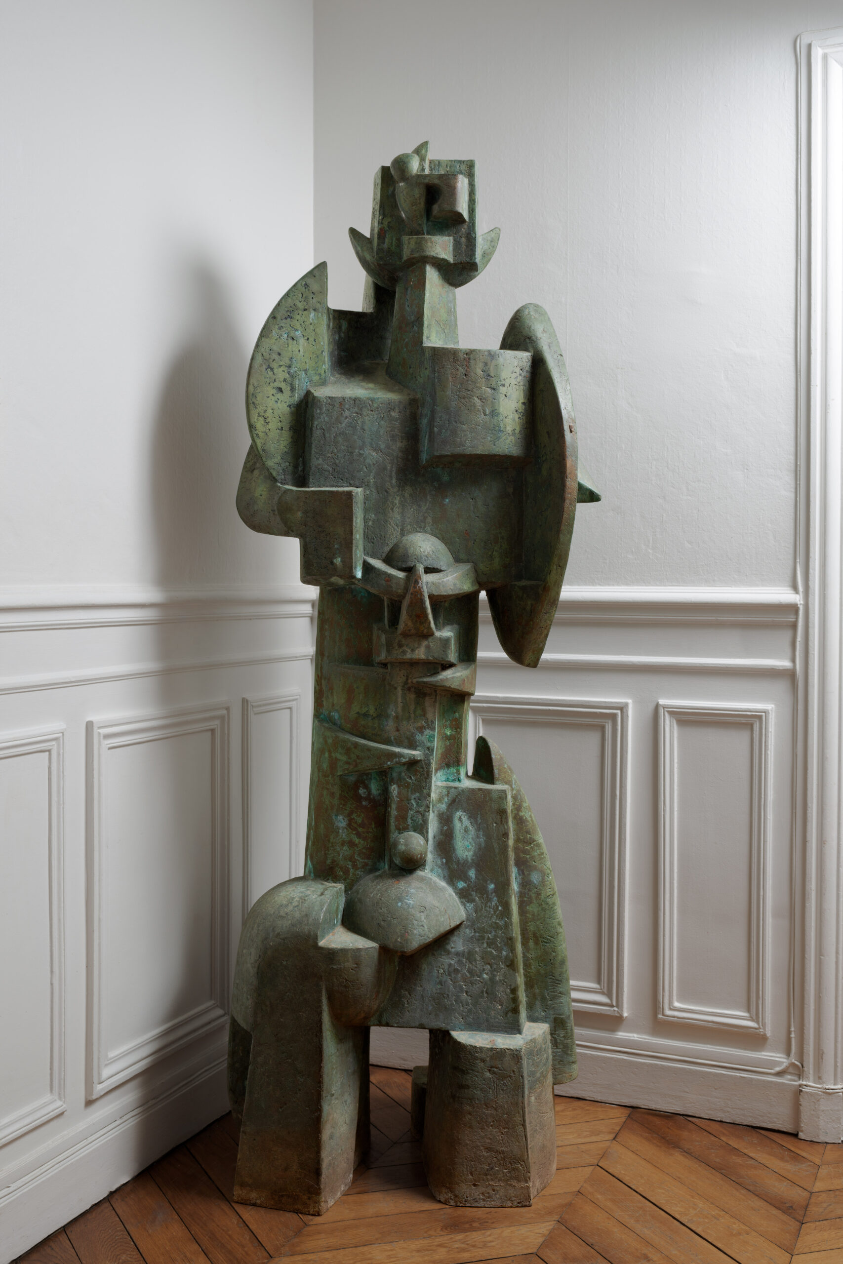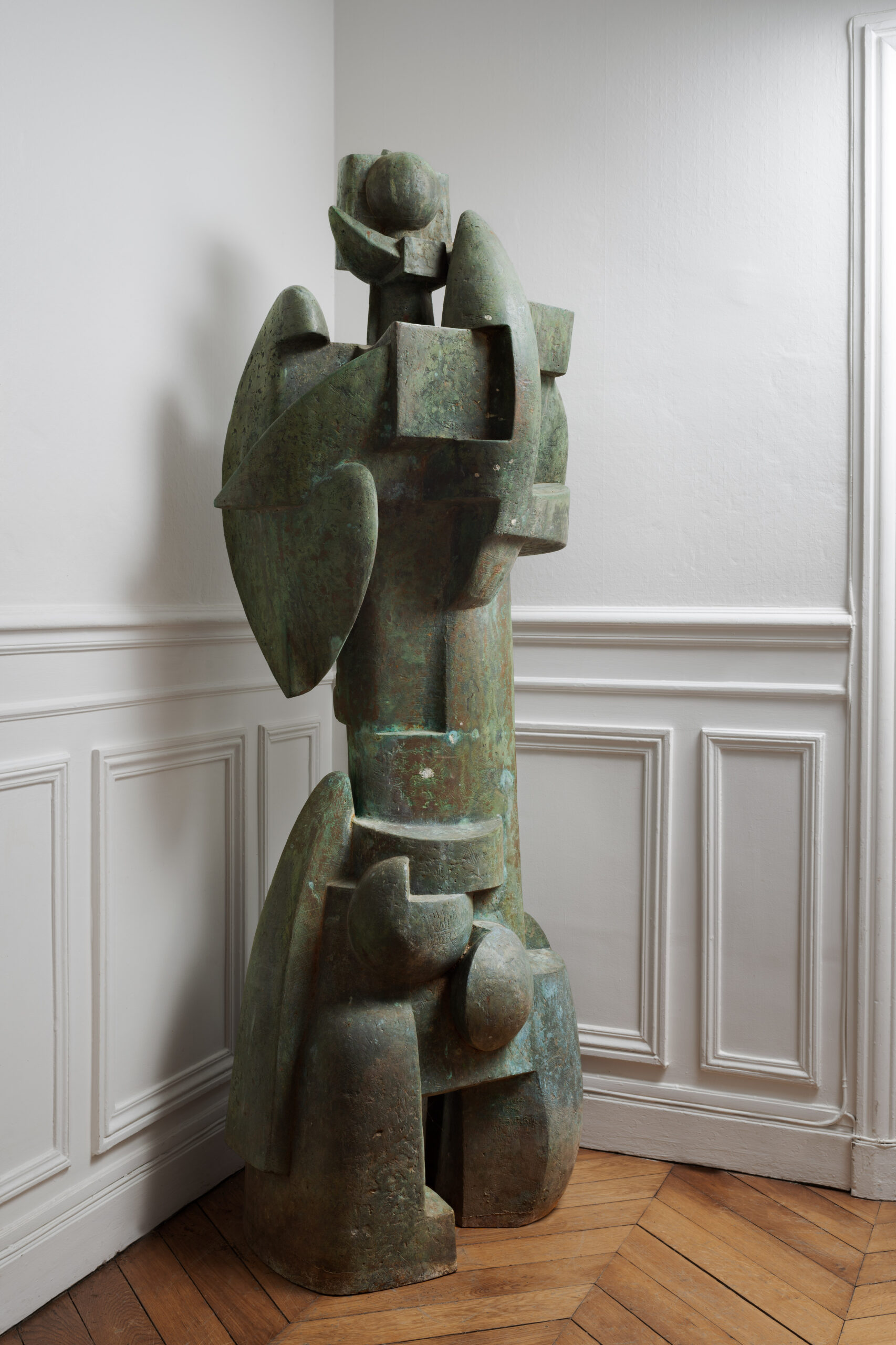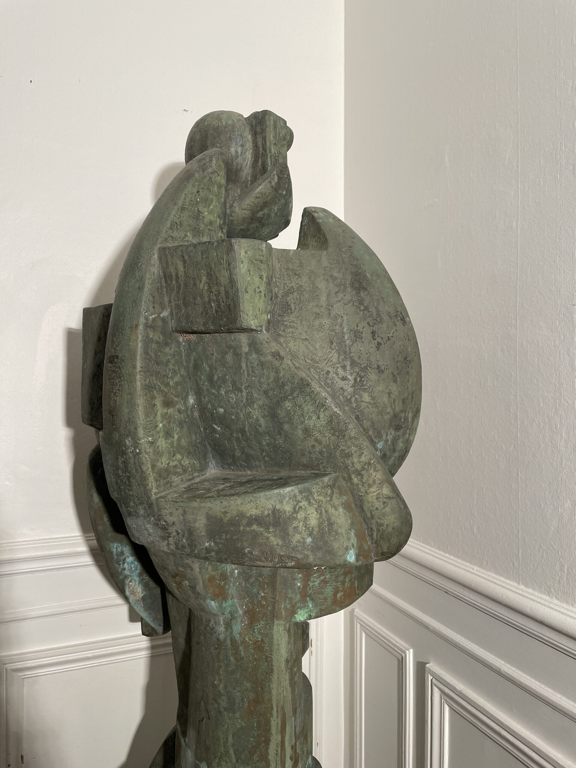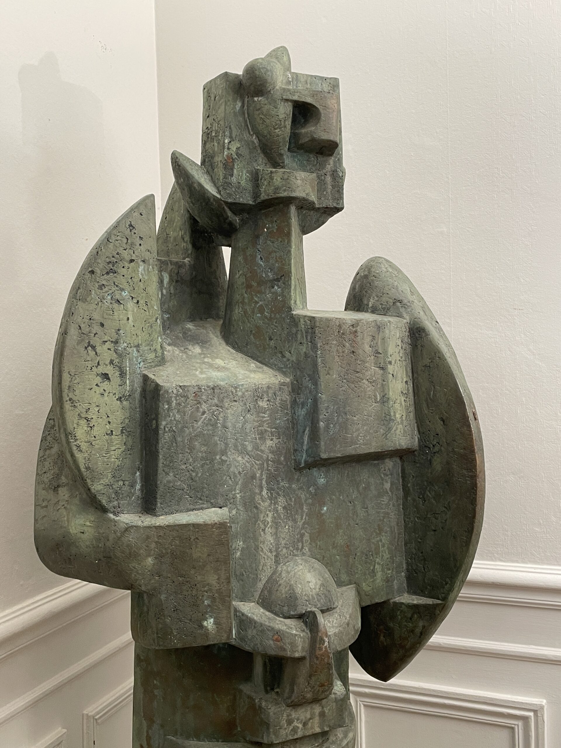 This imposing sculpture in patinated bronze by Edoardo Villa, evokes the cubist inspiration of the artist. In addition, we find an explicit influence of African art.