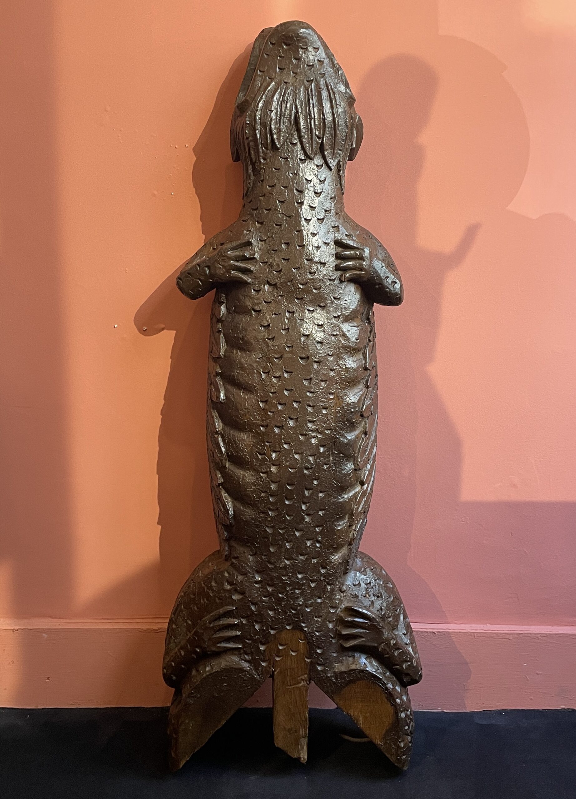 This carved oak woodwork was probably placed on the facade of the house, close to the roofing framework of a Norman house. The sculptor had depicted the salamander front-view in a stylised manner. The scales and the neck fringes are particularly detailed. The head was in the direction of the floor.