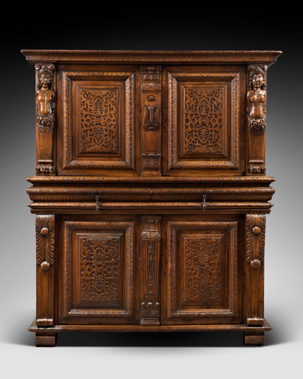 The conjoint influences of the schools of Burgundy and Lyon are particularly clear with this two-bodies cabinet. This cabinet is evidently linked to the school of Burgundy through master Hugues Sambin. Born around 1518-1520 this carpenter’s son discovered the work of Sebastiano Serlio, Francesco Primaticcio, Francesco Scibec de Carpi and Benvenuto Cellini while working on the château de Fontainebleau site. Head of a prosperous workshop, Hugues Sambin, man of many talents, published in Lyon his « De la Diversité des termes dont on use en architecture, réduit en ordre » in 1572. Using influences from Fontainebleau mannerism and architect Jacques Androuet du Cerceau’s works this compendium assisted many cabinet-makers. Our cabinet’s term sculptures give testimony to the influence of Sambin’s engravings.