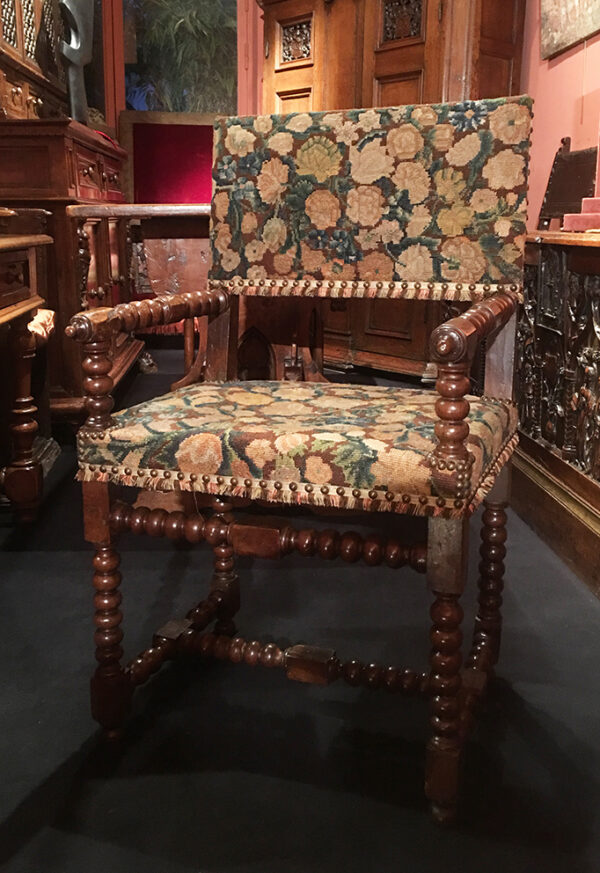 The unity and quality of the wood turning, particularly for the rosary beads elements, demonstrate the cabinet-makers’ skills. This exceptional chair characterizes the 17th century French production.
