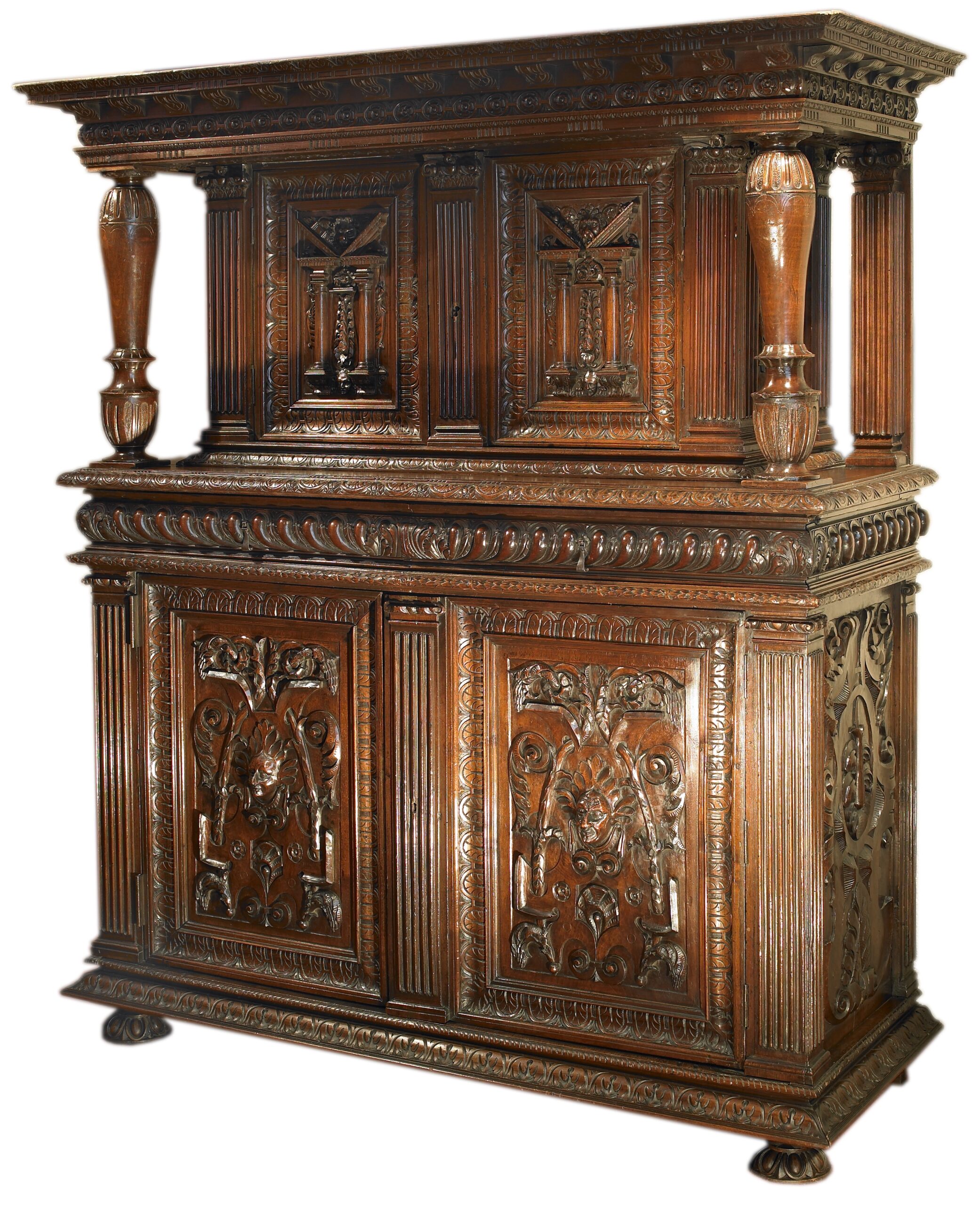 This fine quality piece of furniture has carvings completely covering both sides. The designs both top and bottom are very similar but of different sizes and are both inscribed between two fluted pilasters with ionic capitals.