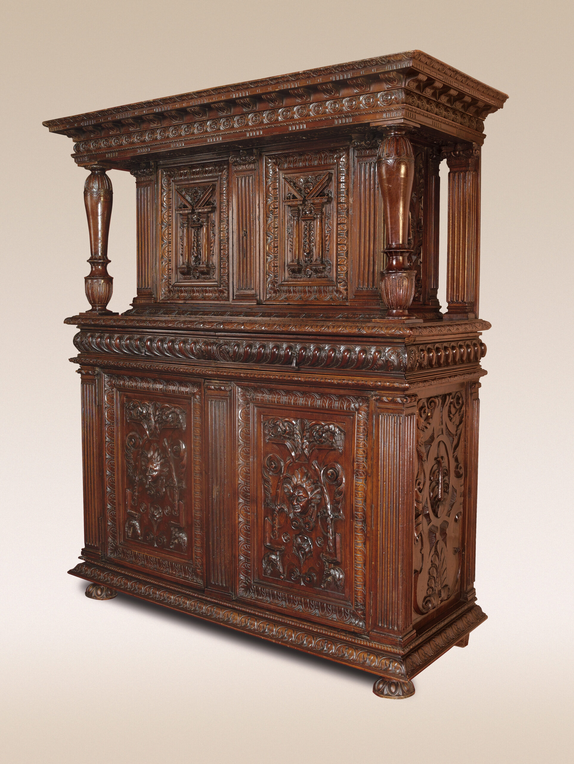 While these cabinets are adorned with figures of fauns on their uprights, their panels figure a fantasy world in which there is a mixture of coiled plaits, masks, curled cut-out leather and chimeras.