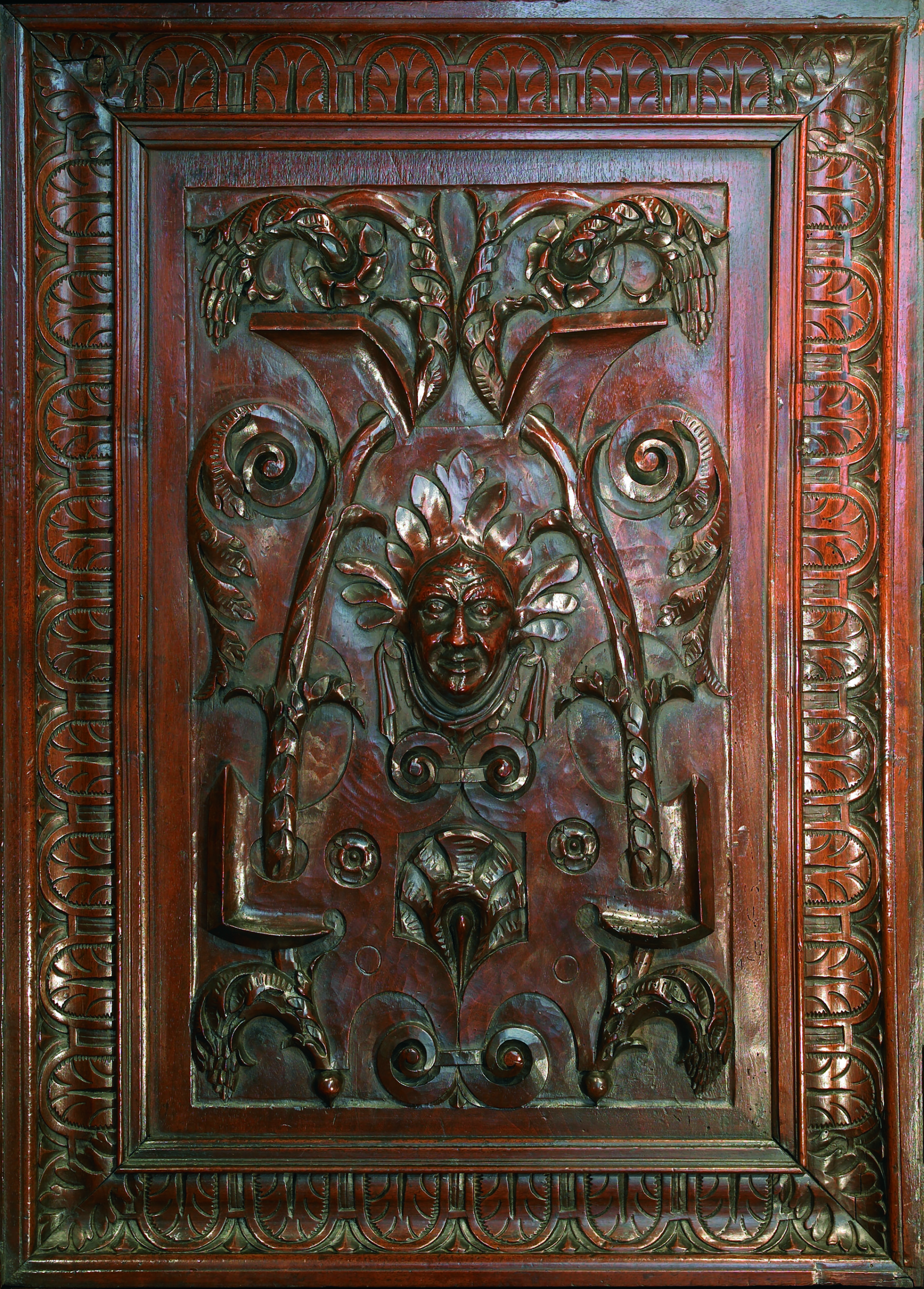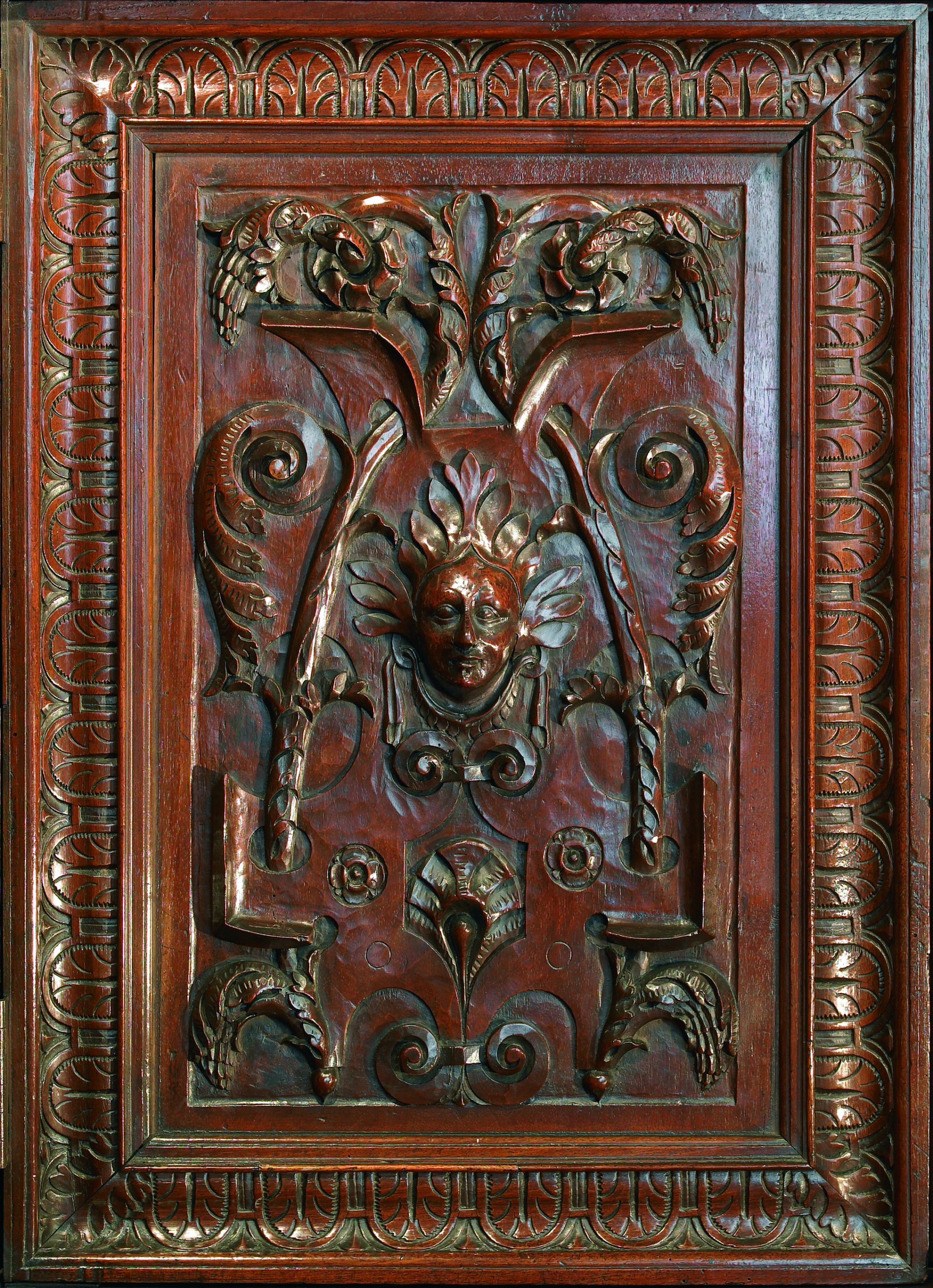 The two panels are carved with the same pattern of a semi-portico with inverted triangular pediments. Between the columns appears an acanthus chalice motif which can also be found on some works related to Hugues Sambin (chapelle du Saint-Esprit and salle Saint Louis, Palais de Justice, Dijon.)