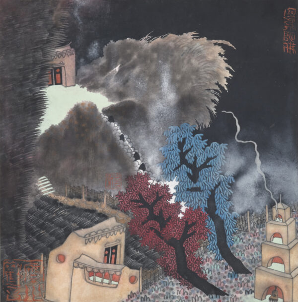 The main composition is made up of stable dwellings, well attached to the earth, this landscape aims to be of immobile beauty. The river symbolizes the course of life, thus showing the contrast between the perpetual movement of water and the stability of the eternal landscape, image of the world of dreams.