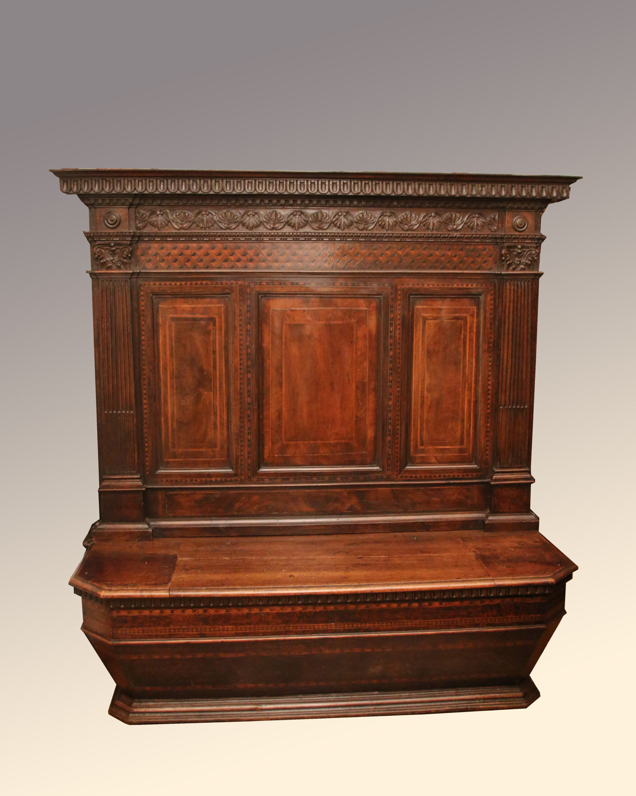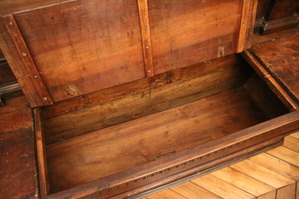 The cut-away seat of this chest-bench also known as cassapanca rests on a moulded base. The lower part comprises two sections divided by a moulded element. First five oblique panels enriched with a geometrical inlaid decor then five straight panels with a lozenge and star decor.