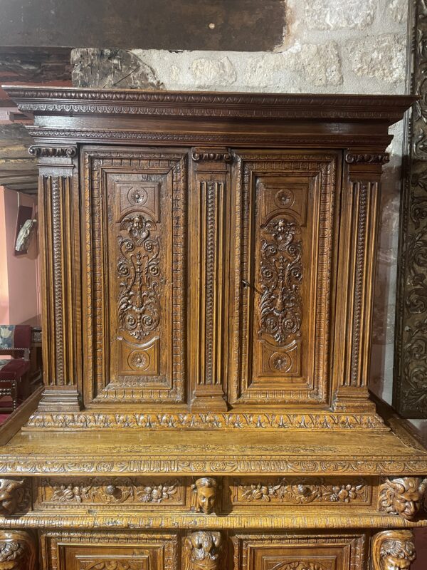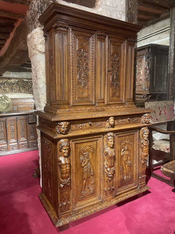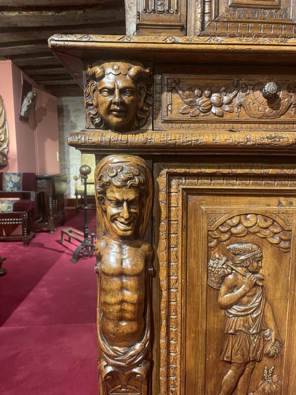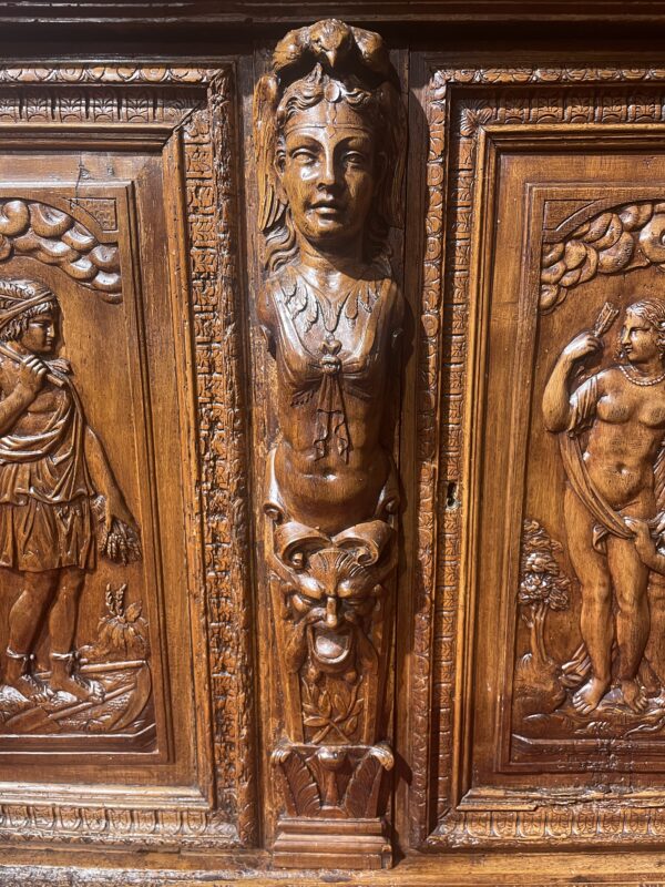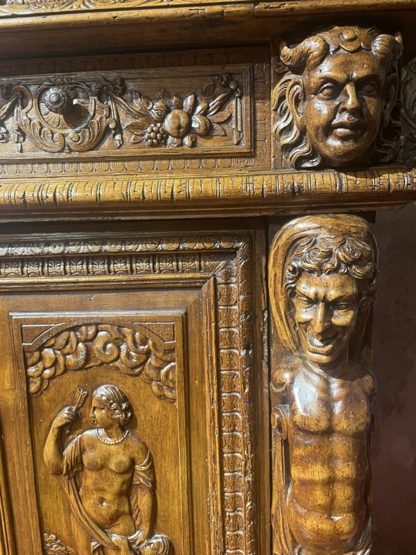 The doors are flanked by two male terms in draperies, sculpted in high relief, with grimacing faces and well-defined musculature, characteristic of Hugues Sambin’s Cabinets. In the center, a female figure with long hair, in bust, adorned with a necklace and a fibula, winged and wearing an eagle headdress, surmounts in a coiling of leather, a satyr mask.
