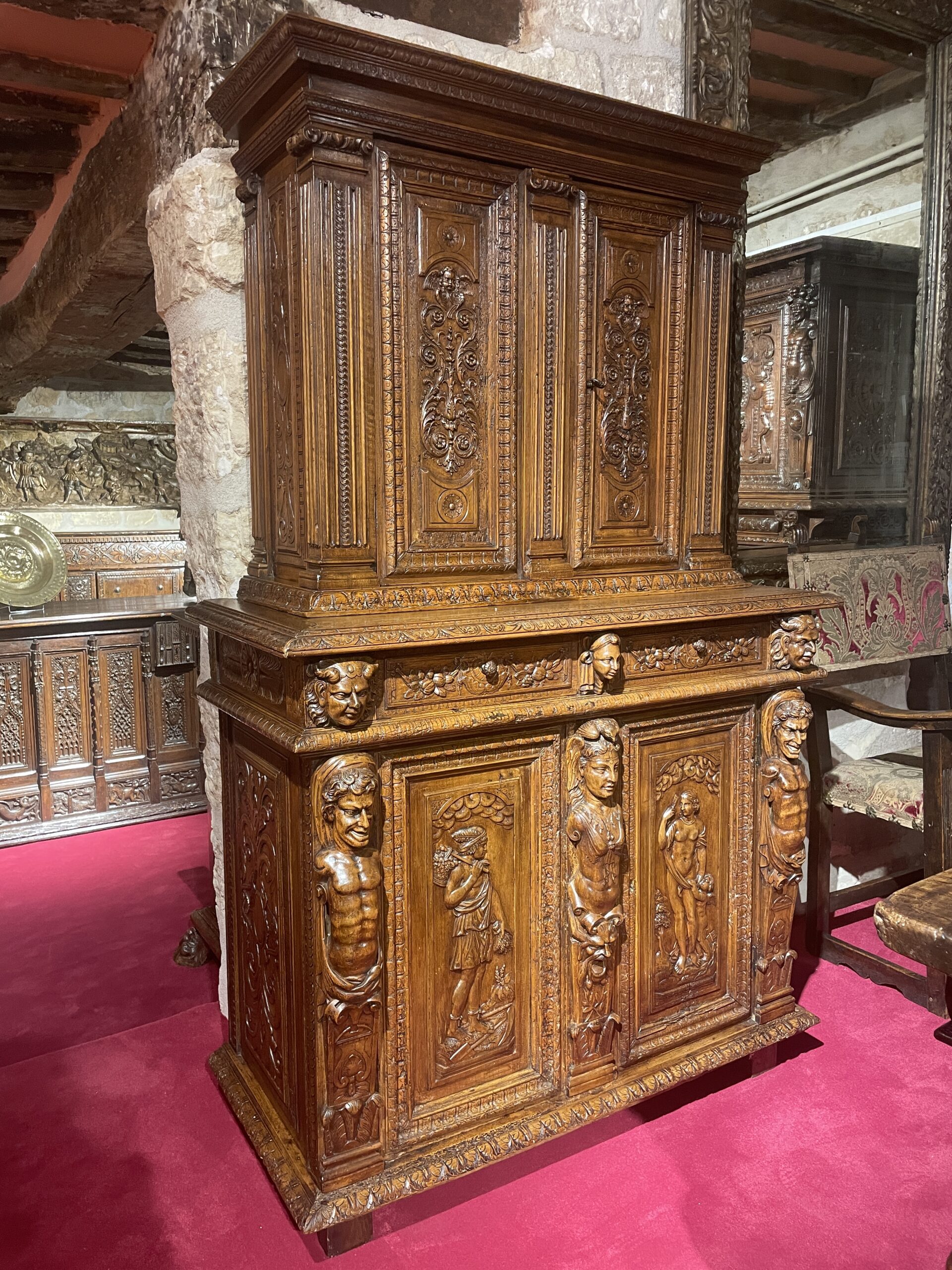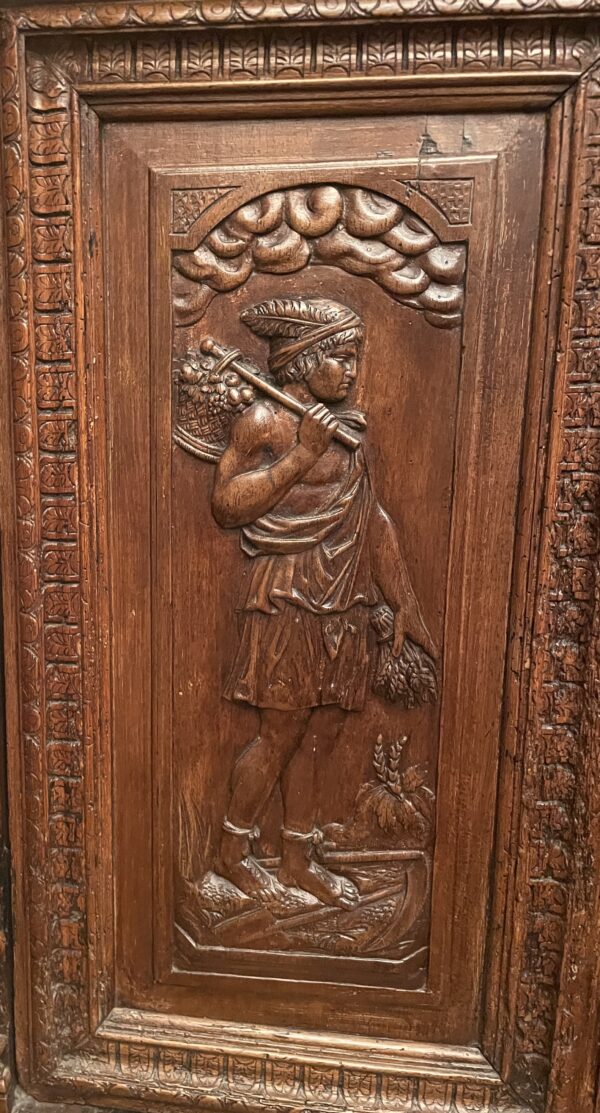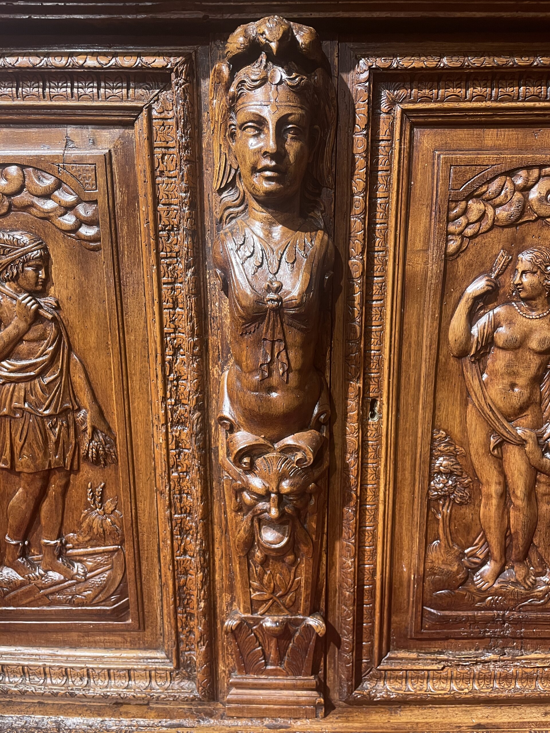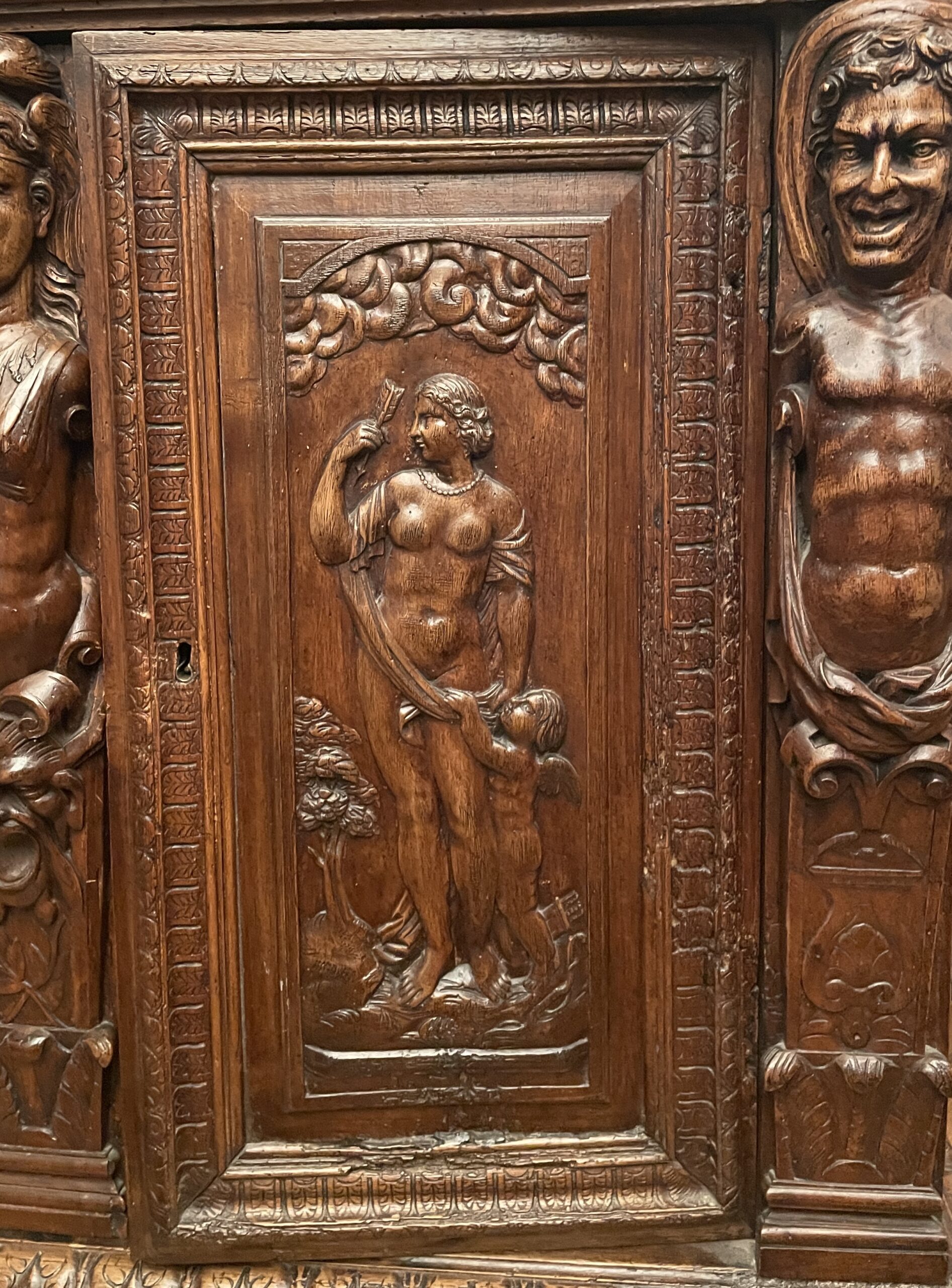 Secondly, the exceptional quality of the sculpture, the harmony of the well-structured composition, as well as the presence of specific terms of Burgundian art from the second half of the 16th century, allow it to be considered as a piece “in the manner of Hugues Sambin,” where ornamental profusion leaves no room for emptiness.