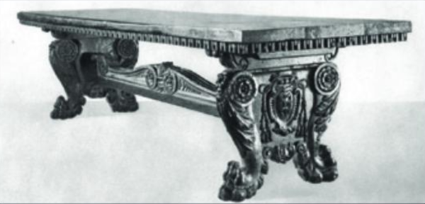 Operating a nice balance between ornaments and plain surfaces the table’s crossbar is sober and robust.
