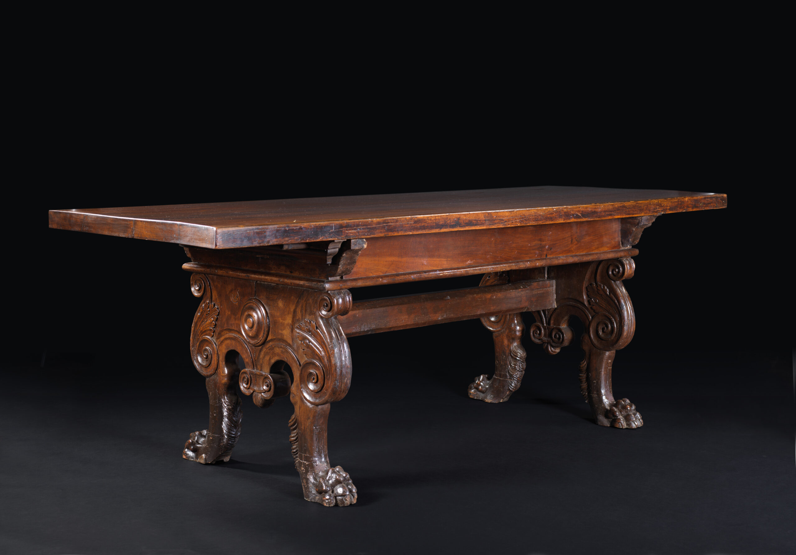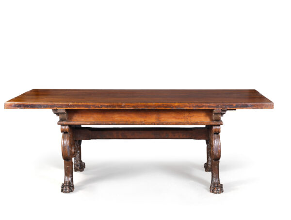 The lengthy and elegant plate of this Italian Renaissance palace table stands on a simple belt.