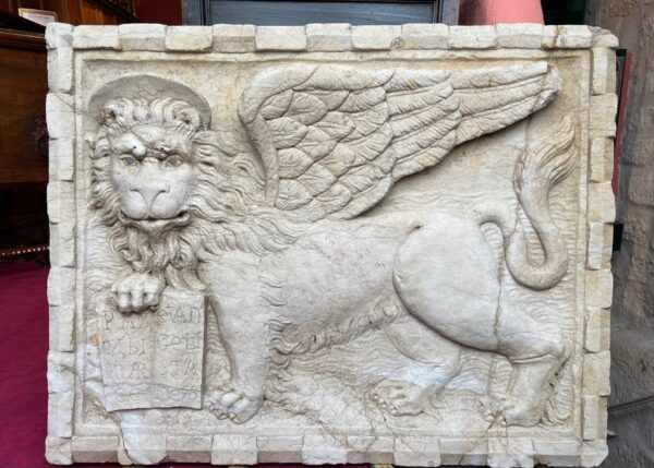 In the 16th century, Venice’s influence extended well beyond the lagoon and developed on the mainland to the west and around the Adriatic Sea. A policy of expansion on land and sea is expressed in the bas-relief with the waves of water to the right and solid ground beneath its paws. Victims of iconoclastic fervor in the late 18th century, the leoni marciani suffered greatly, particularly in Venice, and perhaps this sculpture was spared, sealed on the facade of a residence distant from the political center of the Serenissima, in the inland areas.