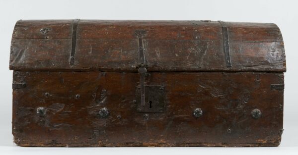This fine chest or travel case is made of softwood. Its oblong shape is topped by a curved lid. The adze cut planks structure is strenghtened with metallic hinges and small flower shaped nails. On the facade is located a hasp lock while on both lateral sides are placed handles.