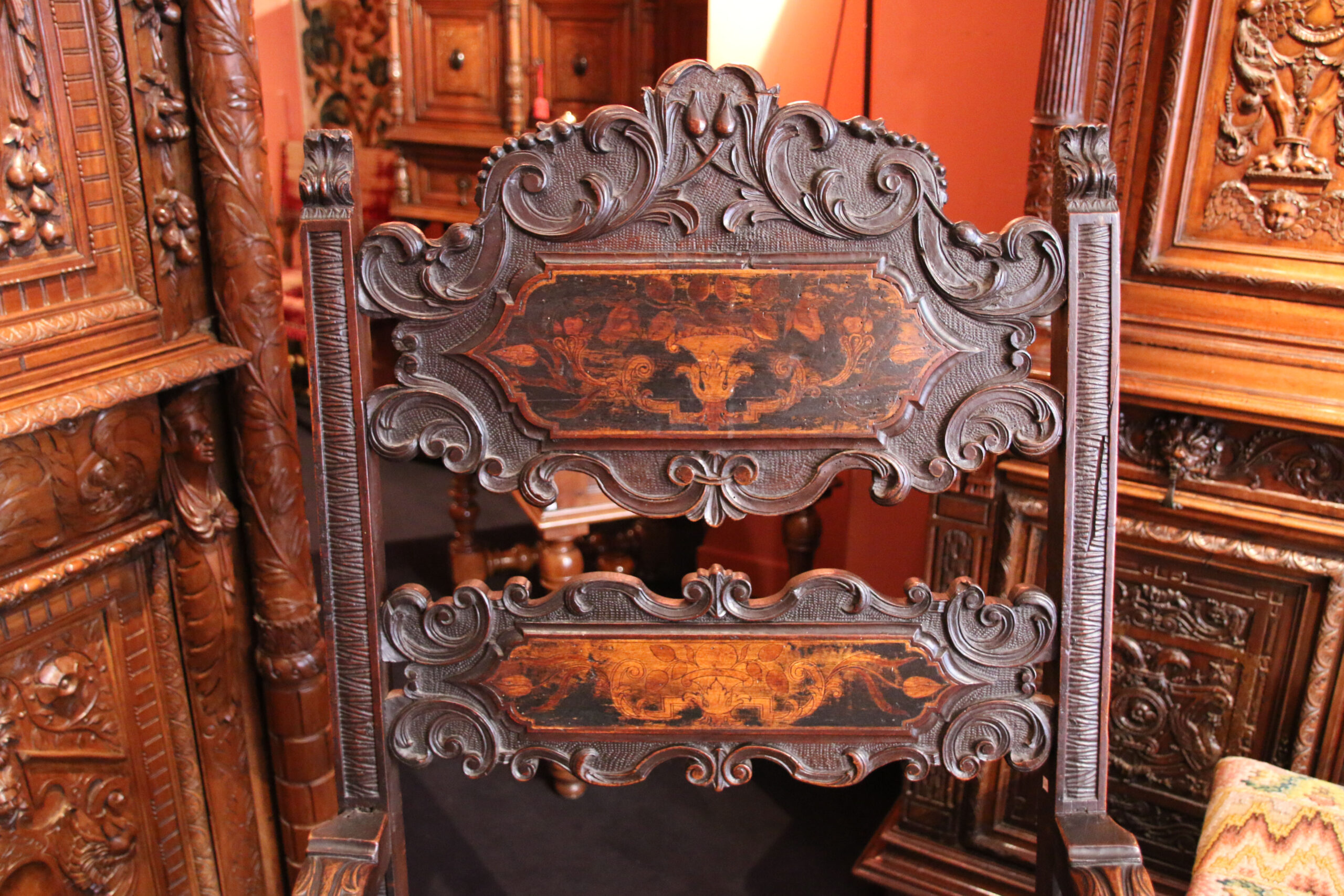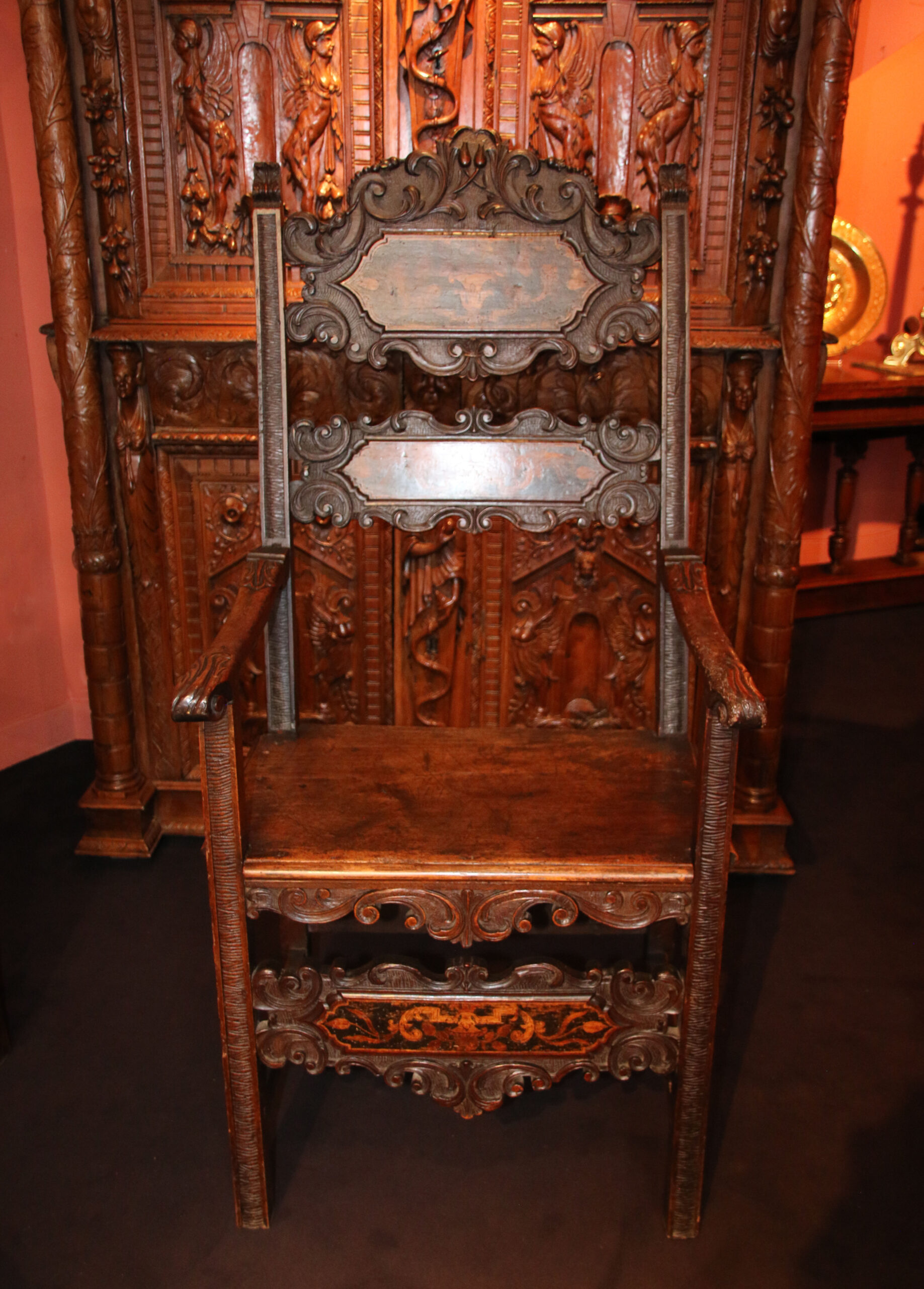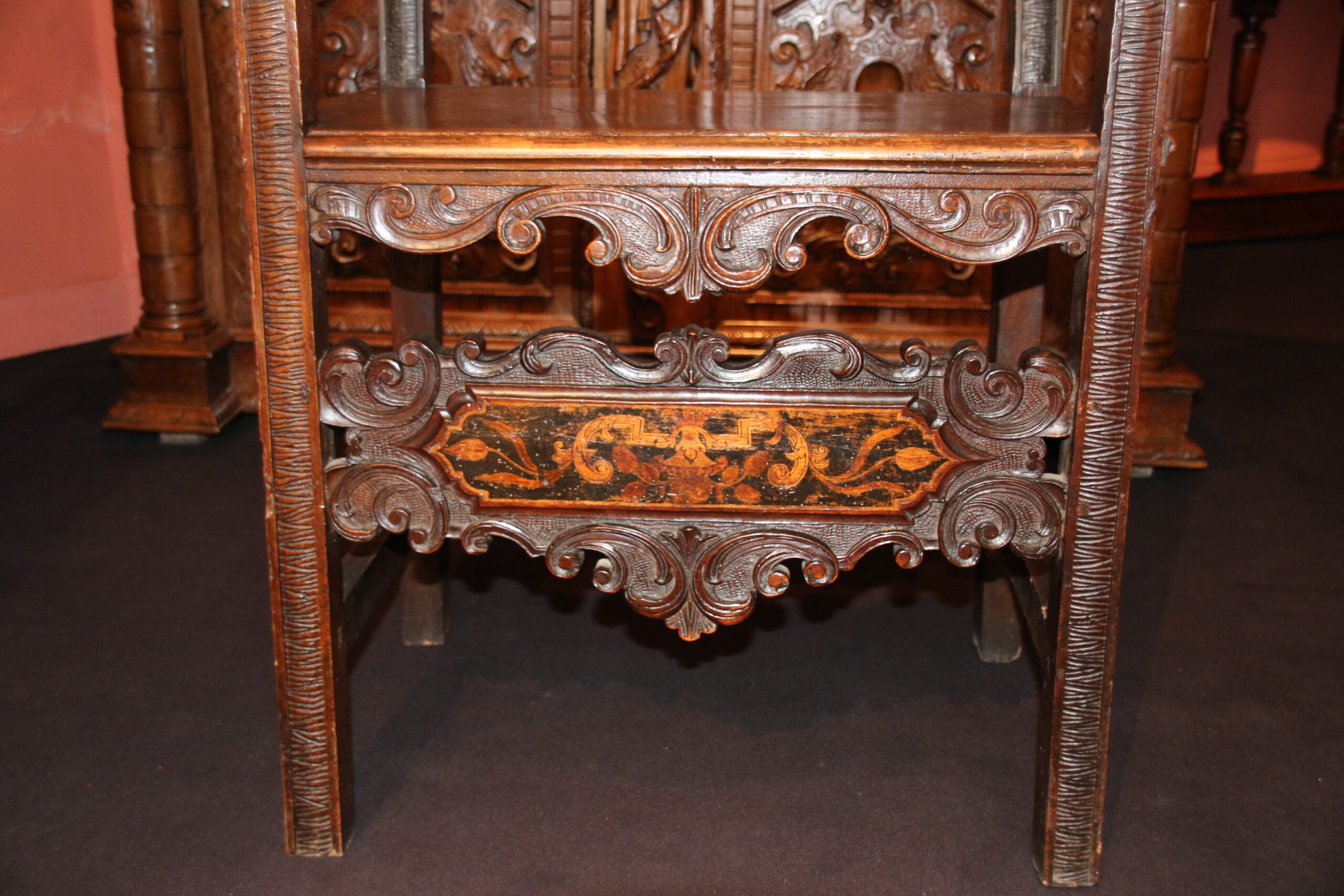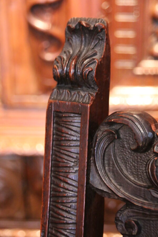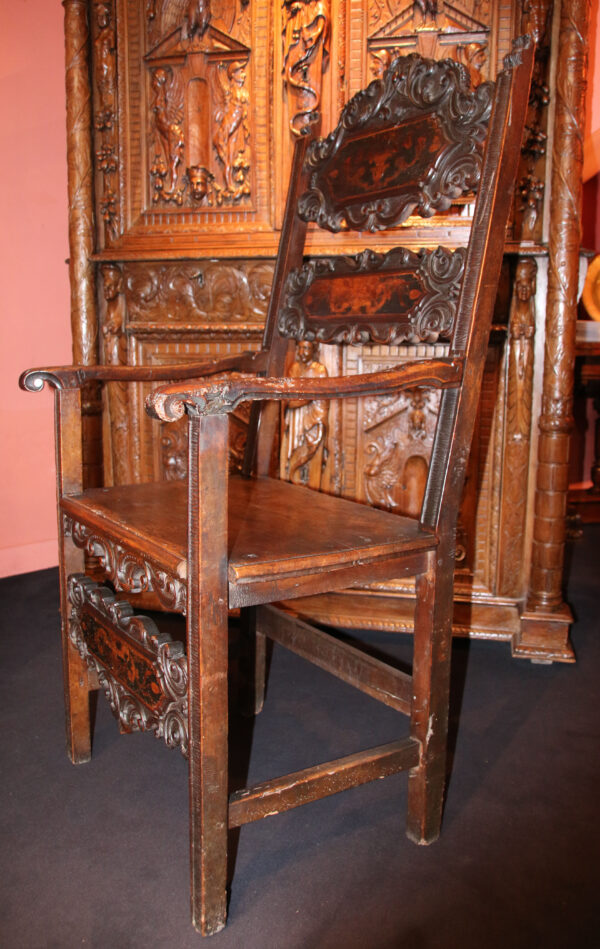 The crosspieces of the back and the base of this important armchair in walnut wood are decorated with reserves engraved with flowers in an entourage of foliage and scrolls.