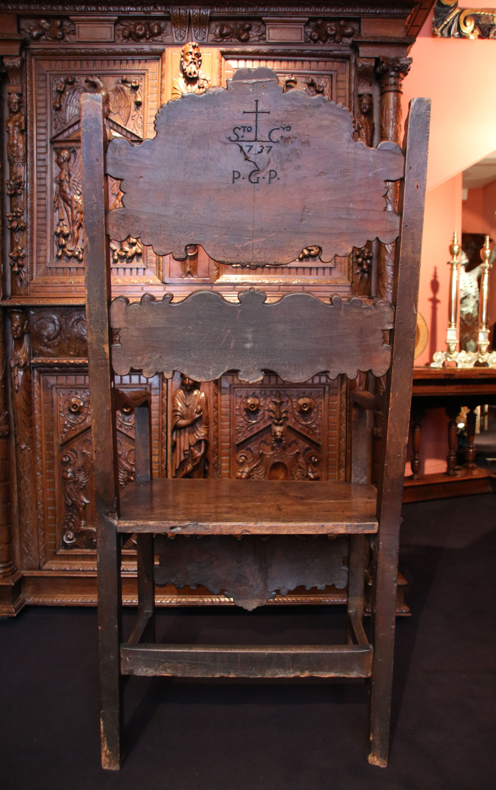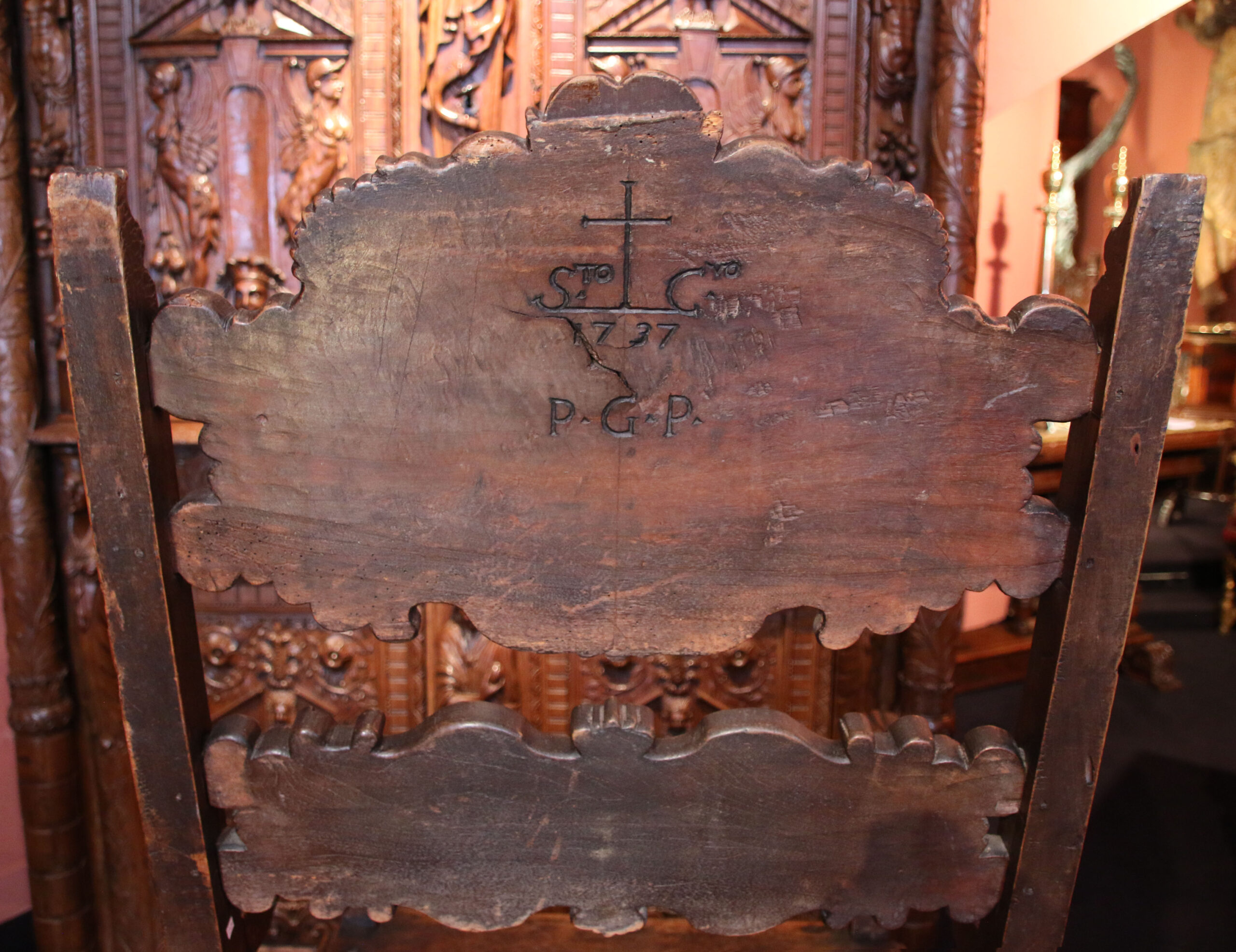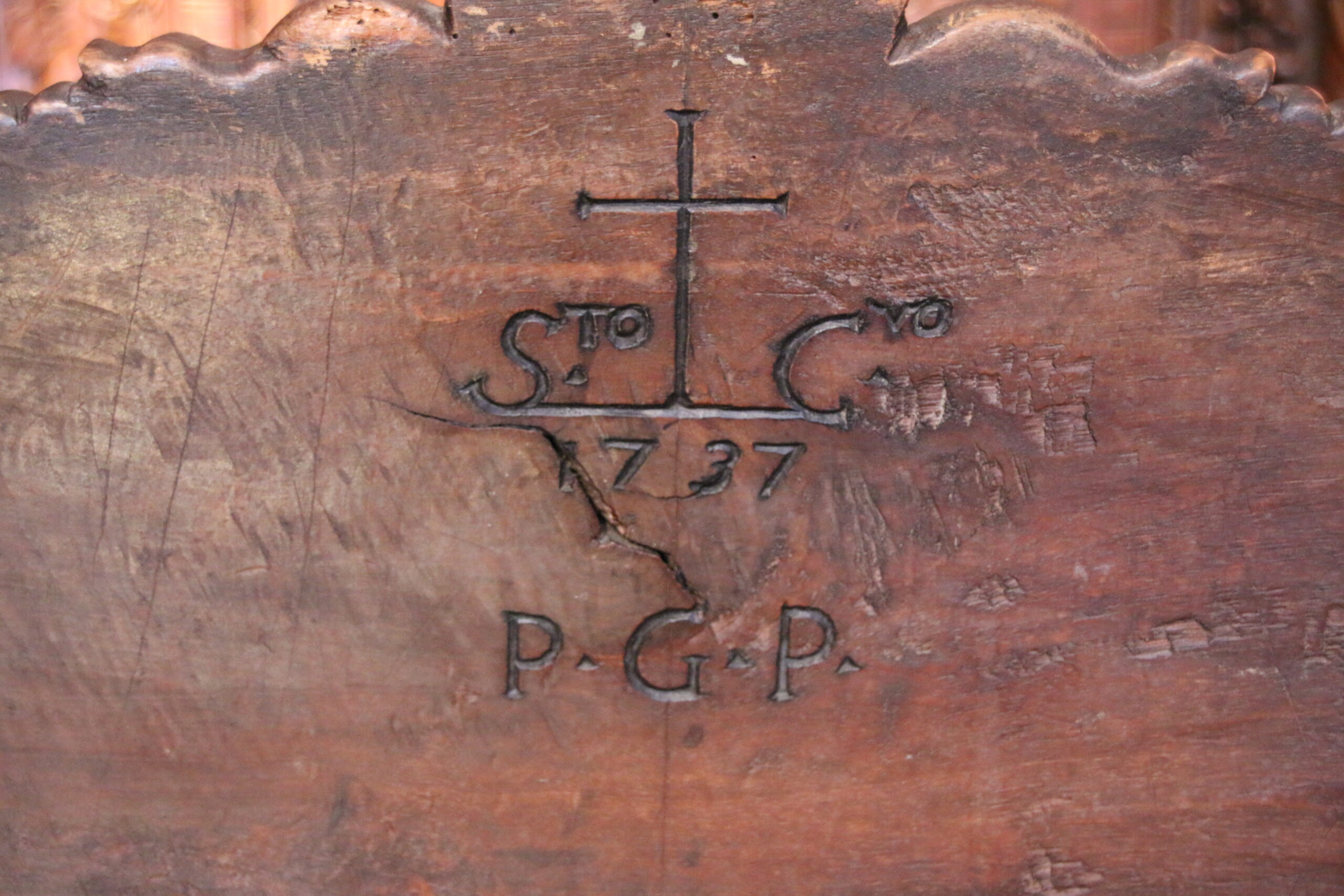 The back of the backrest is engraved with a cross is surrounded by Sto Cvo, dated 1733 and encrypted P.G.P.