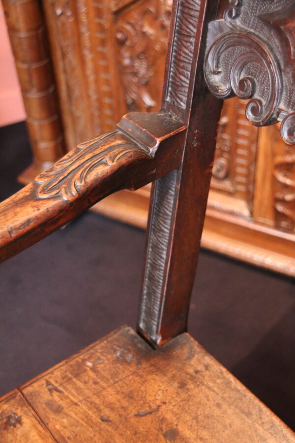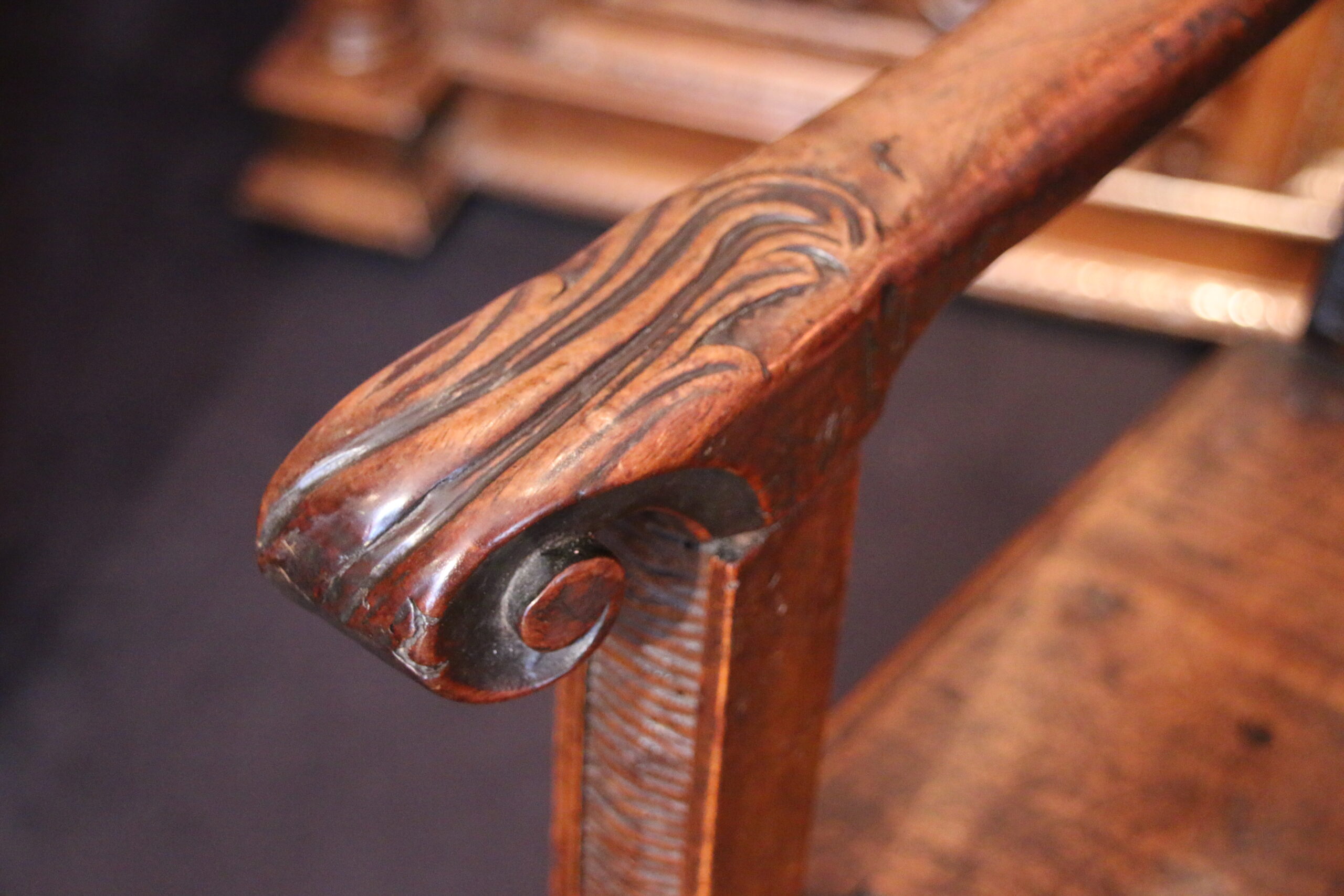 The uprights are decorated with chevrons and the armrests are carved with leaves and finished with a scroll.