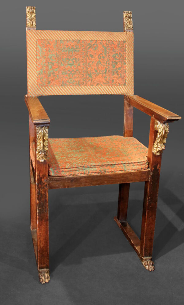 The straight uprights of the backrest are surmounted by gilded plumages. Gilded acanthus leaves in the form of consoles adorn the top of the two front legs, supporting the large flat armrests.