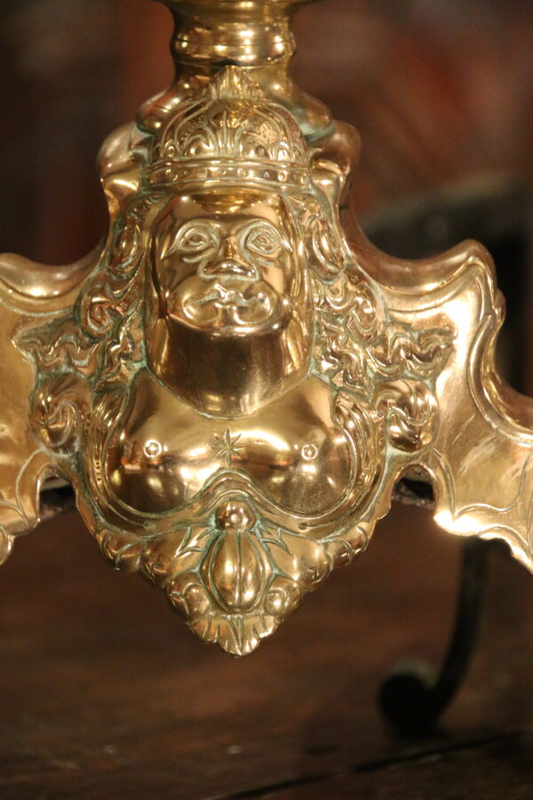 Their decor consists of a female bust crowned supporting an elegant top. On both sides, a fantastic animal with an open mouth coils on its own scales body.