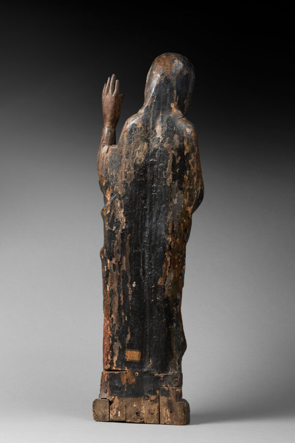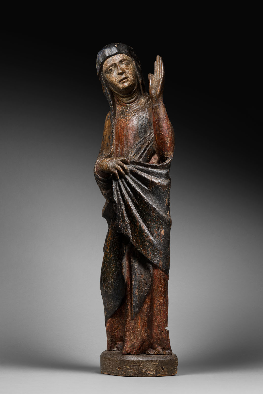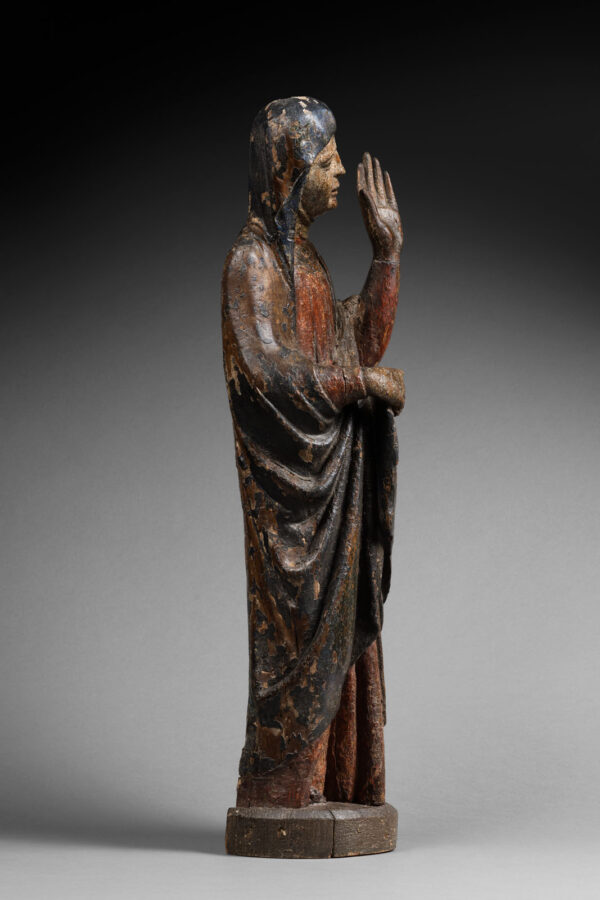 This rare sculpture of a Virgin of Calvary originally belonged to an ensemble depicting the Crucifixion. The Virgin would be accompanied by a sculpture of the apostle John, both flanking the Christ. Depictions of Joseph of Arimathea and Nicodemus could complete the ensemble.