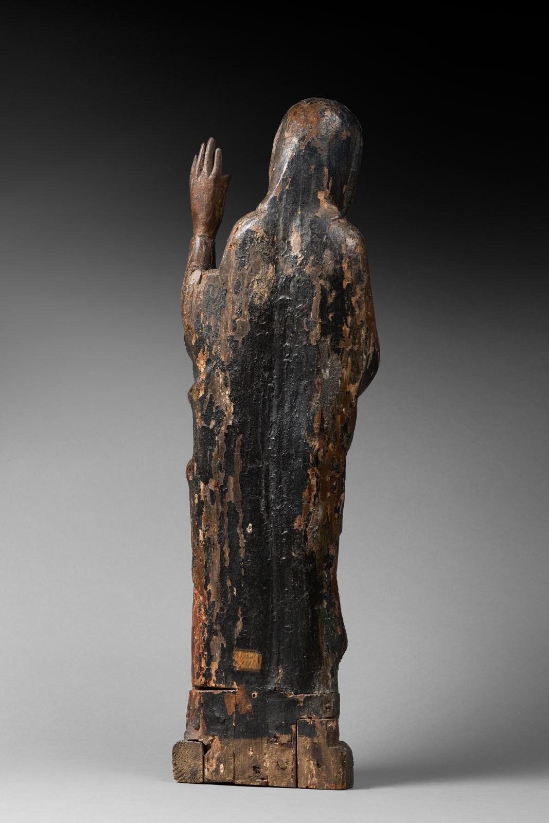 This pensive Virgin, humble and delicate with her realistic features shows a new spirit in sculpture that would then evolved towards Gothic. Her long fingers, the curved folds of her cloak locate this artwork at the crossroad of the Romanesque and Gothic periods. The Virgin of Calvary is a remarkable example of the work of Italian sculptors from the third quarter of the 13th century.