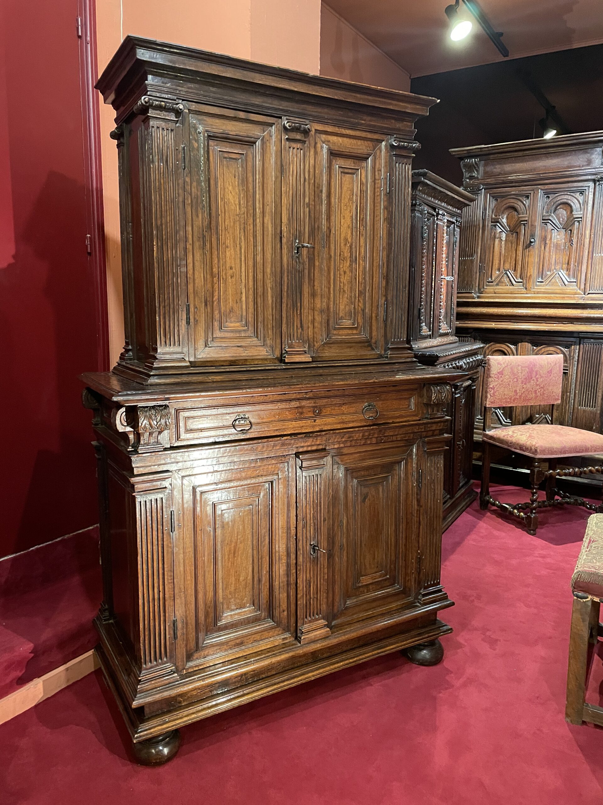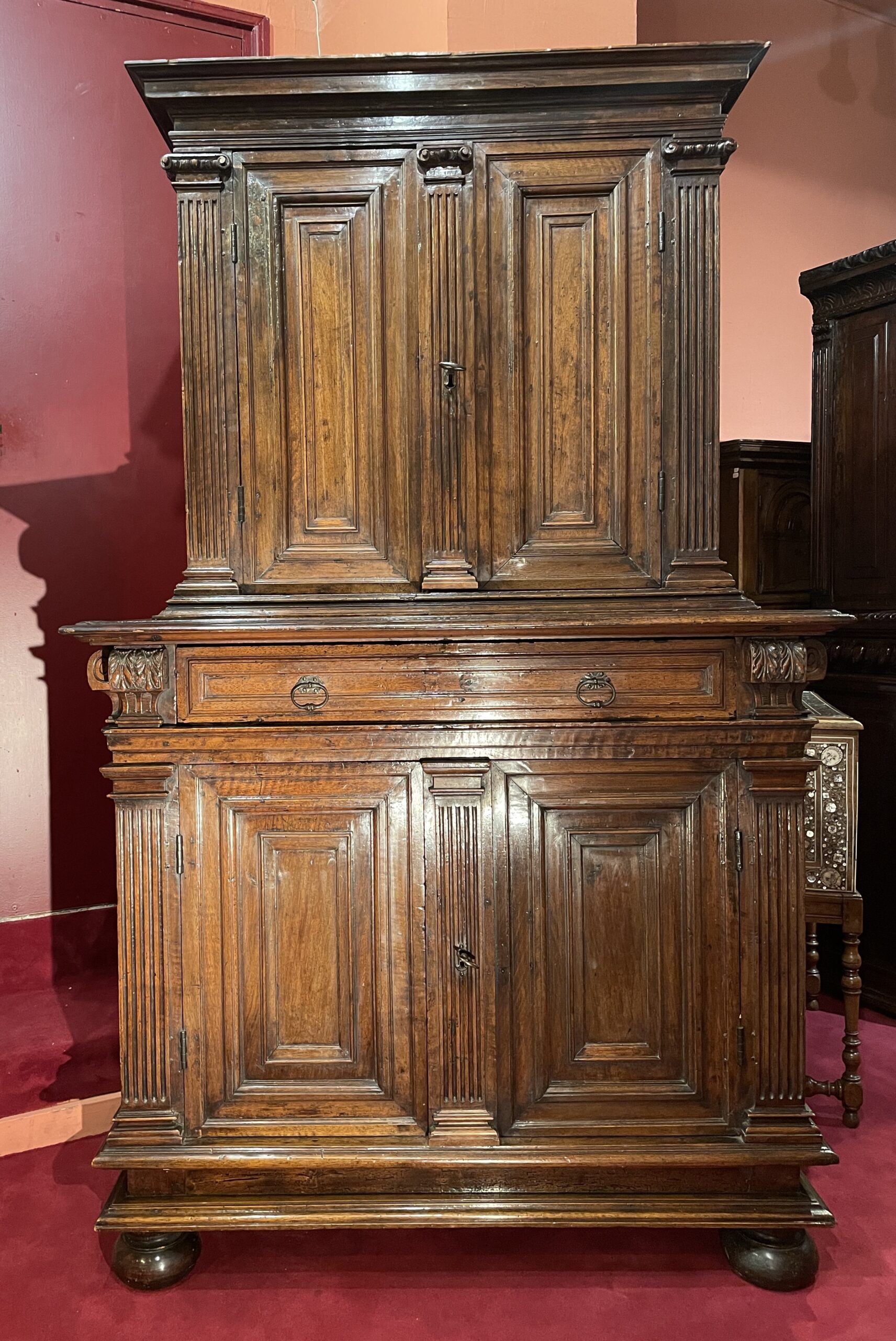 This small cabinet opens with four door-leaves. It presents a great unity and sobriety in its ornamentation comprising mainly moulded panels incorporated in the structure. Grooved pilasters with Doric capitals for the lower body and Ionic capitals for the upper body divide the facade. In the belt can be found a unique drawer, framed by two consoles adorned with an Acanthus leaf sculpted with great talent.