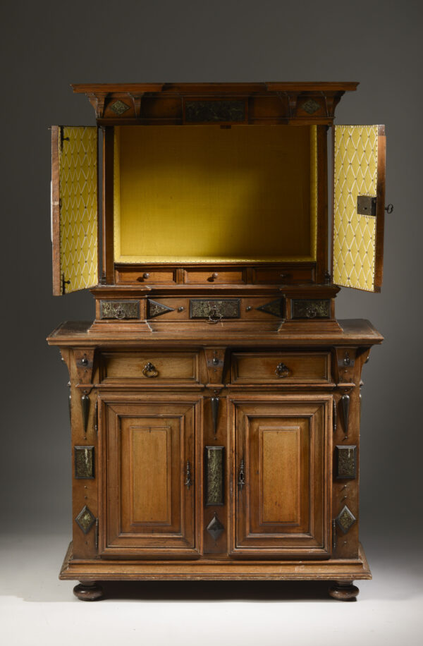 In between the top and the bottom parts, two drawers are separated by consoles soberly decorated with a blackened wood button and under which is also applied a long blackened wood drop.