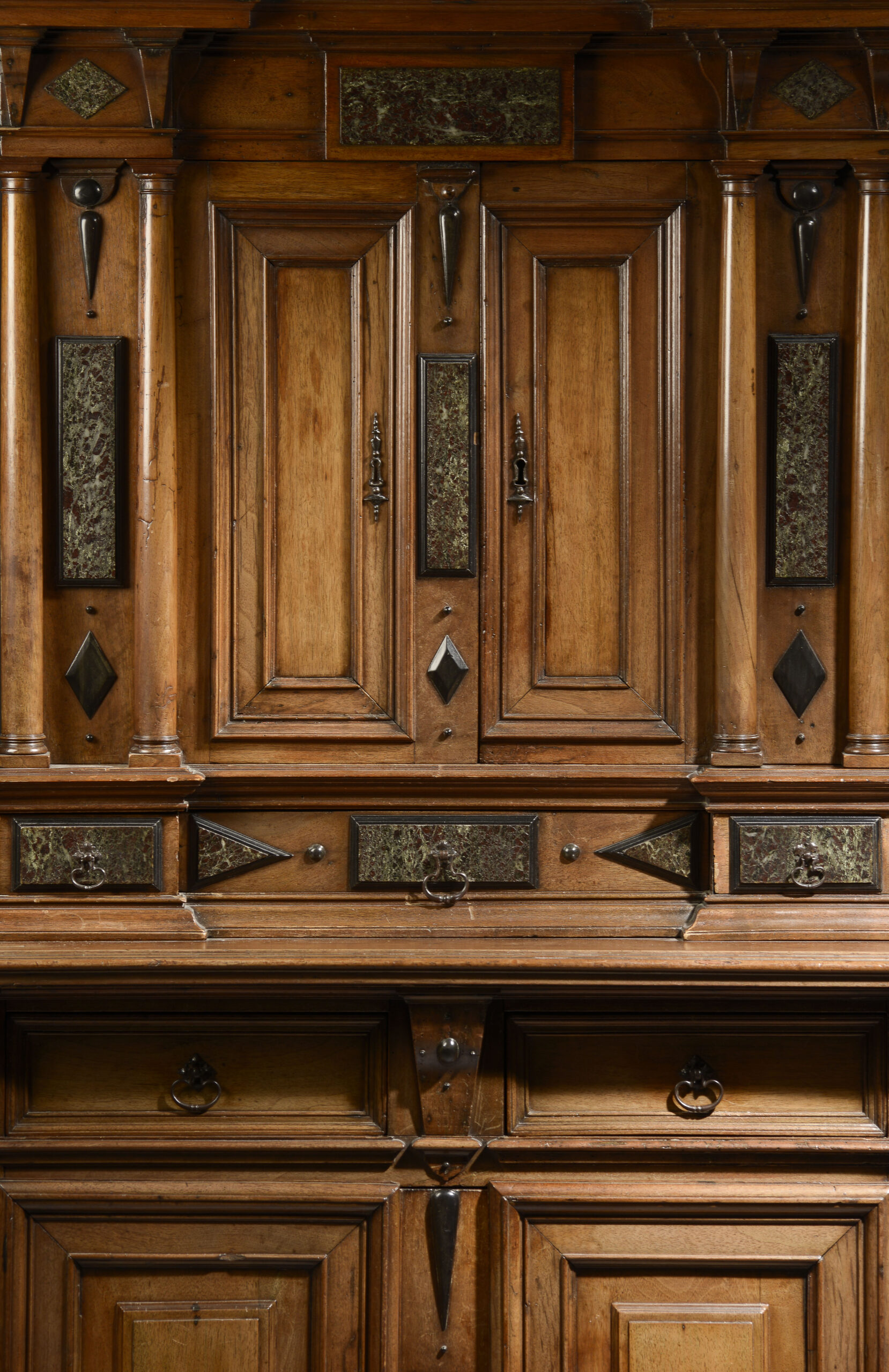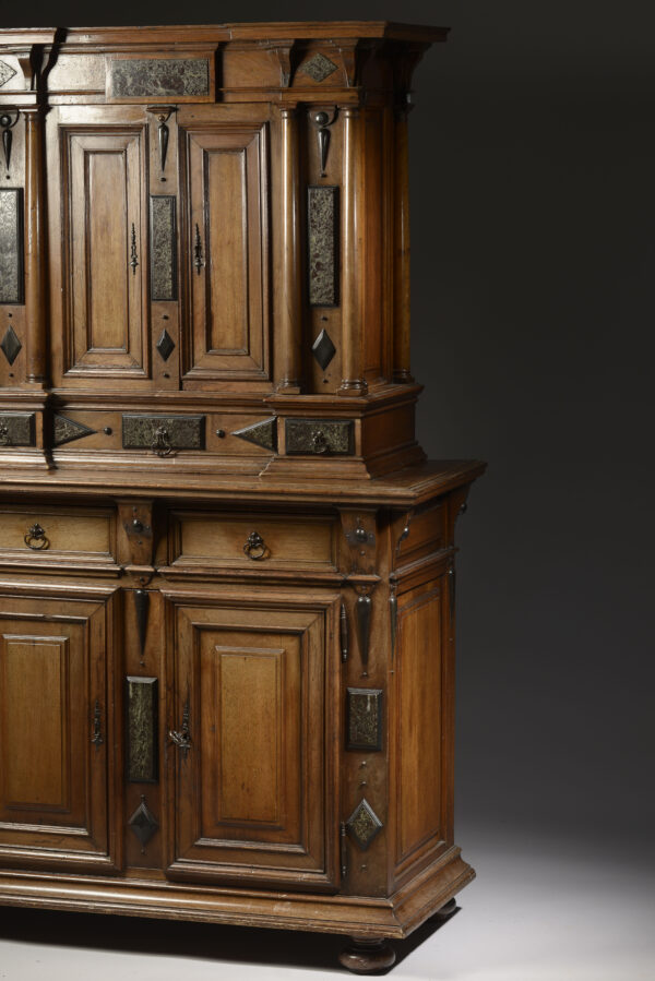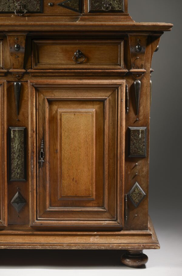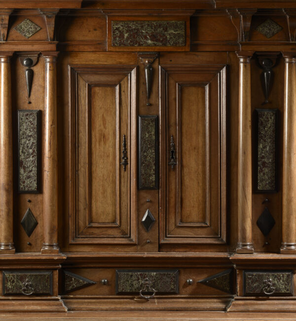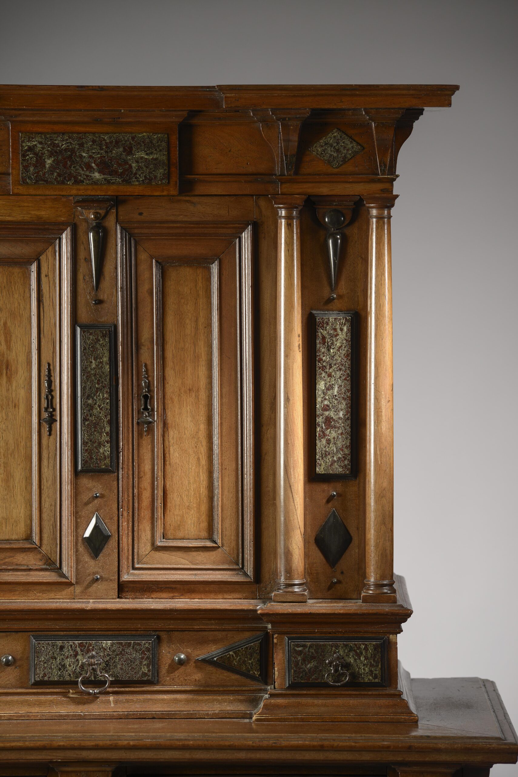 This cabinet is finished by an entablature alterning console and marble plates.