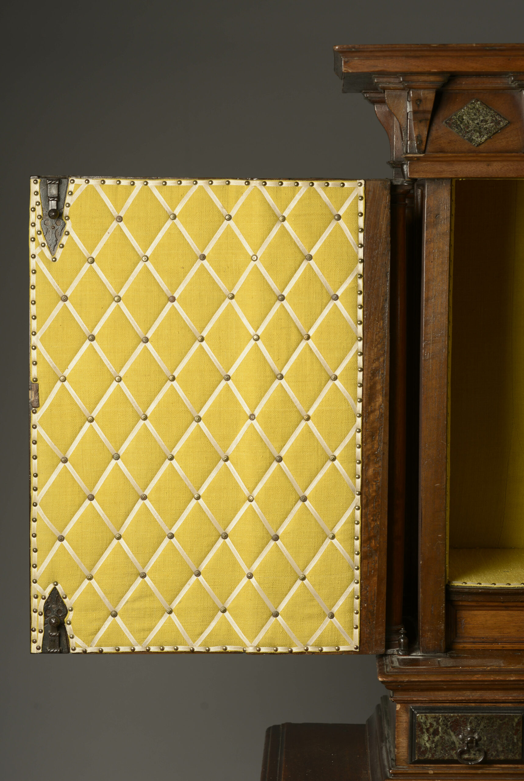 The furniture’s interior is covered with yellow silk stretched with studded braids.